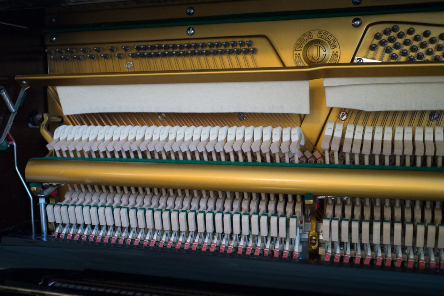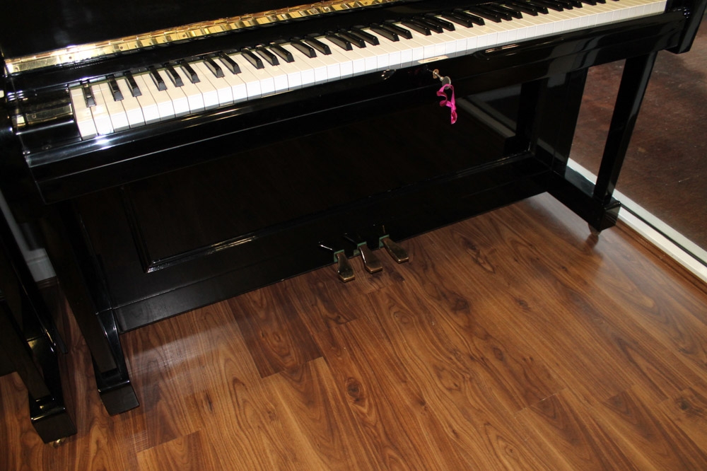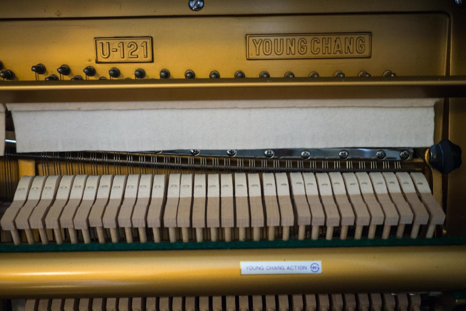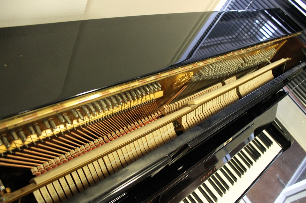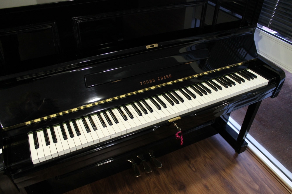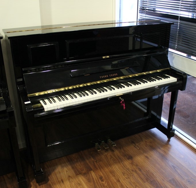 Young Chang (c1987) A Model U-121 upright piano in a bright ebonised case; together with a duet stool. AMENDMENT Is together with a single stool.