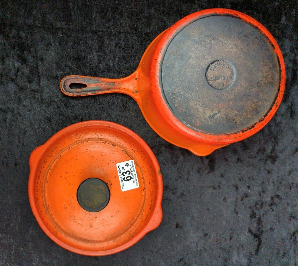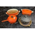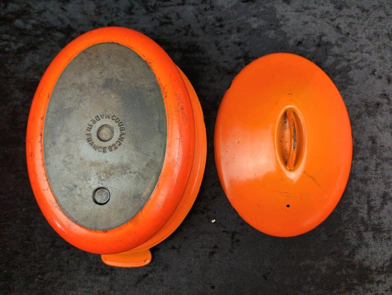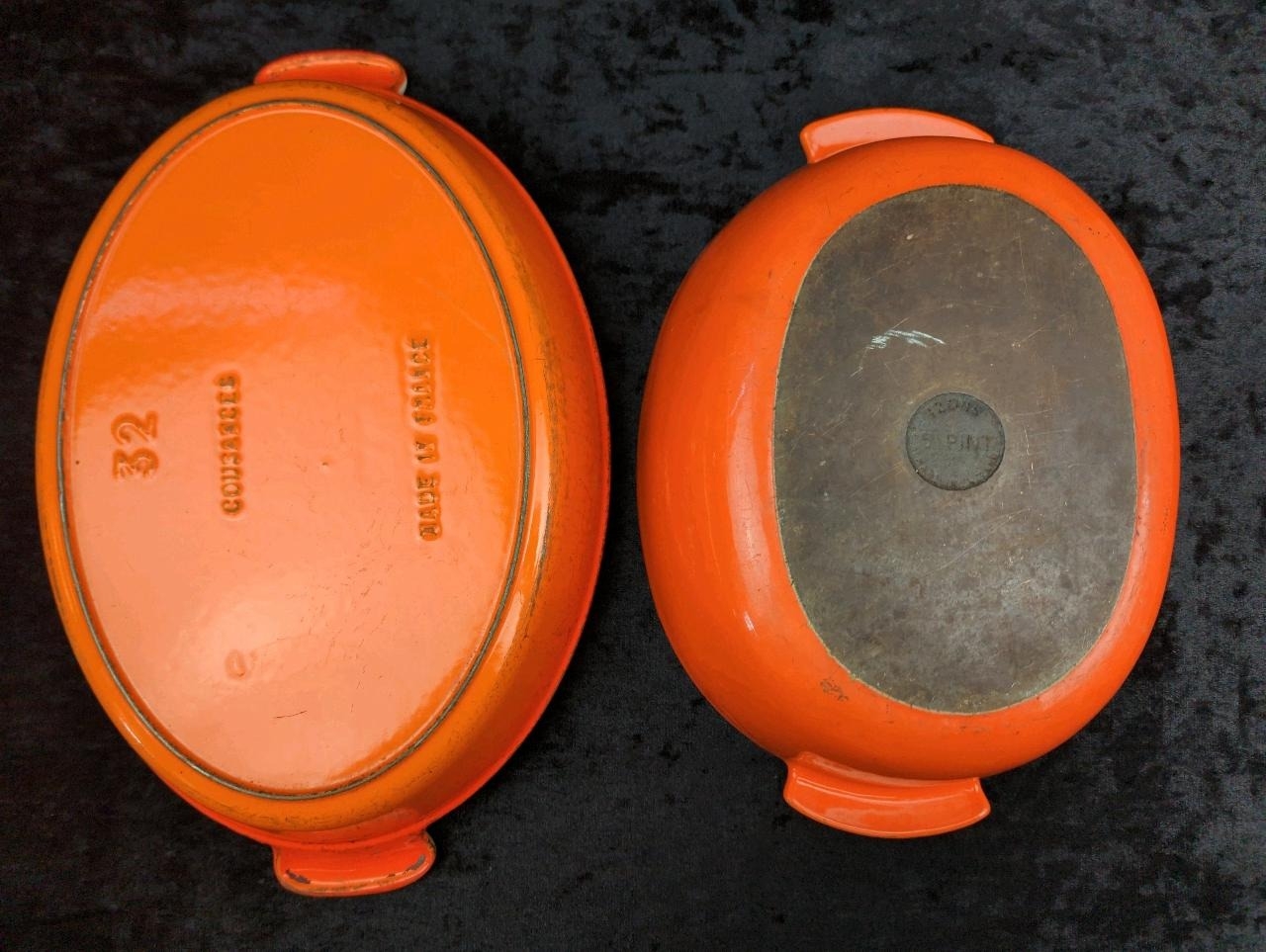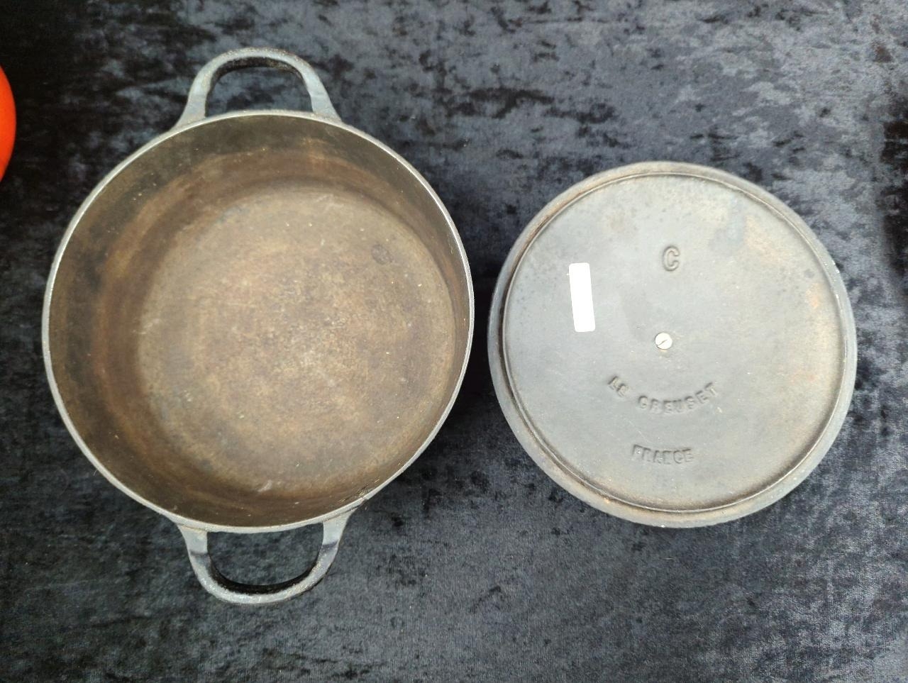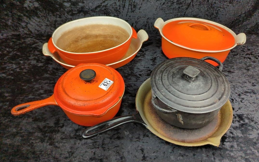 Collection of vintage 1970s Le Creuset dishes, pans, saucepans including Volcanic and Black. All with signs of wear.