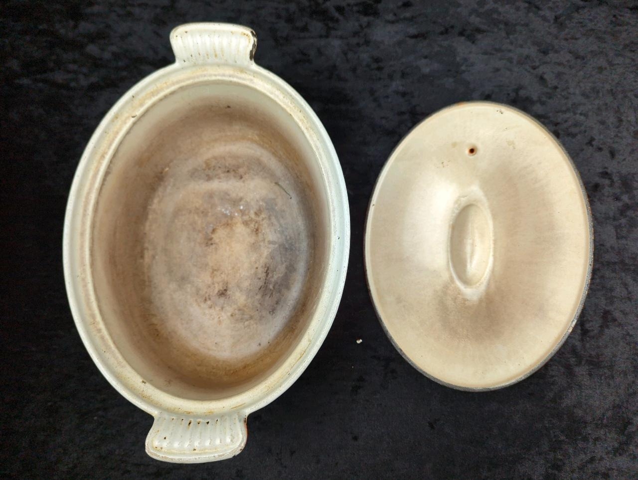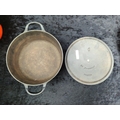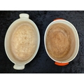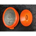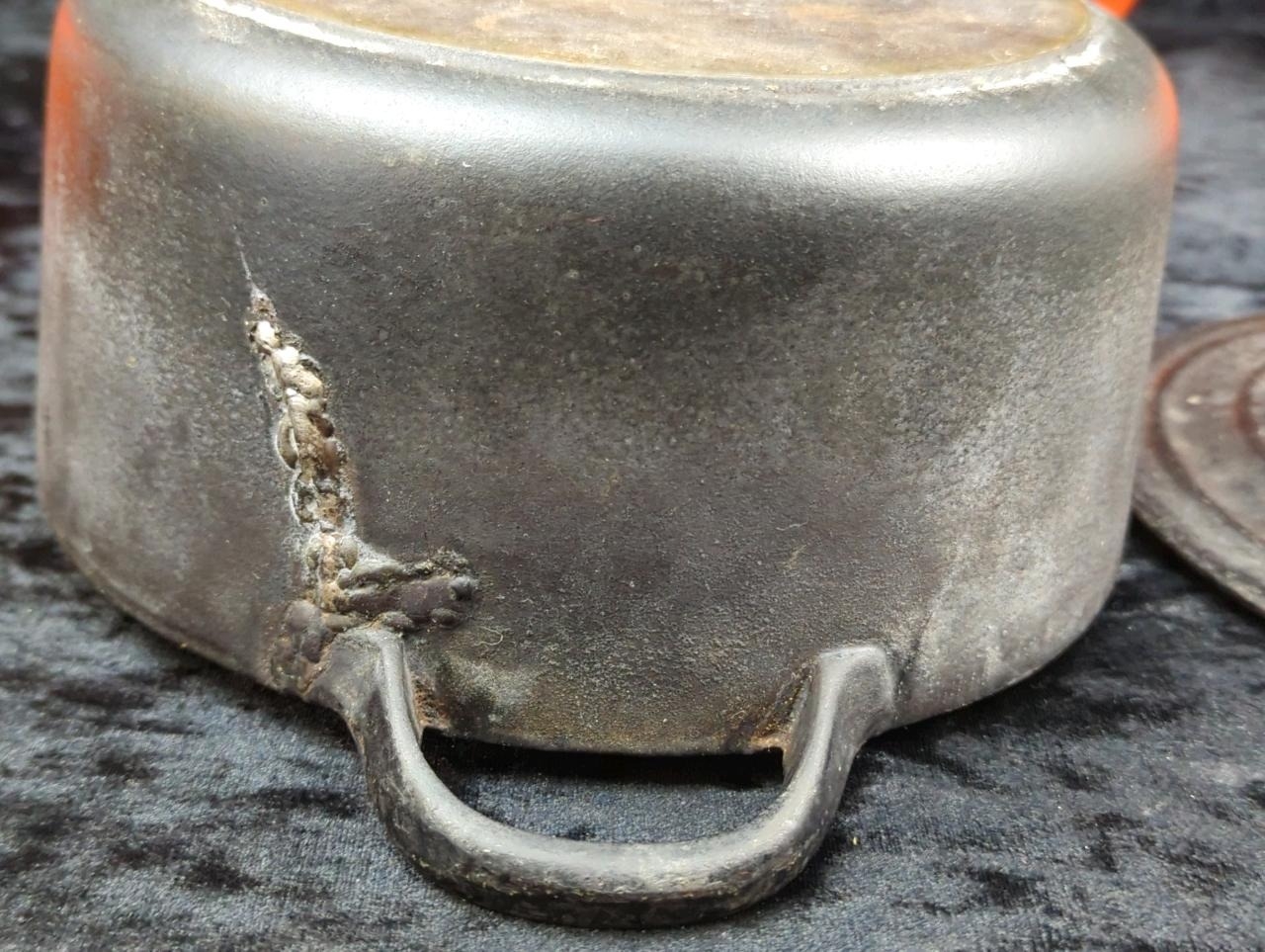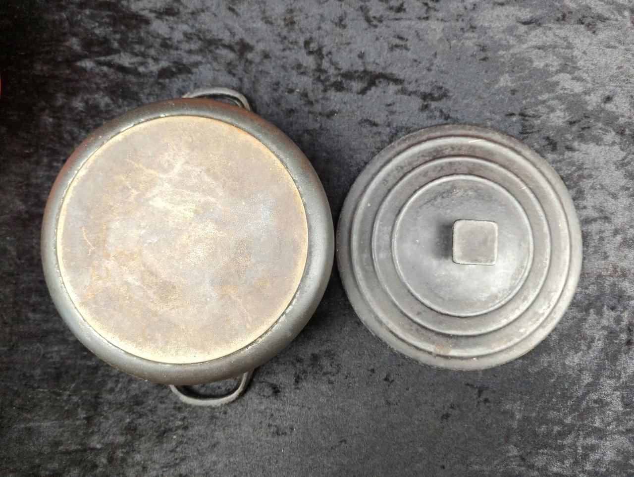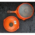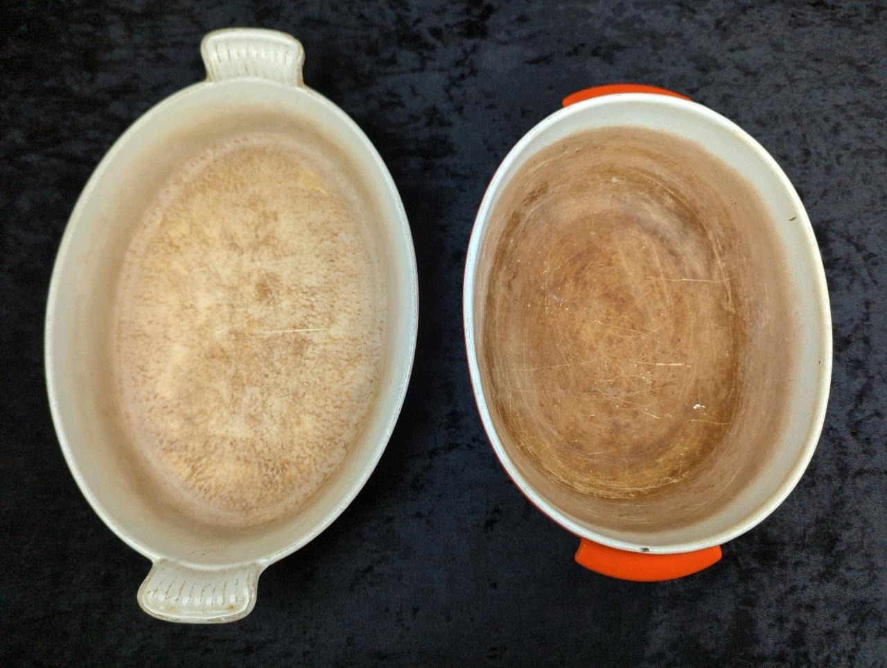 Collection of vintage 1970s Le Creuset dishes, pans, saucepans including Volcanic and Black. All with signs of wear.