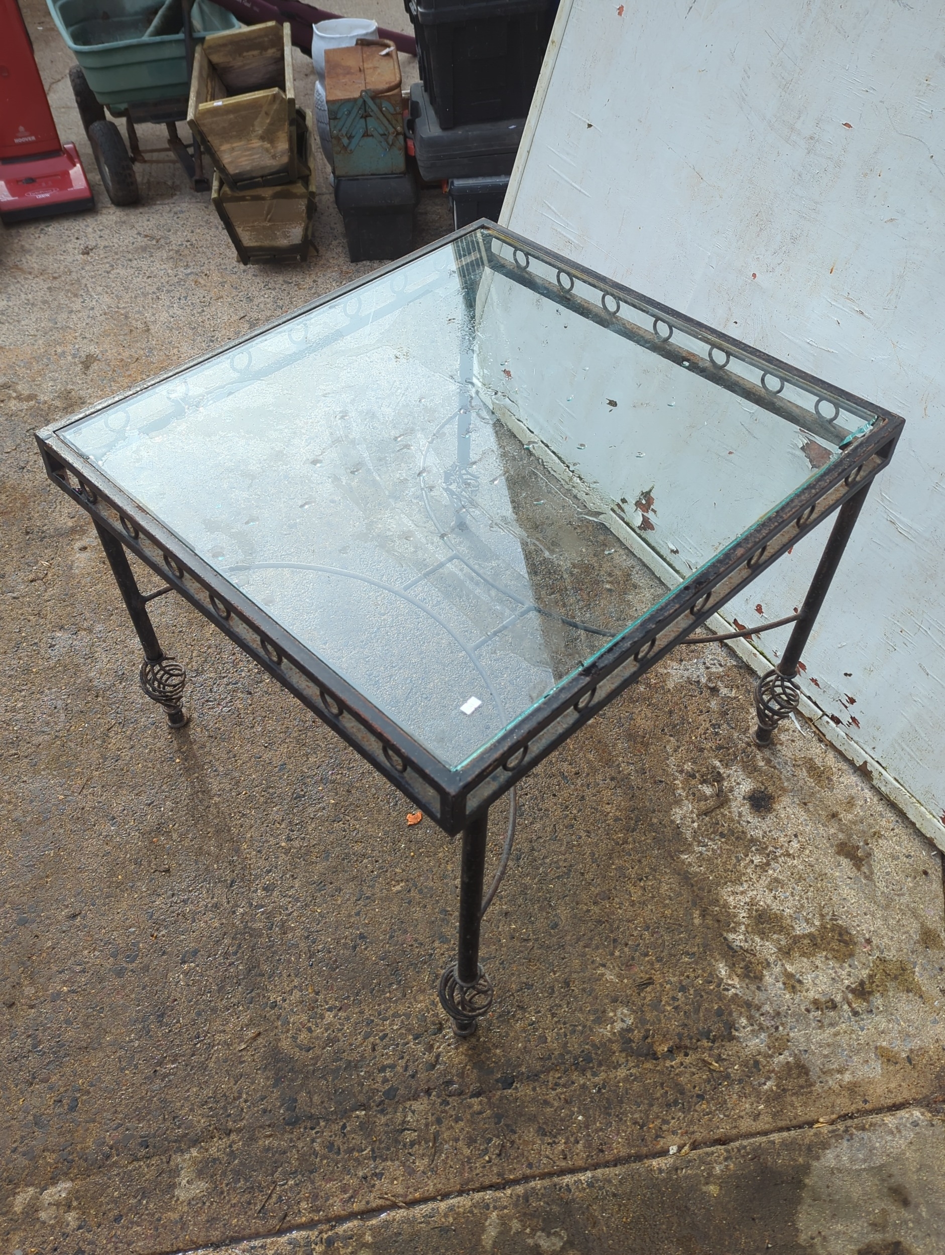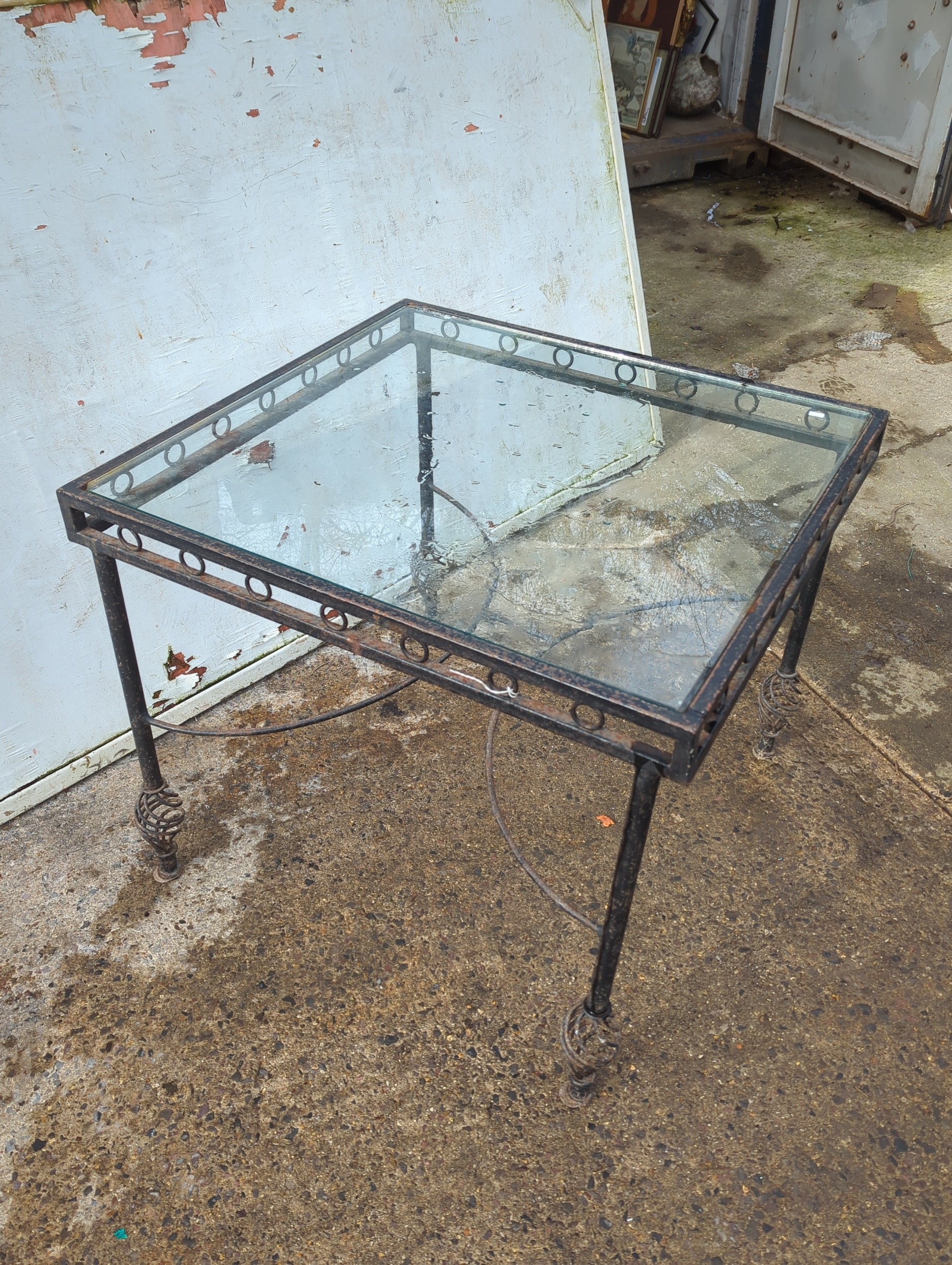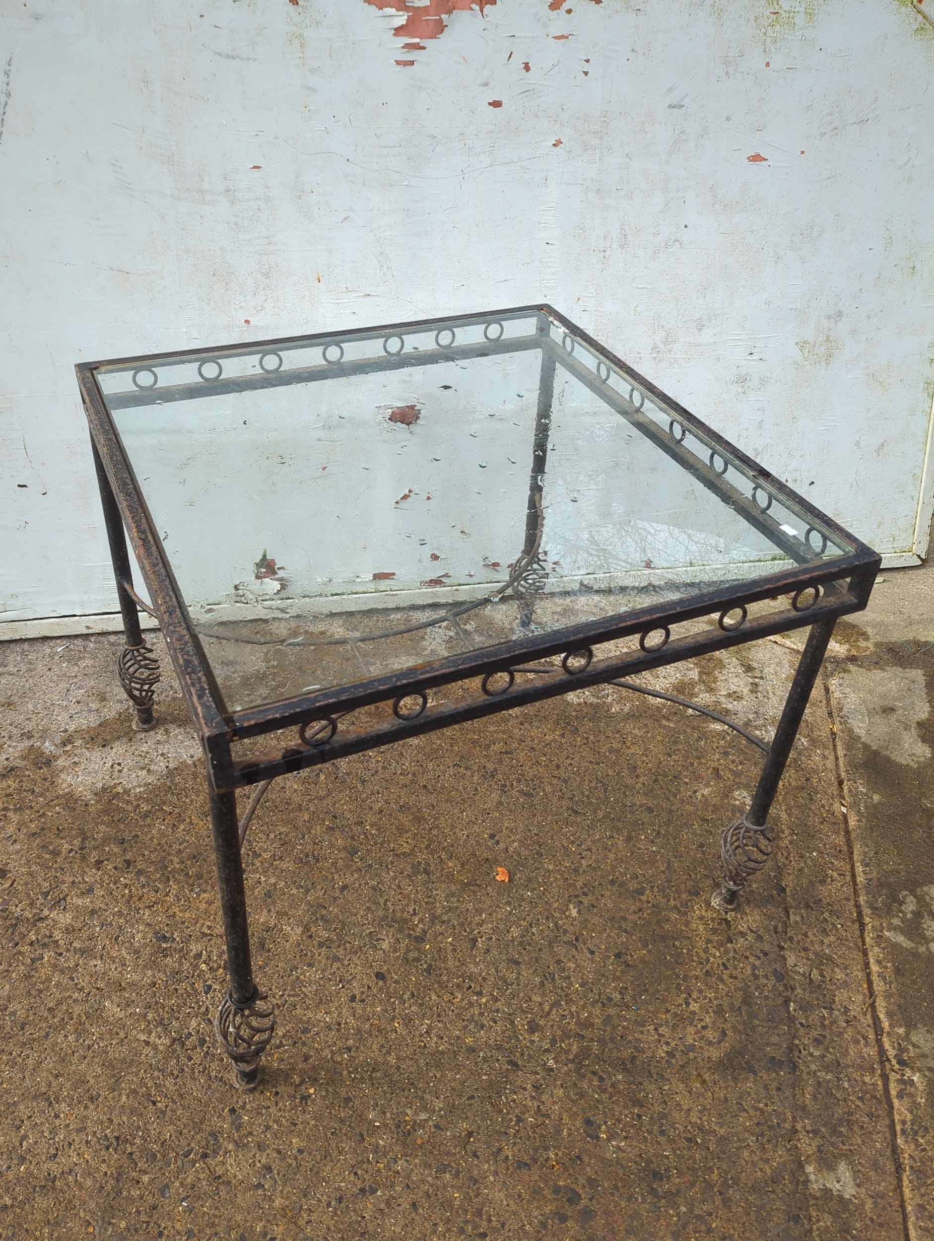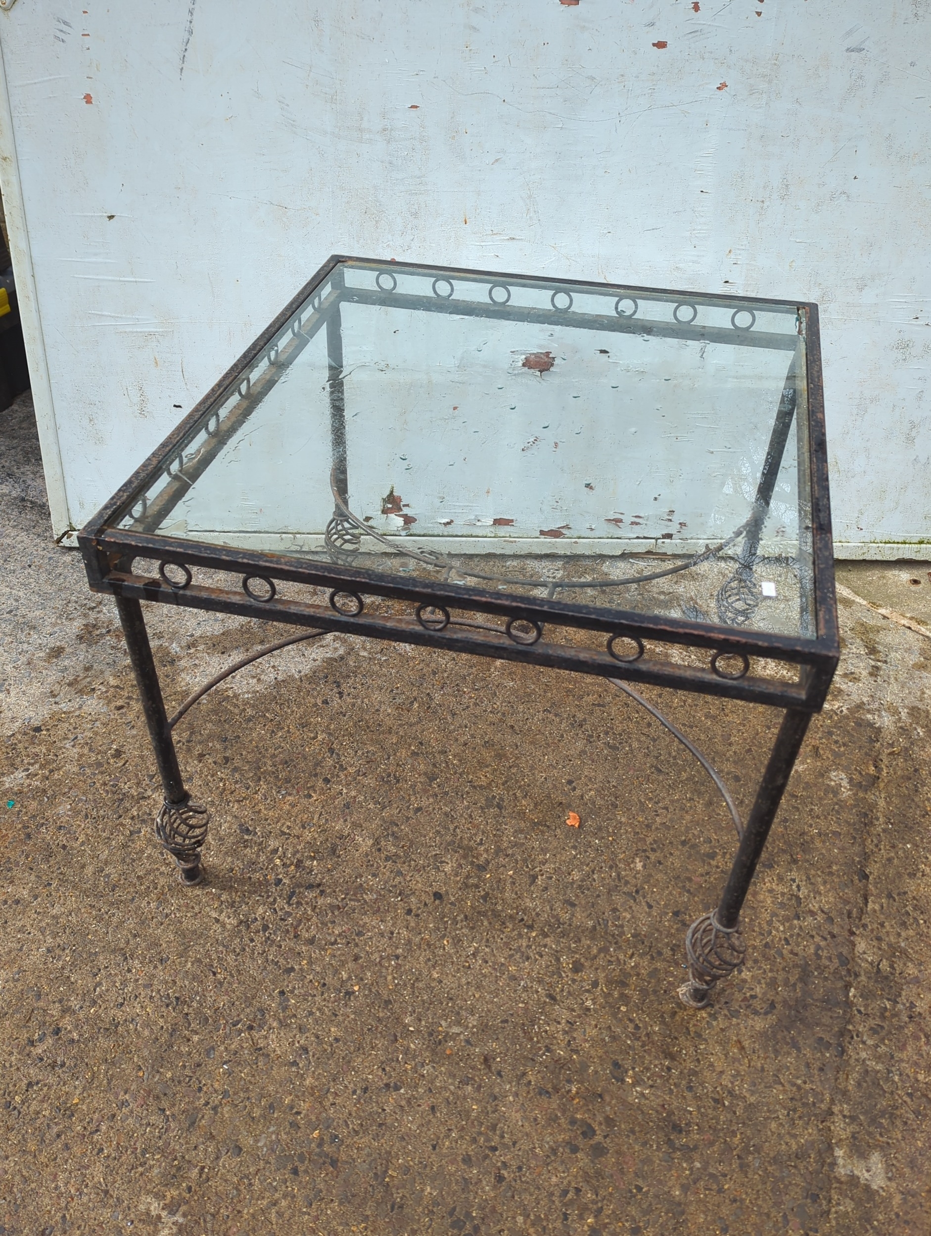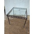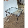 This piece is a glass-top side table featuring a metal frame with decorative elements. The frame has a circular motif around the perimeter and slender legs with swirled finial details. The table is suitable for use in various room settings, providing both style and functionality.