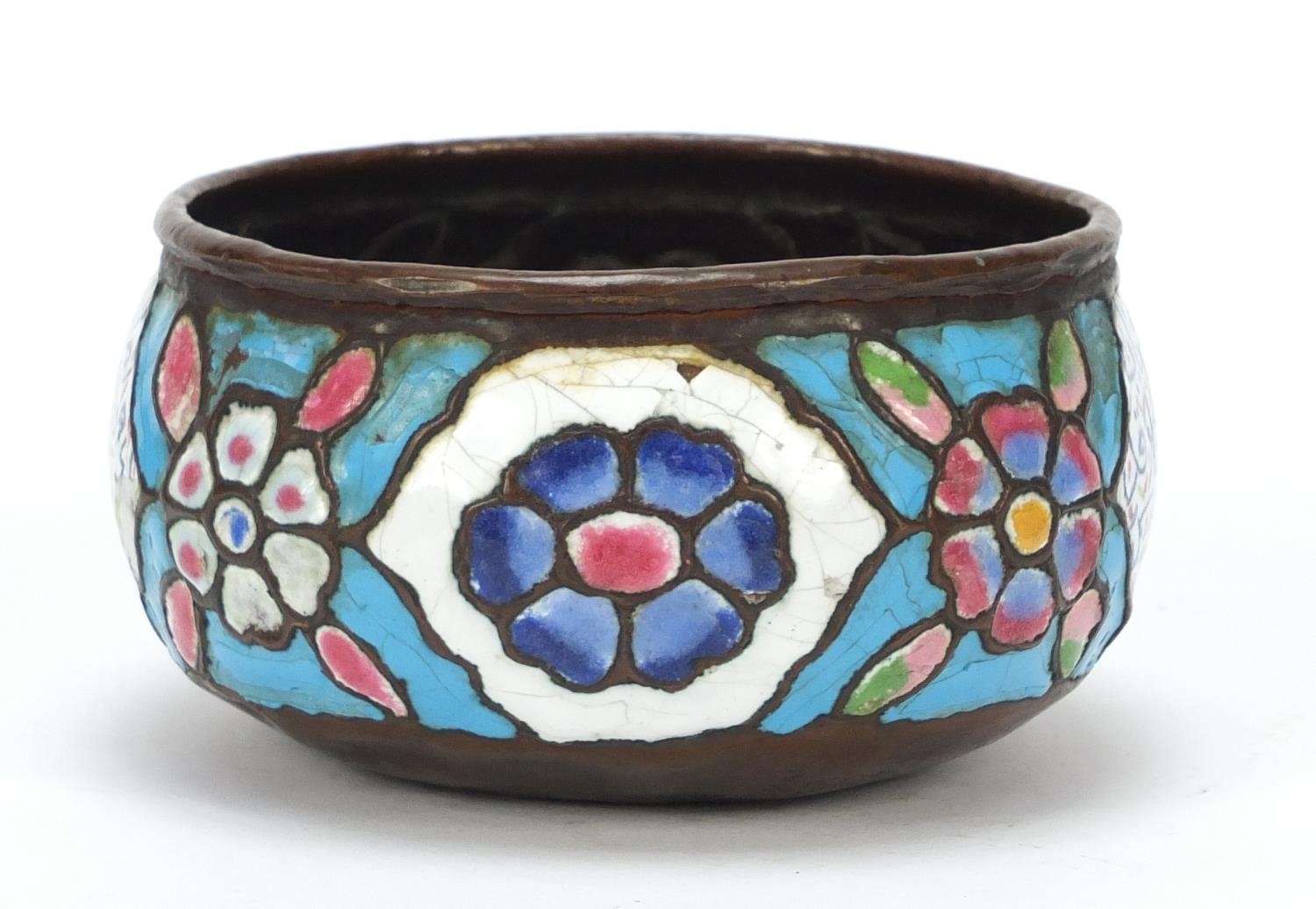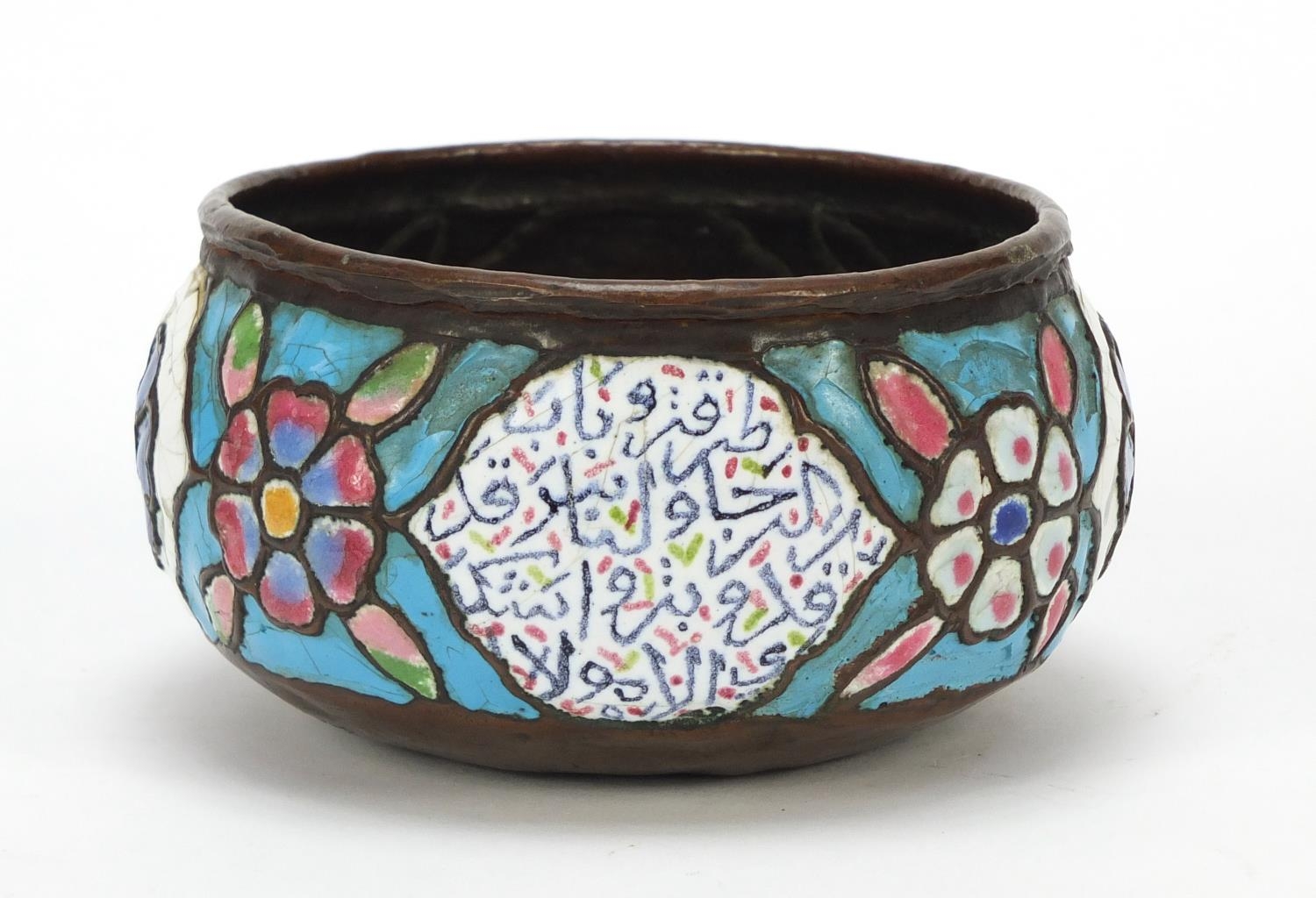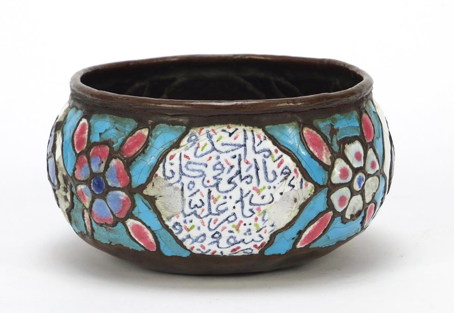 Antique Syrian enamelled Kashkul begging bowl, decorated with flower heads and calligraphy, 12.5cm in diameter