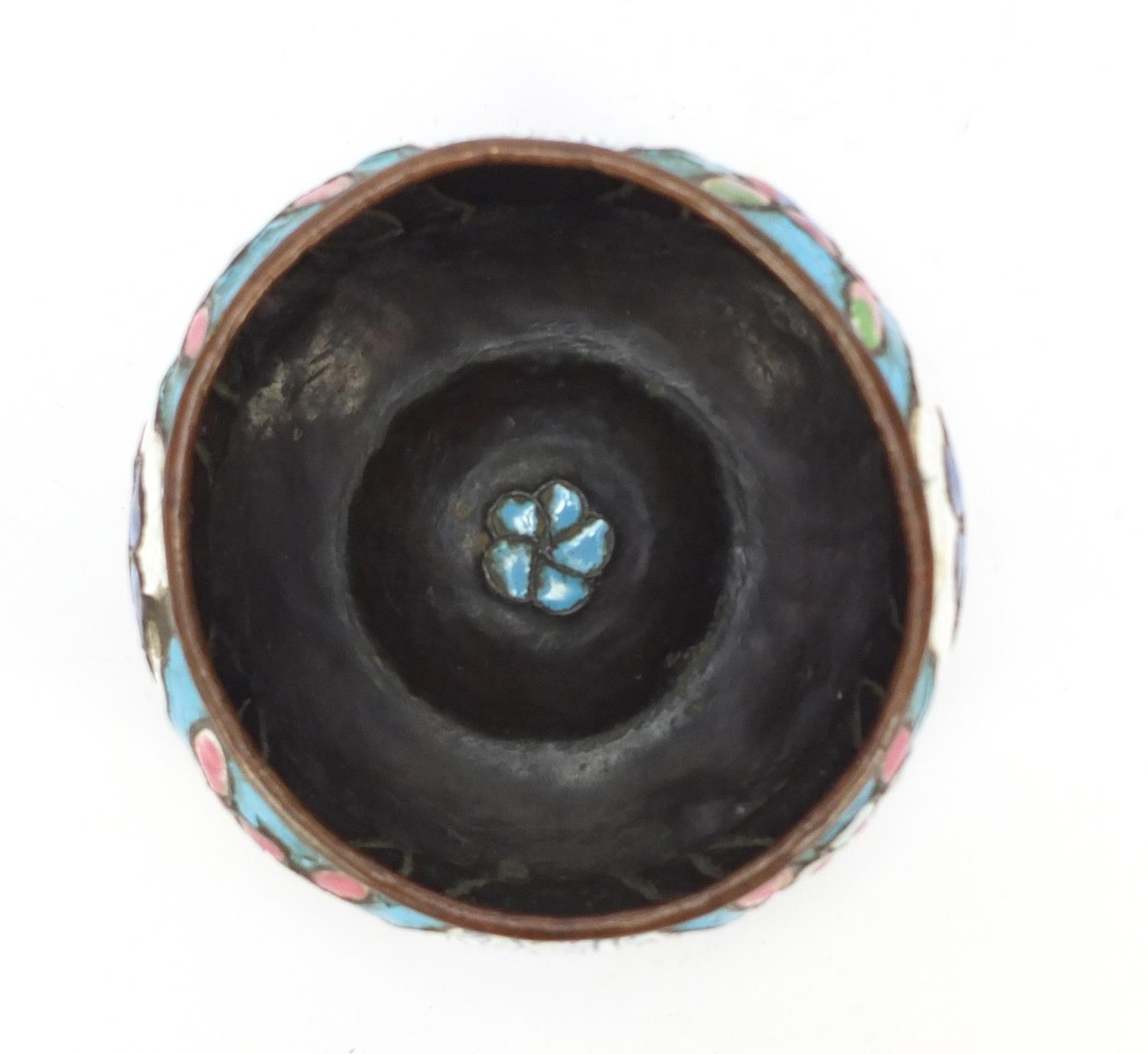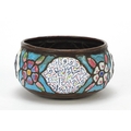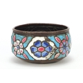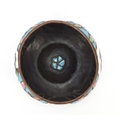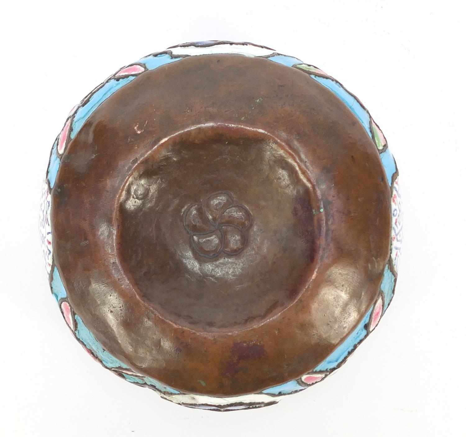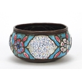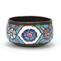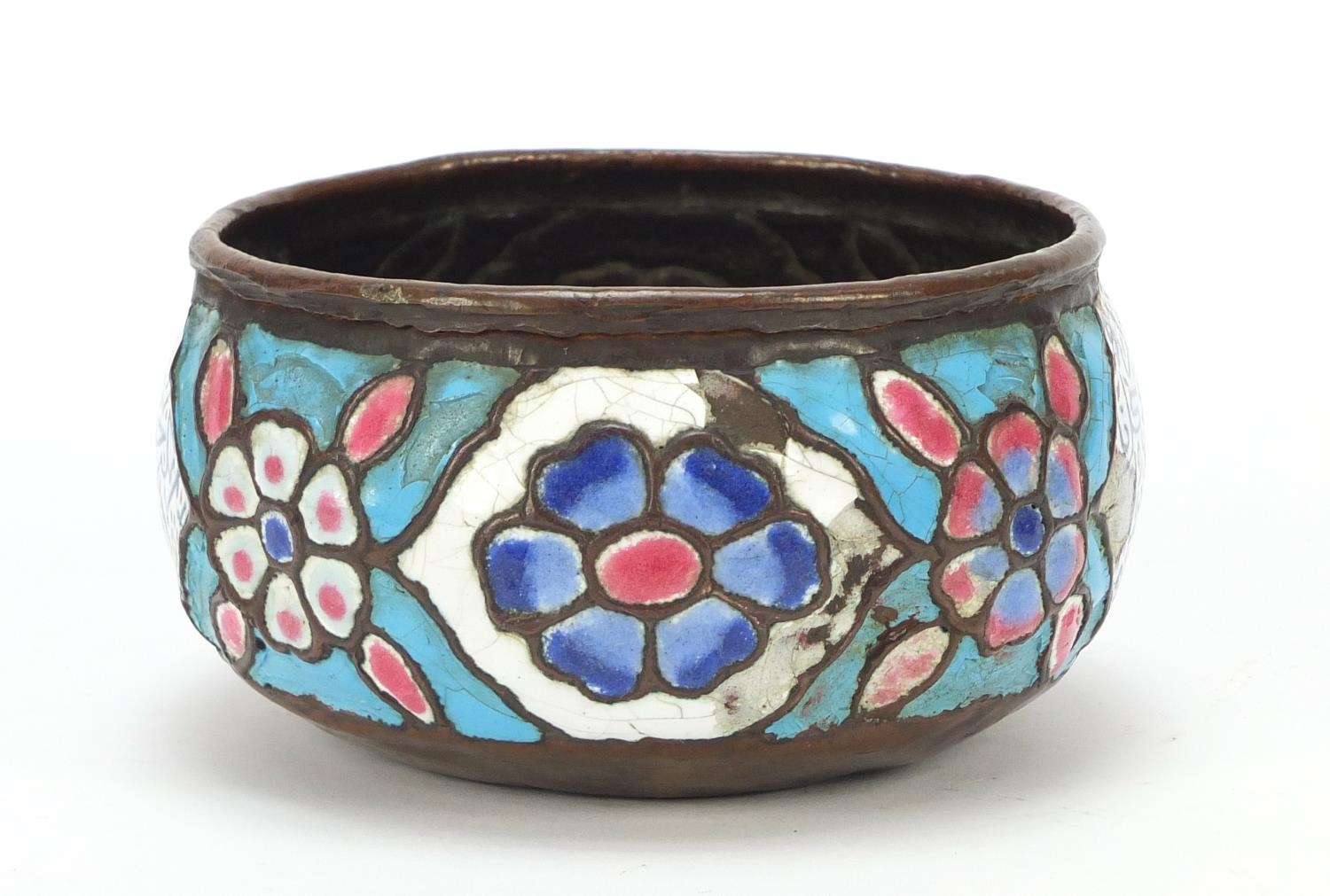Antique Syrian enamelled Kashkul begging bowl, decorated with flower heads and calligraphy, 12.5cm in diameter