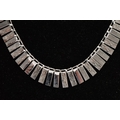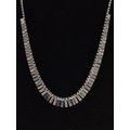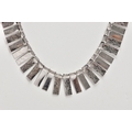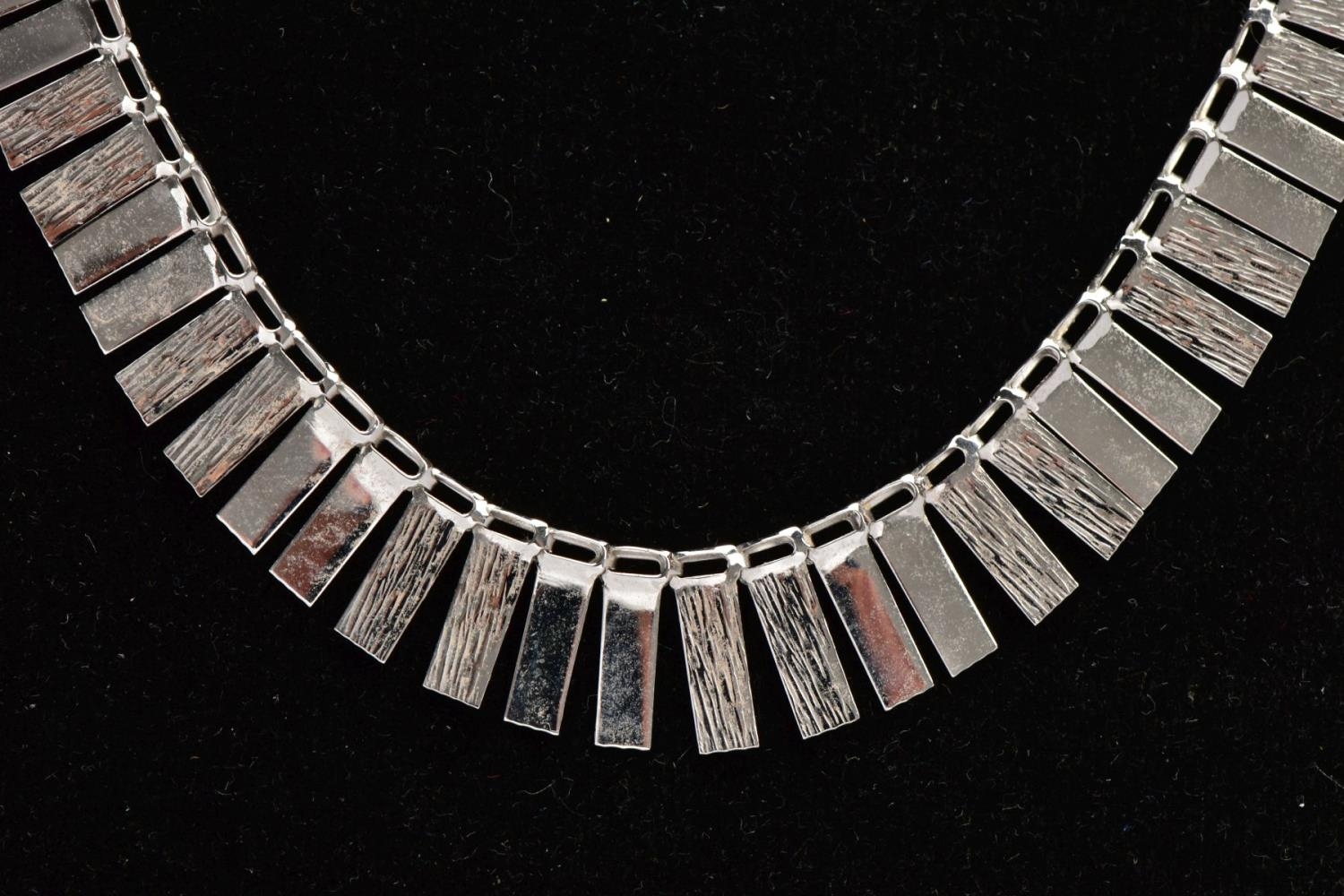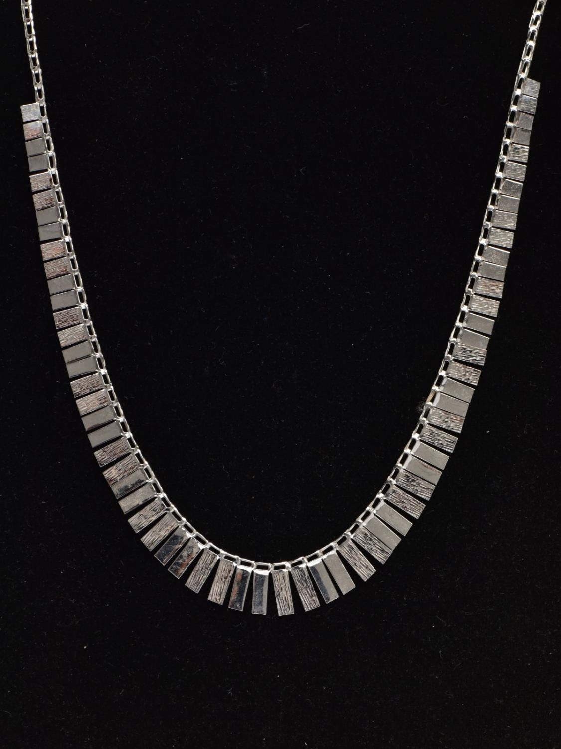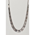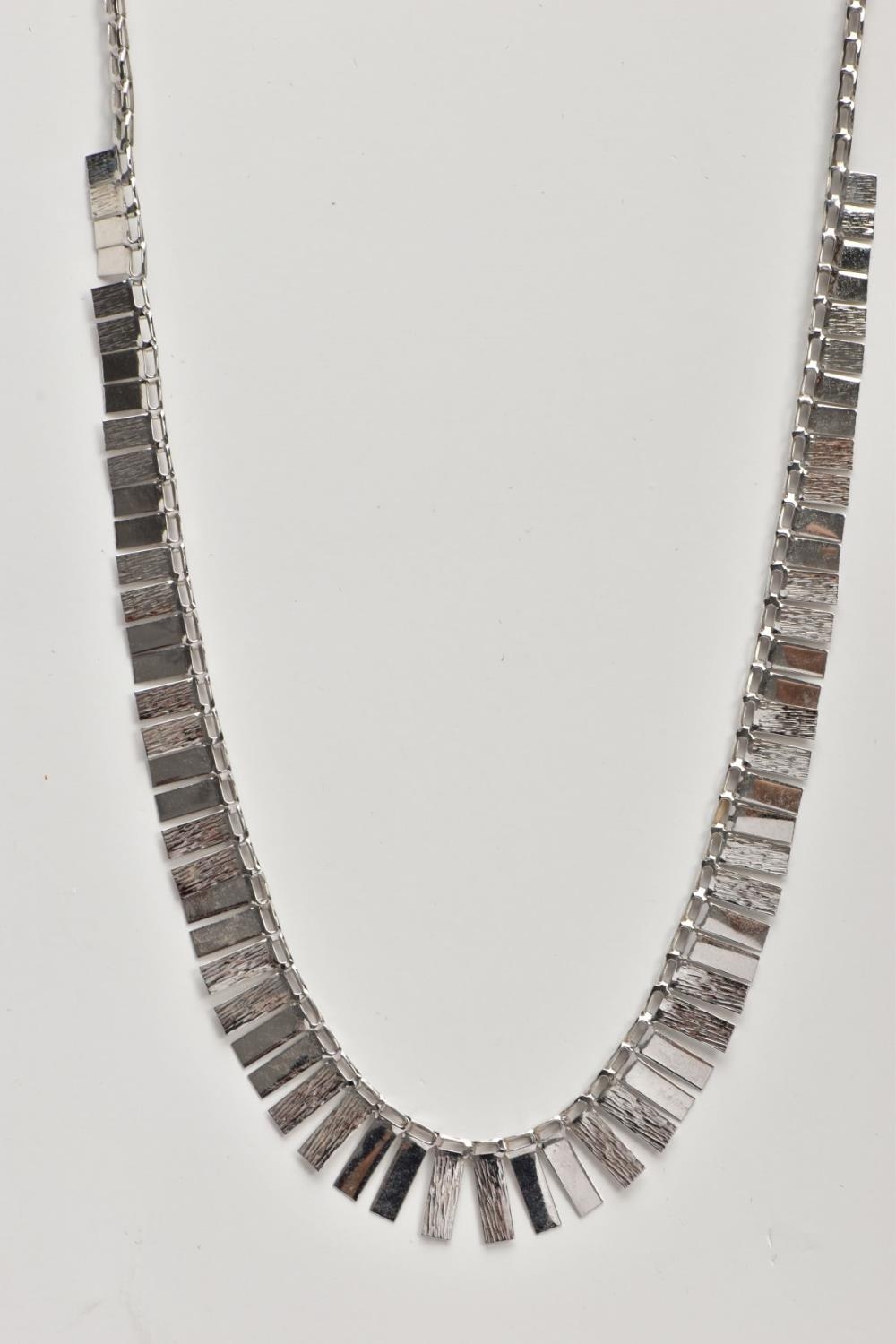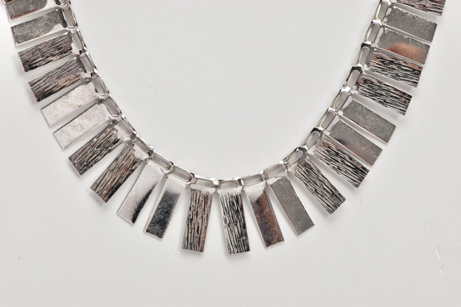 A WHITE METAL COLLAR STYLE NECKLACE, featuring a graduated fringe, with intermittent bark effect and plain polished bars, fitted with a base metal chain adjuster with spring clasp and a barrel screw clasp (base metal), one piece near the spring clasp has a 9ct gold Birmingham hallmark the rest is unmarked, length 550mm, approximate total gross weight 7.9 grams (condition report: general light wear, appears to have had previous adjustments to chain length)