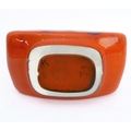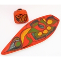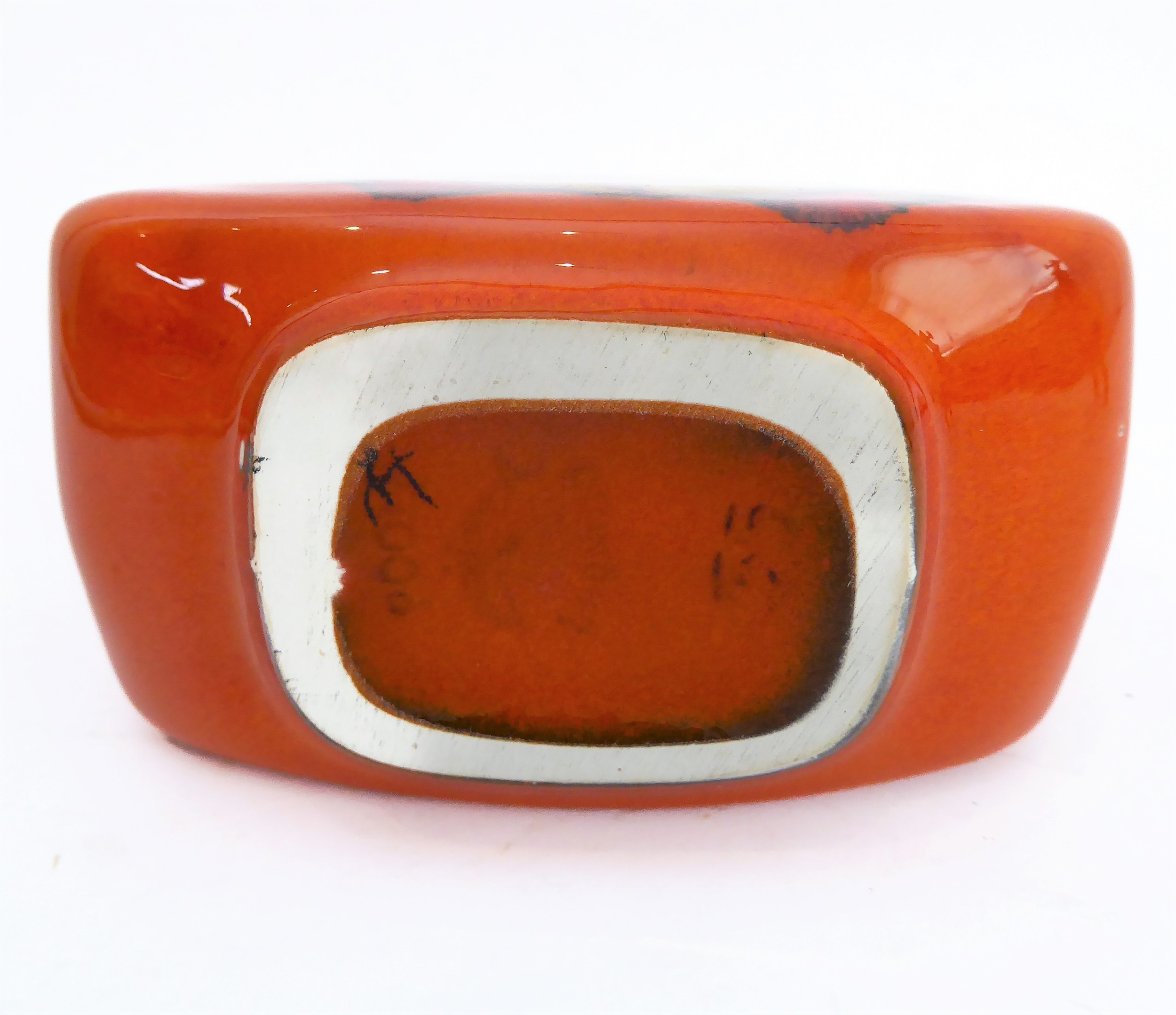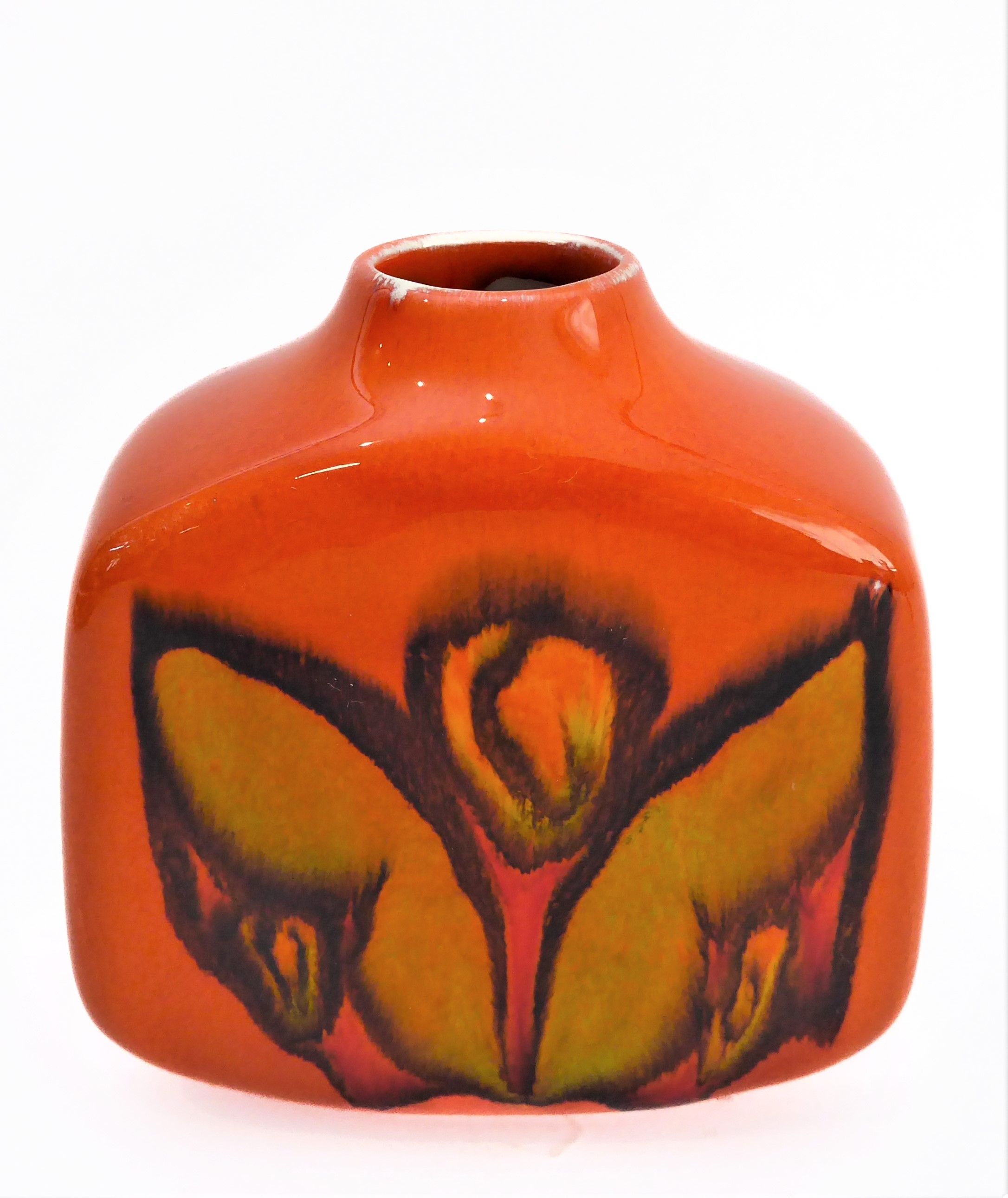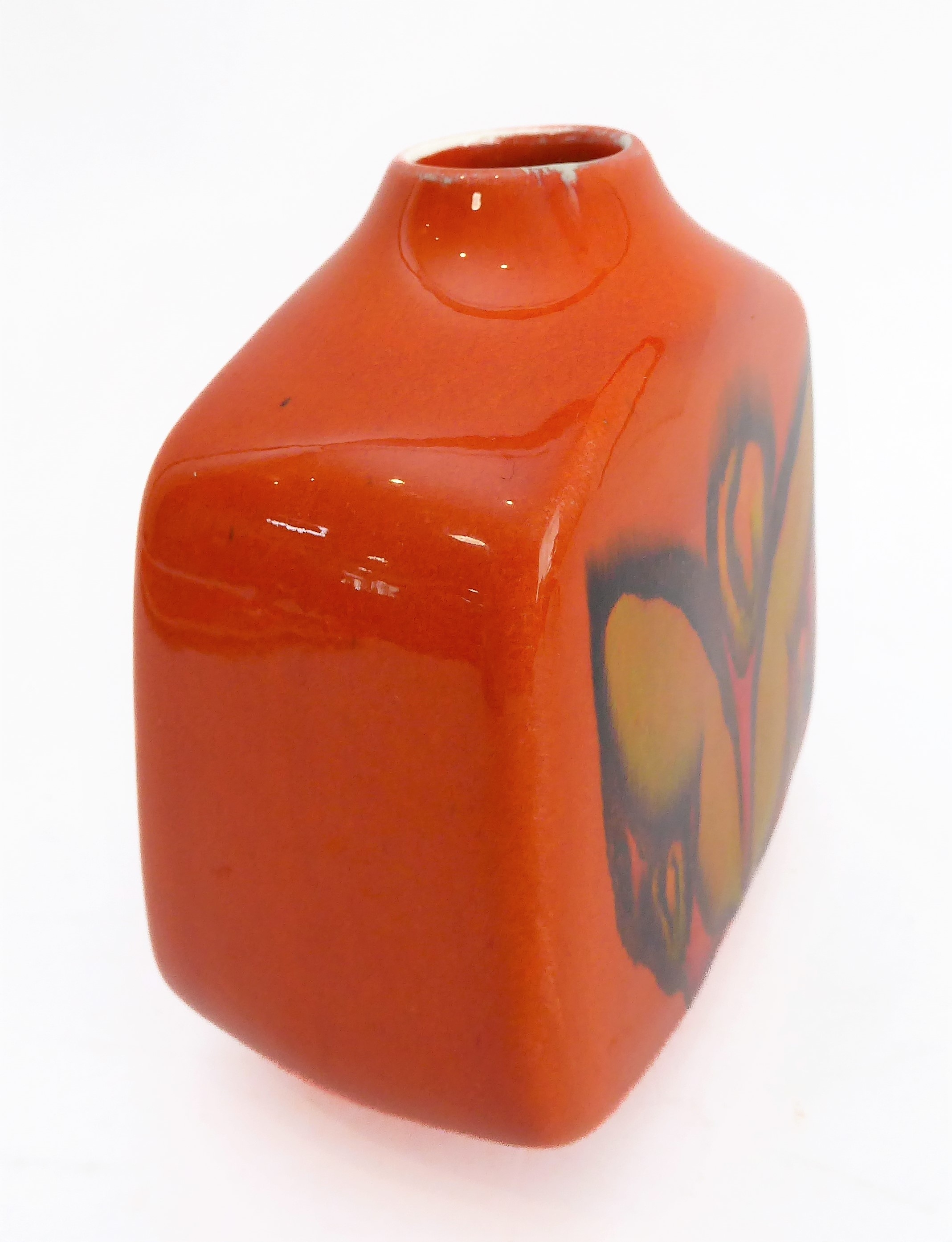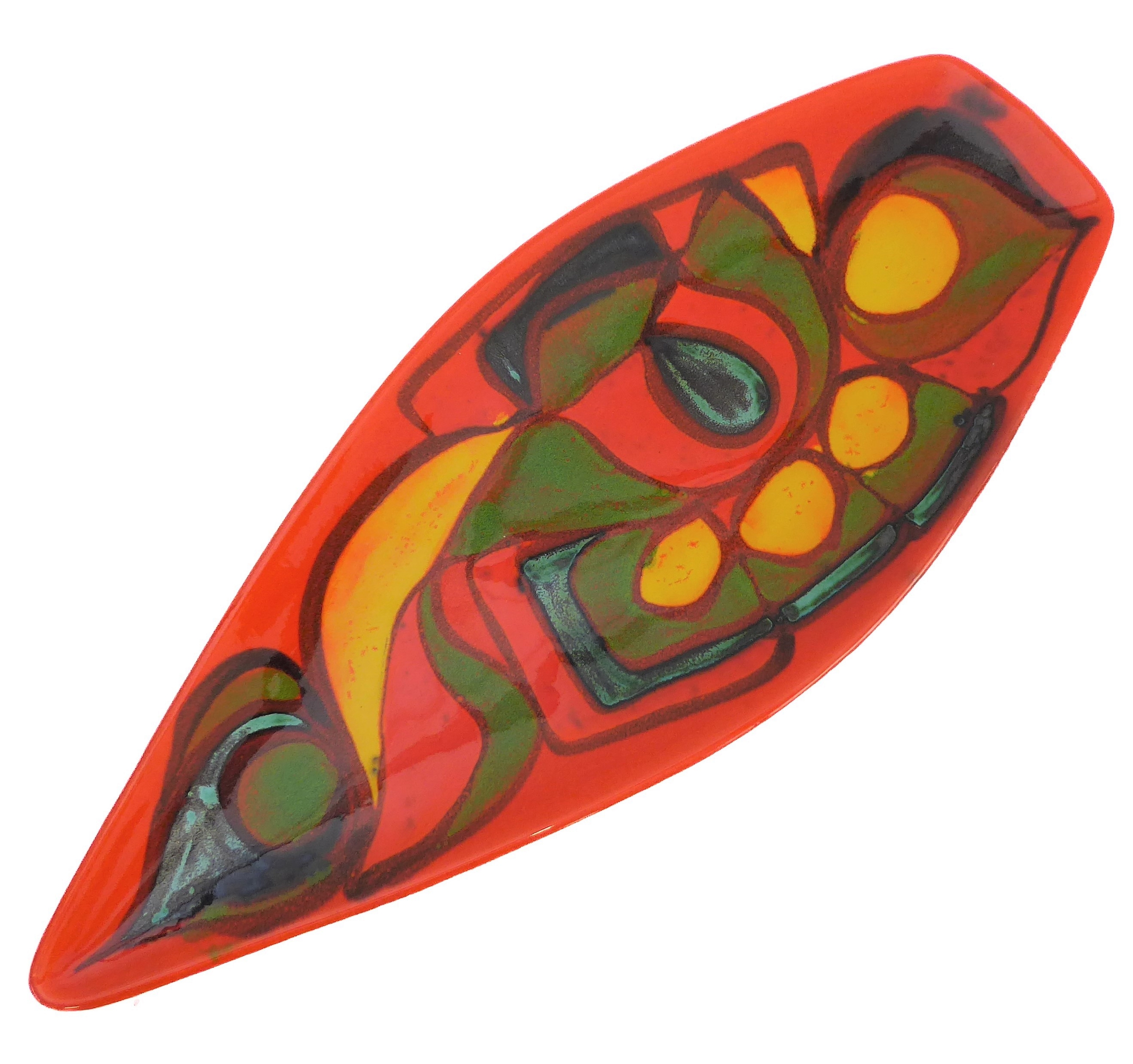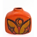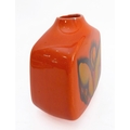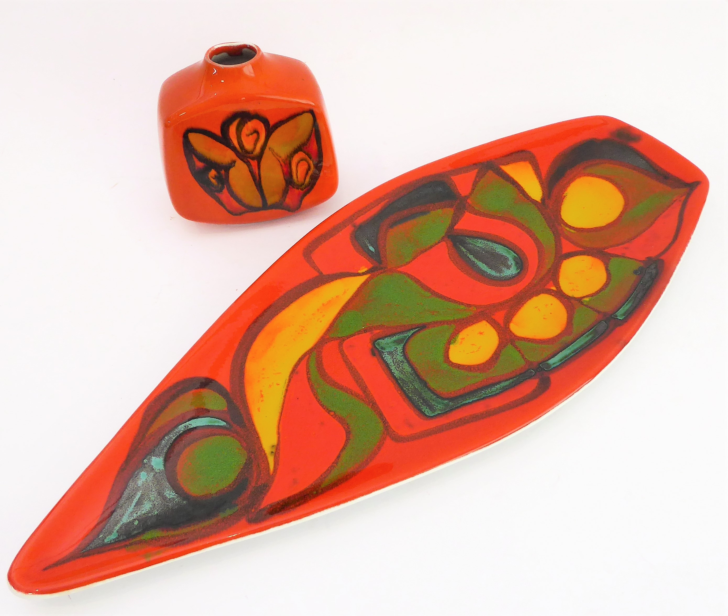 1. a Poole Pottery 'Delphis' boat-shaped studioware dish with 'Poole - England - 82' painted marks to the underside (43.5 cm). 2. an orange ground vase of similar design (10.5 cm high).