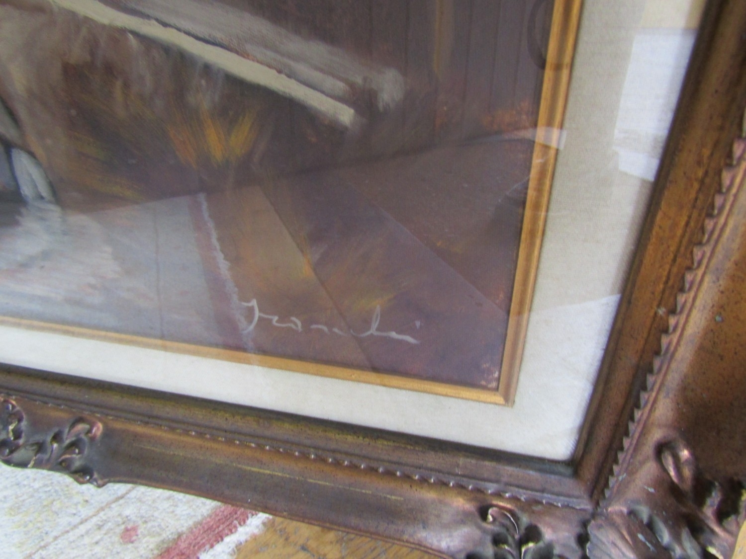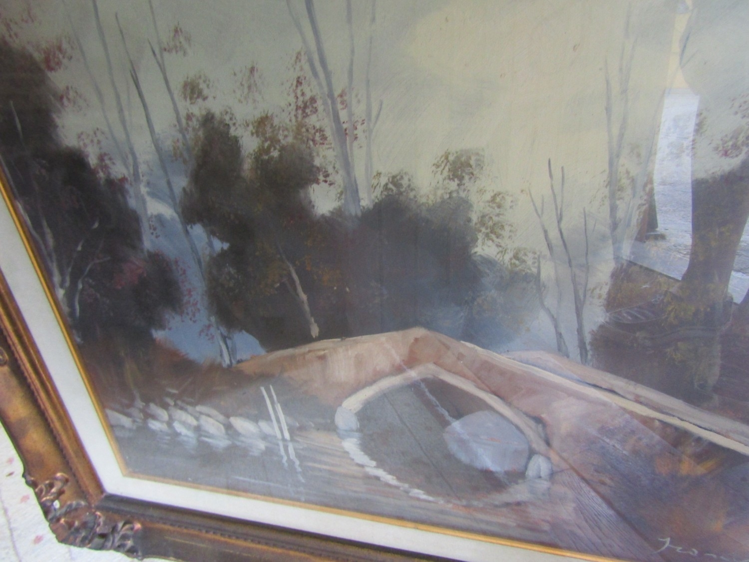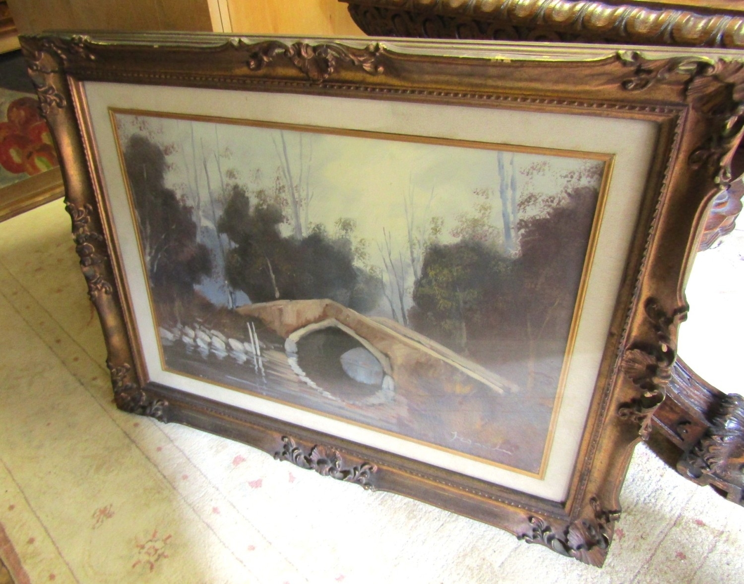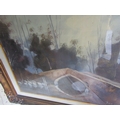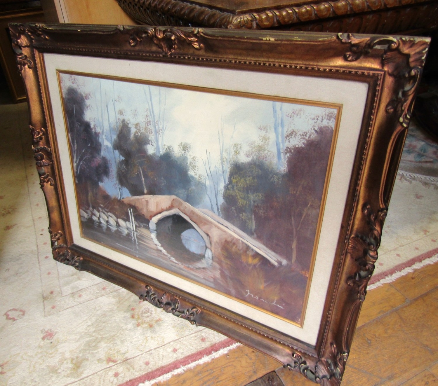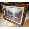 Continental School Oil on Canvas Bridge Scene River and Trees Beyond Approximately 22 Inches High x 34 Inches Wide Contained Within Gilded Frame