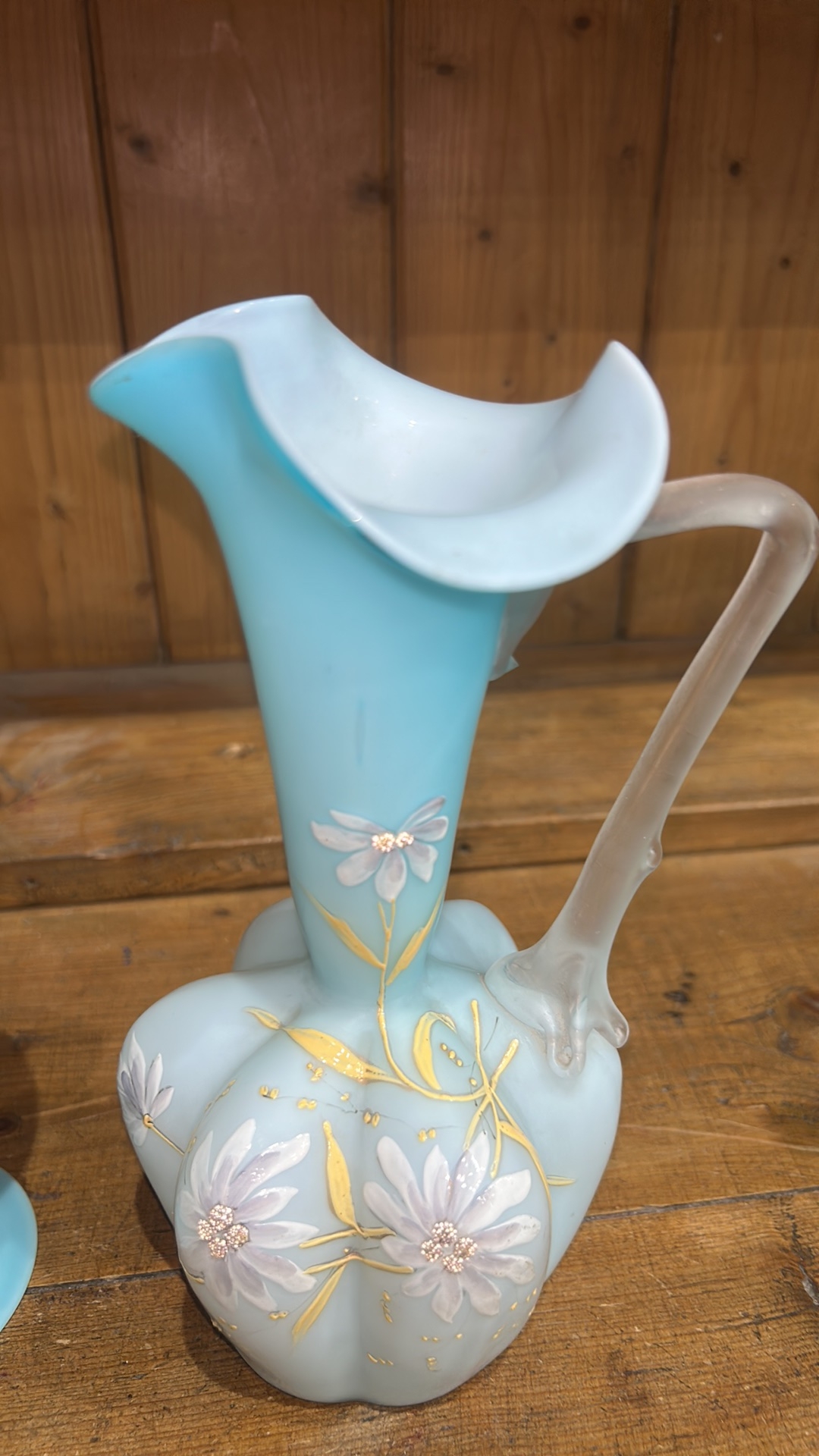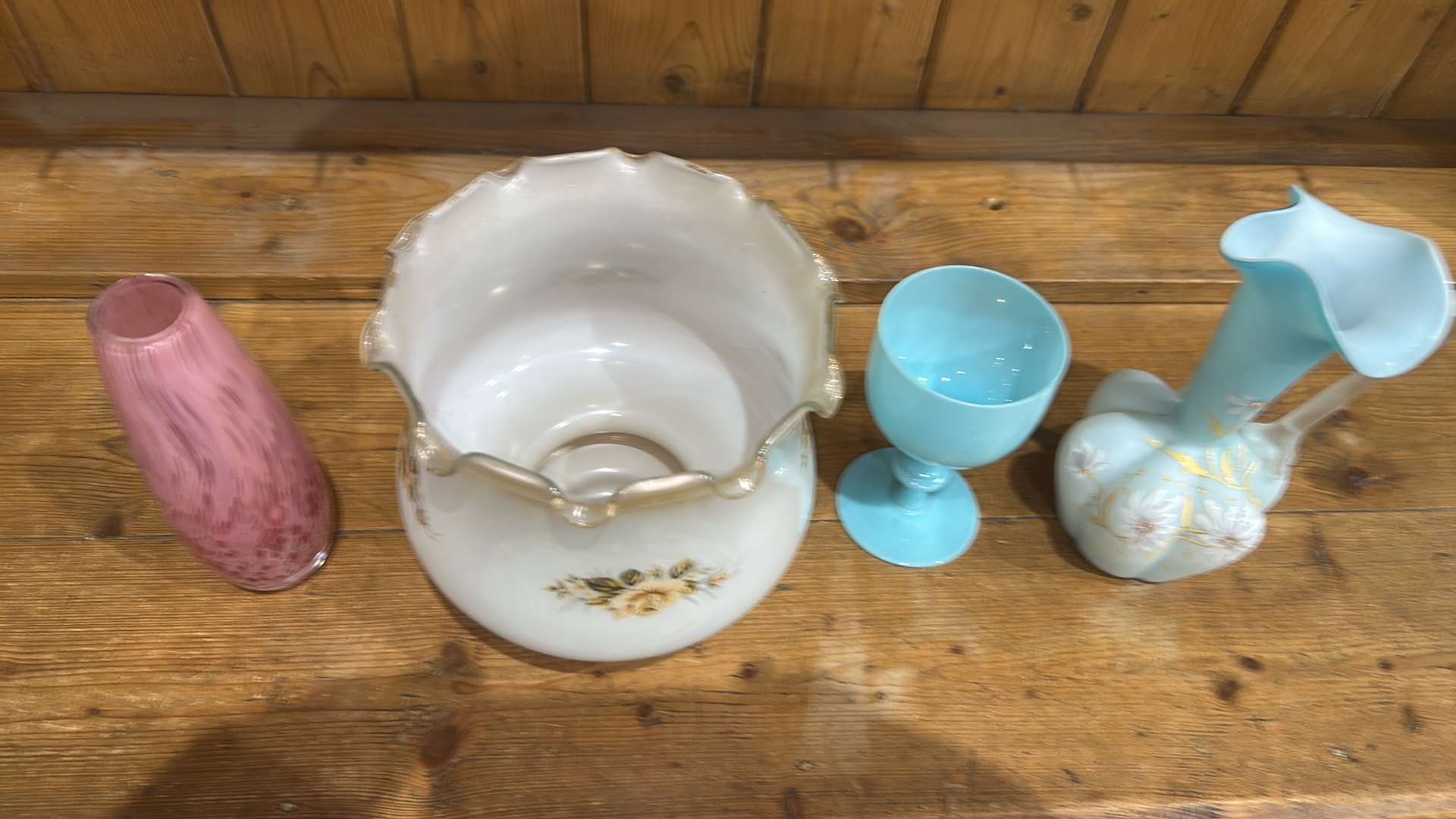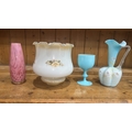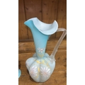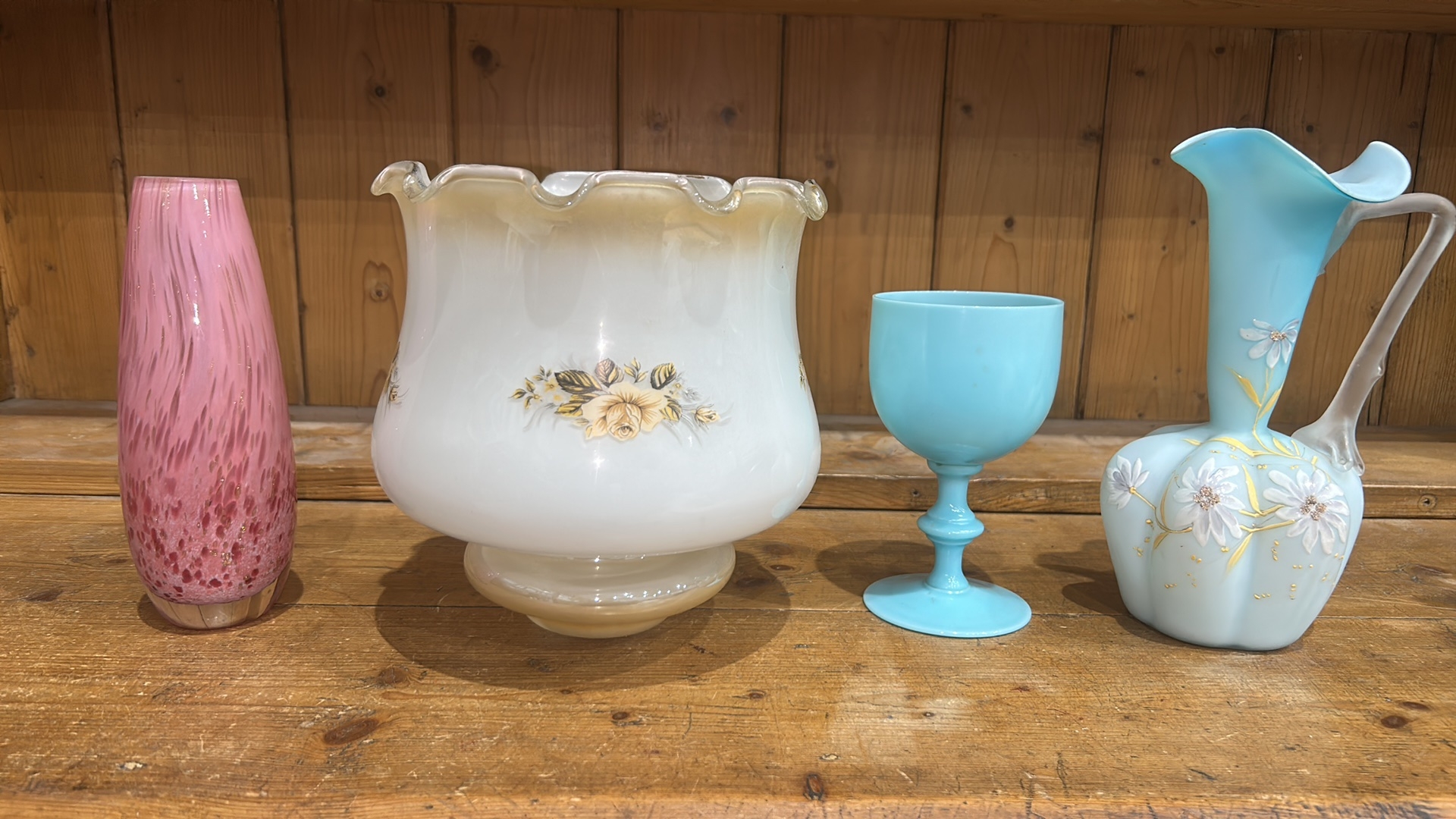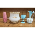 Group of four satin and cased art glass pieces comprising: blue satin glass ewer with applied clear handle and enamelled daisy motifs; matching turquoise satin goblet; opaline glass jardinière with gilt-edged ruffled rim and yellow rose transfer; and mottled pink cased glass cylinder vase.