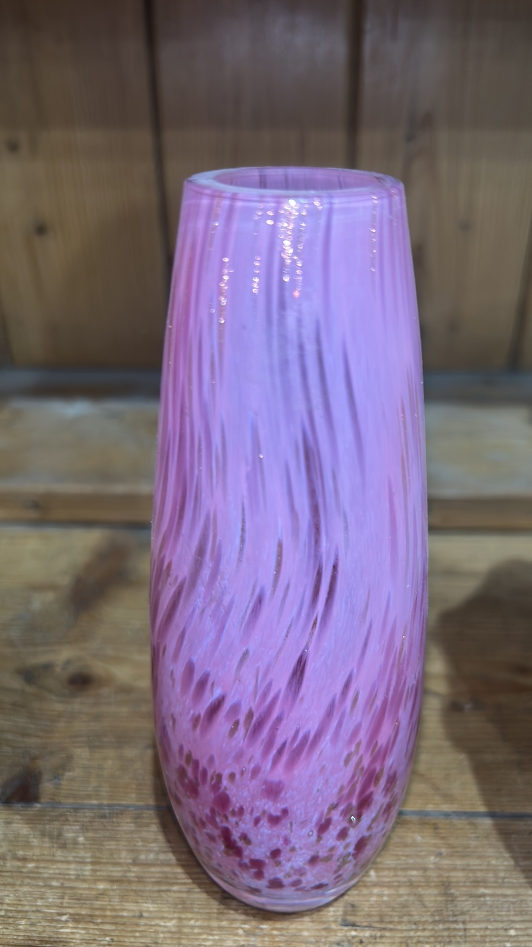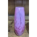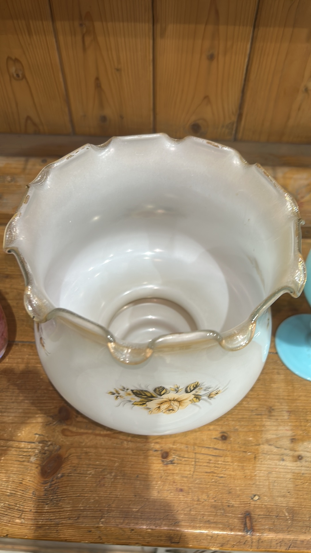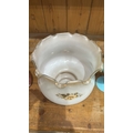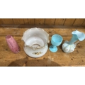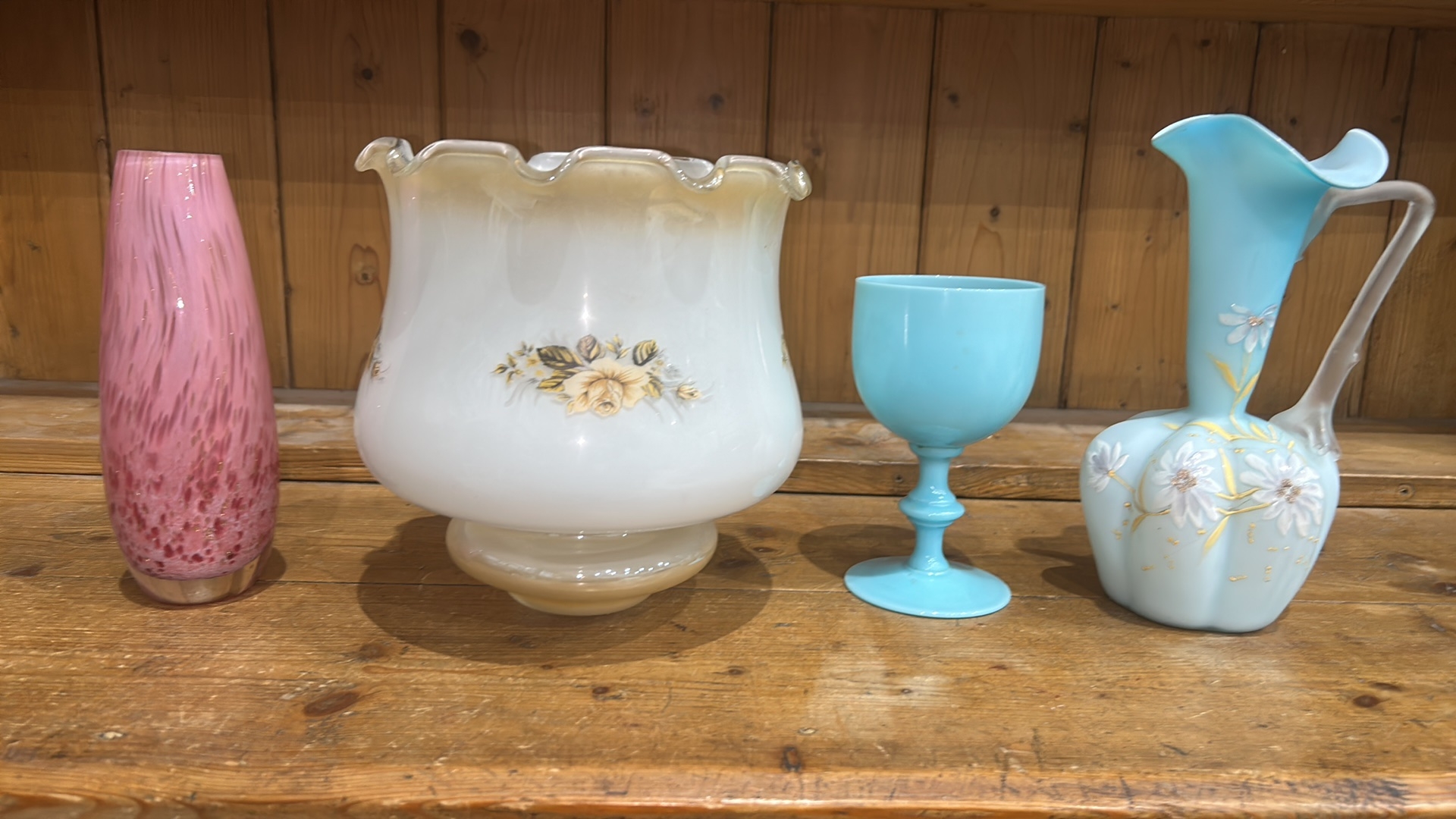 Group of four satin and cased art glass pieces comprising: blue satin glass ewer with applied clear handle and enamelled daisy motifs; matching turquoise satin goblet; opaline glass jardinière with gilt-edged ruffled rim and yellow rose transfer; and mottled pink cased glass cylinder vase.