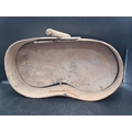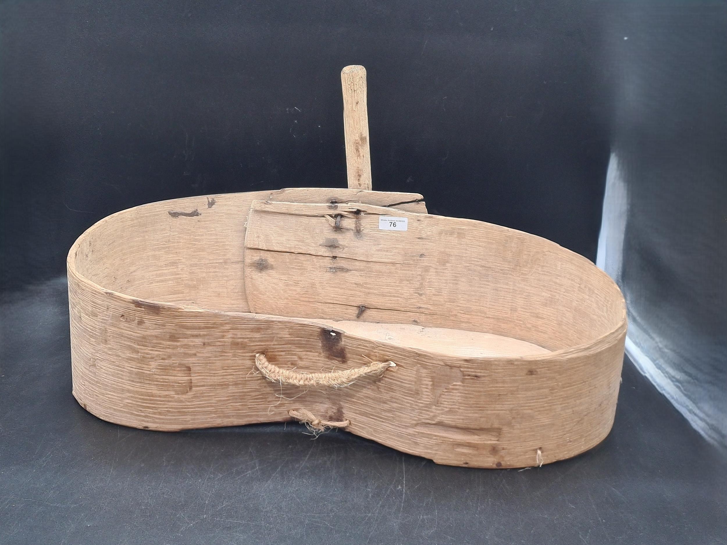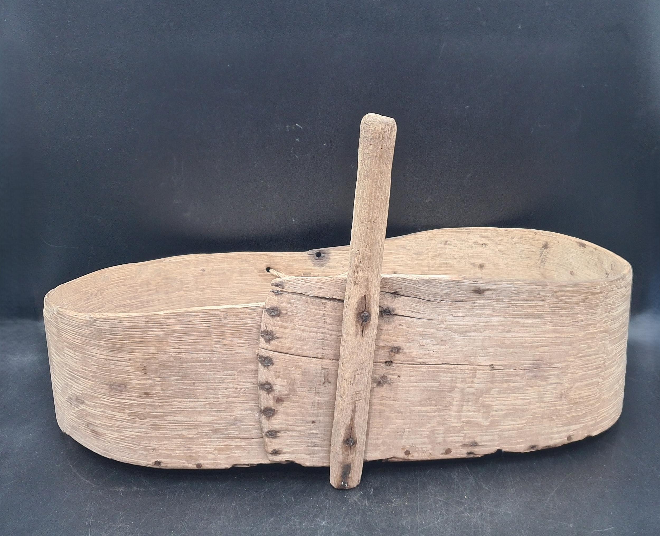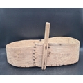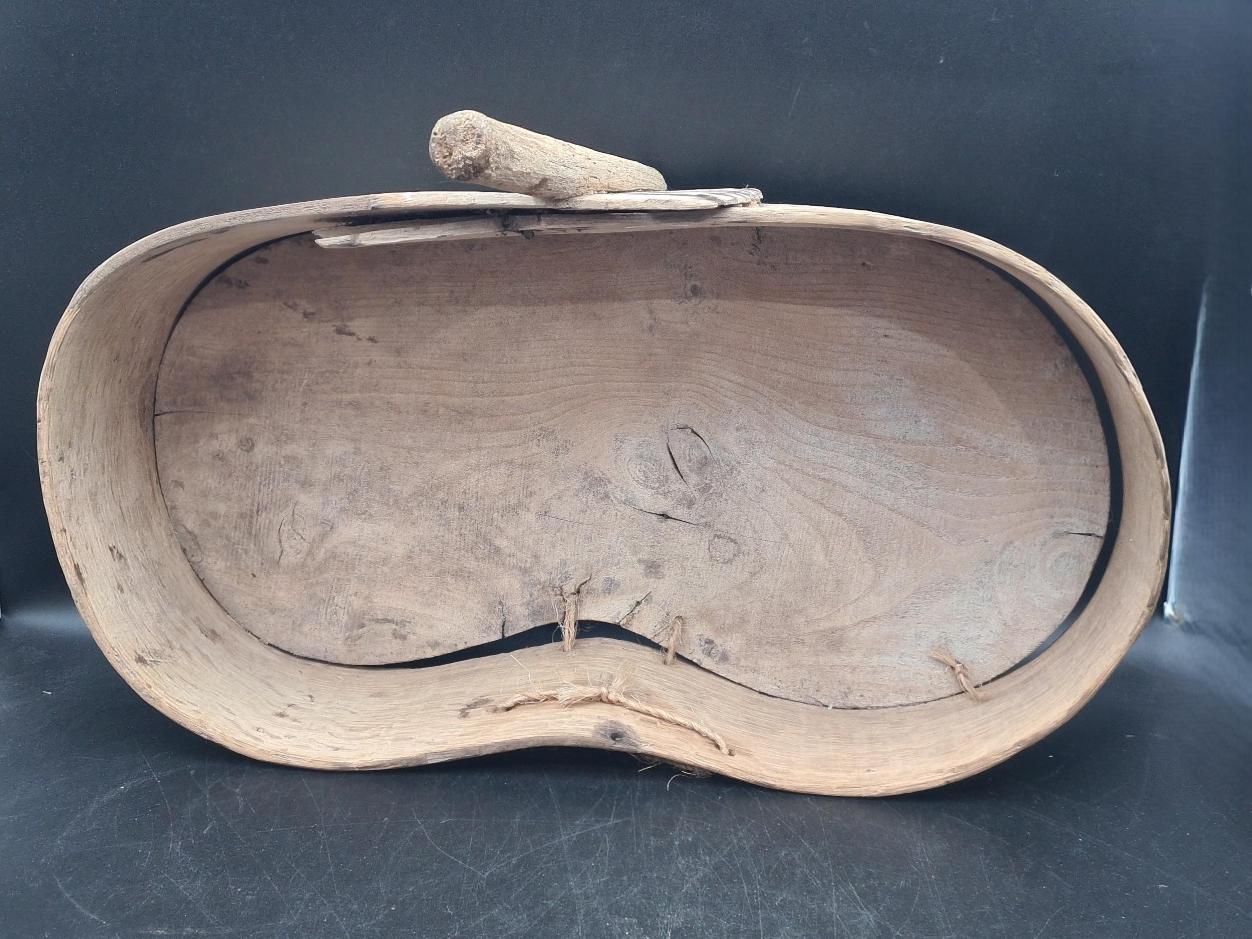 An antique primitive folk art bent oak and elm Seed or Feed Spreader of kidney shape with rustic handle, 24 x 14in (R3)