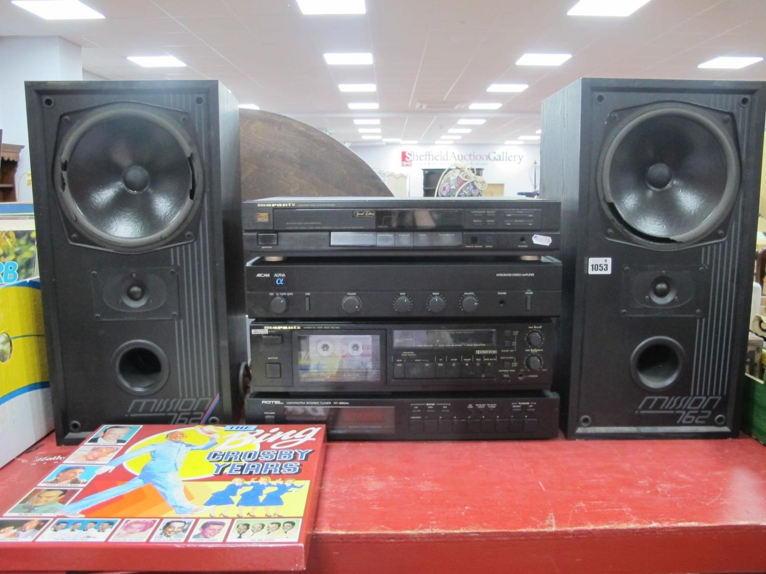 Marantz C Disc Player - Marantz cassette deck, Rotel stereo tuner, Arcam Alpha CD tuner, pair of Mission 762 speakers, Joan Baez lp's, etc.