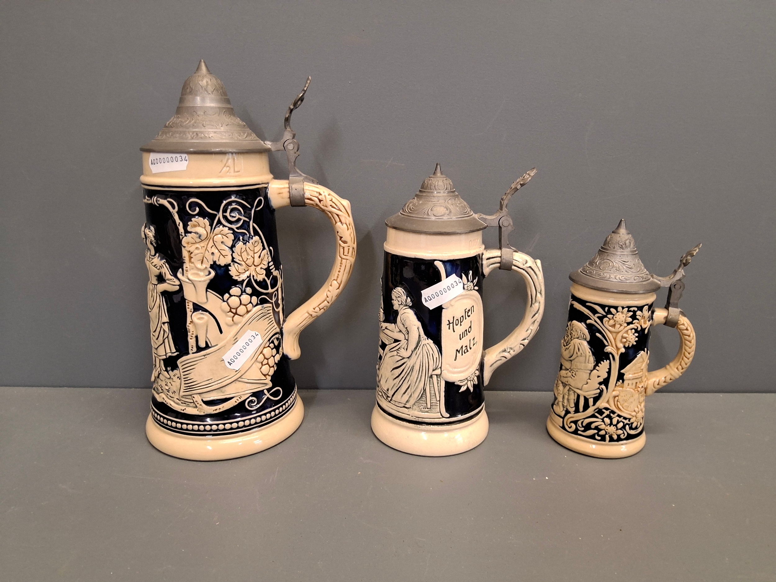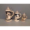 Three vintage German beer steins with pewter tops.Tallest one is 23cm