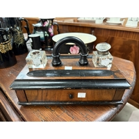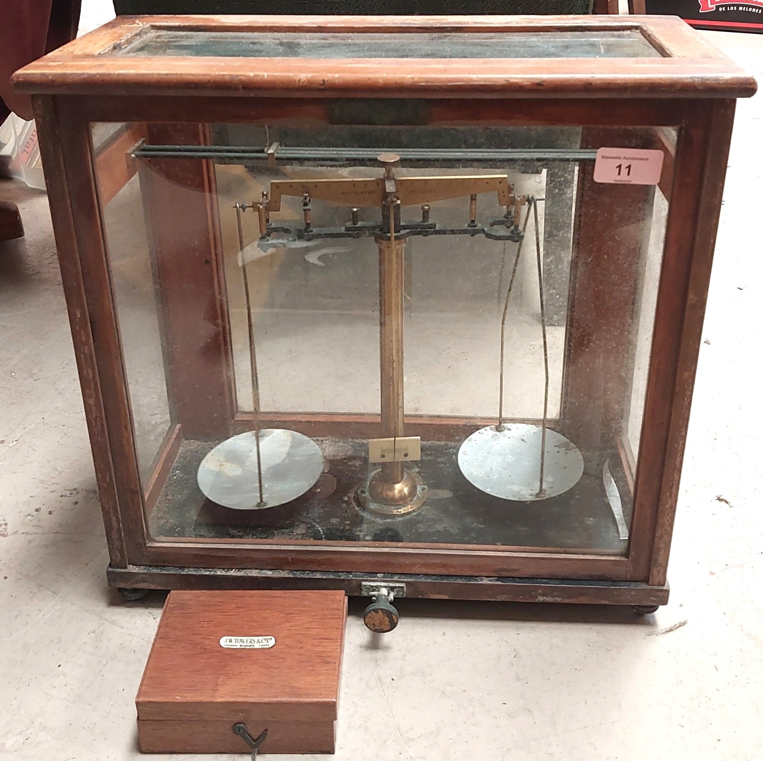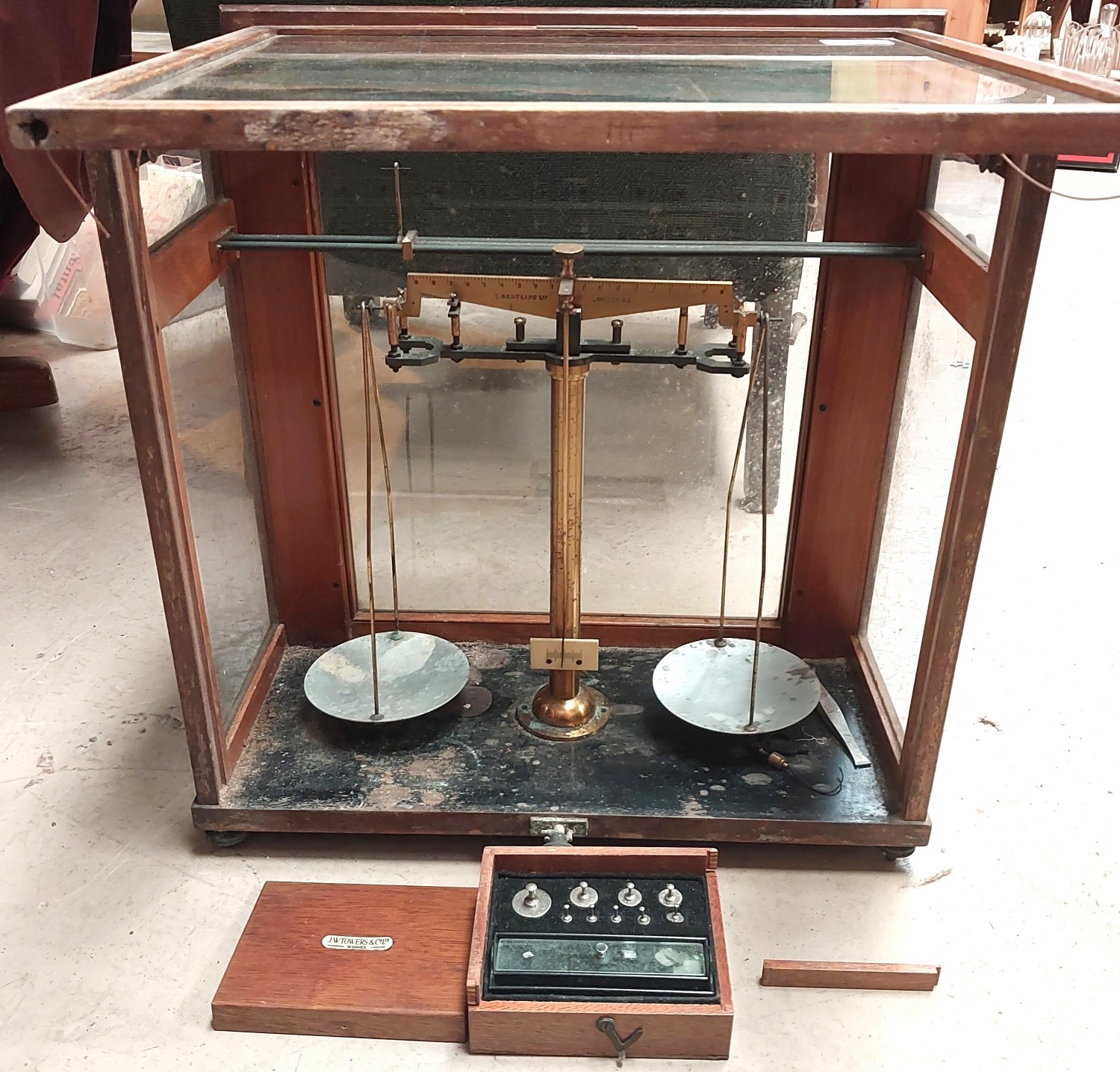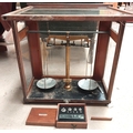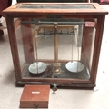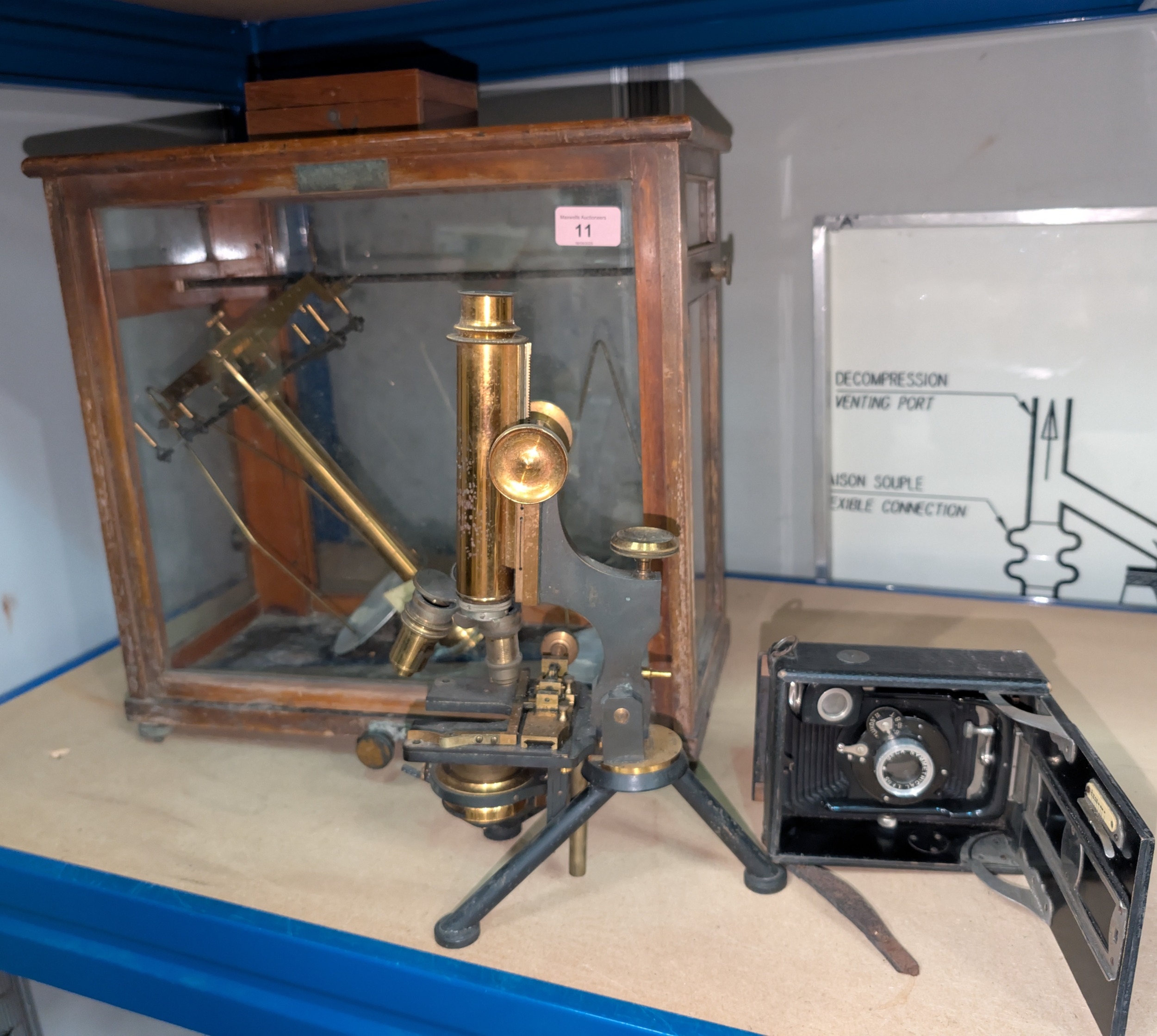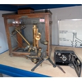 A vintage microscope with various lenses and a scientific cased balance and a vintage camera