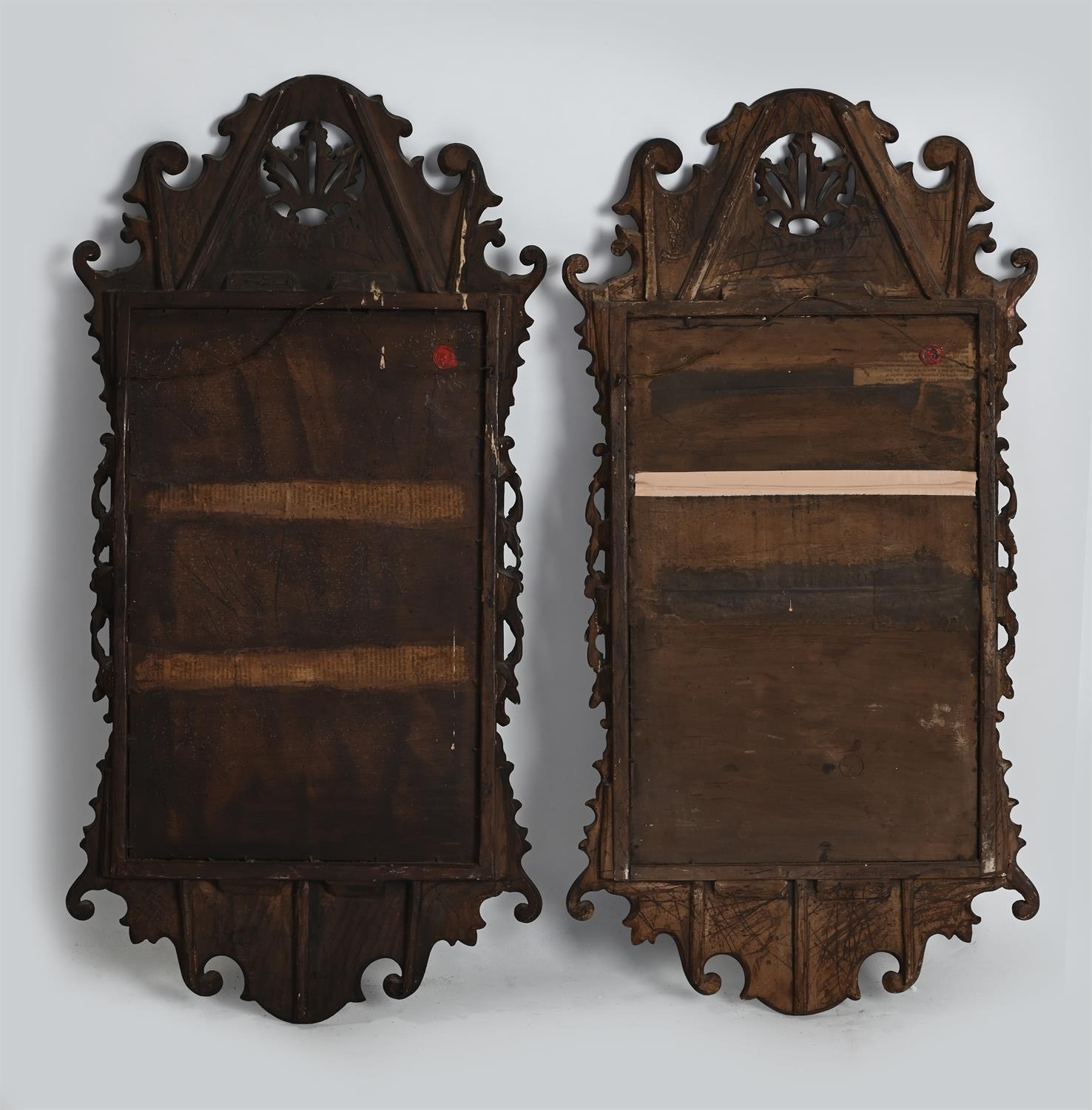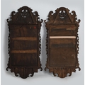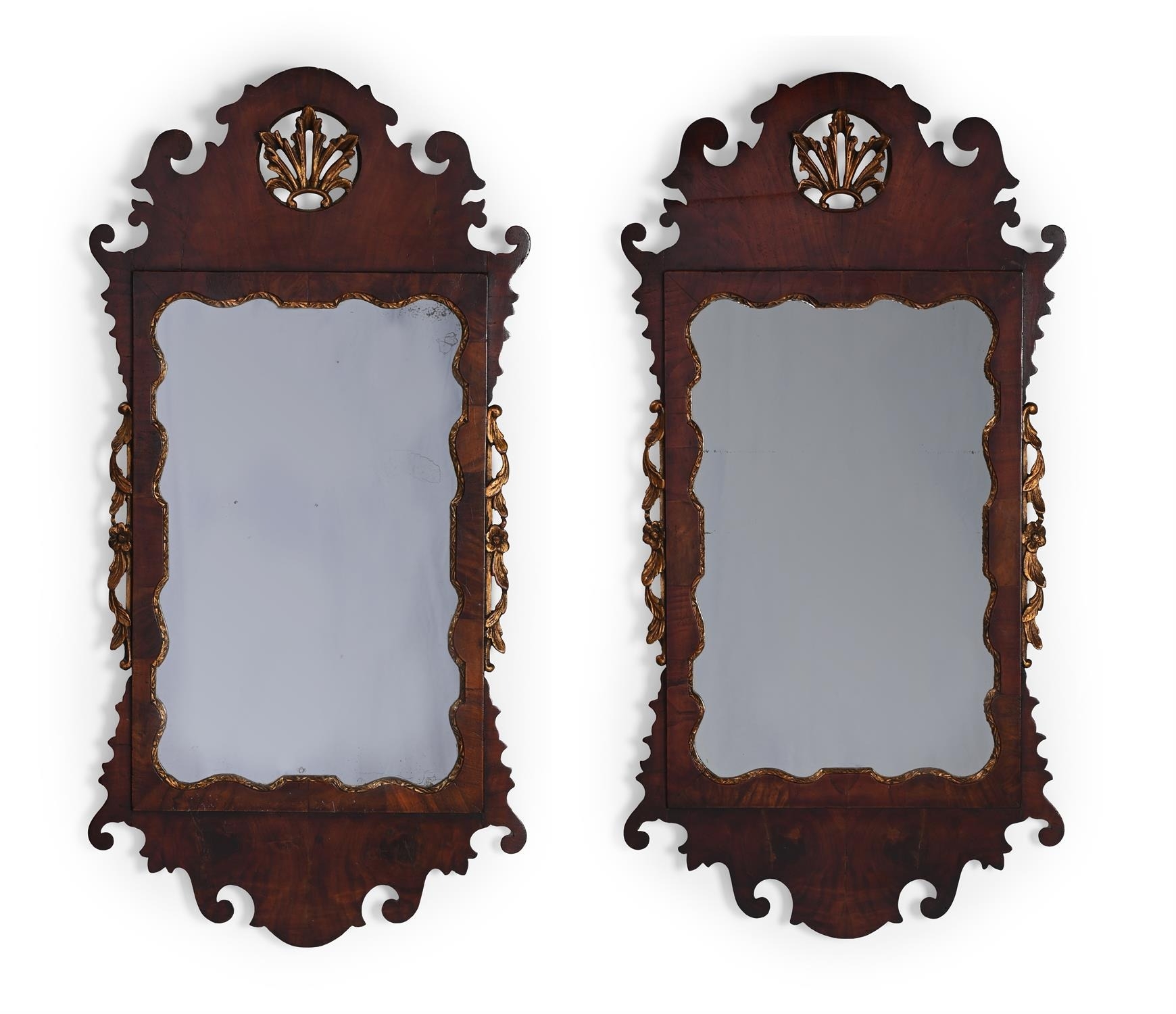 A PAIR OF WALNUT AND PARCEL GILT WALL MIRRORSIN GEORGE II STYLE, 19TH CENTURYeach inscribed 'London 1741' each 97cm high, 49cm wide