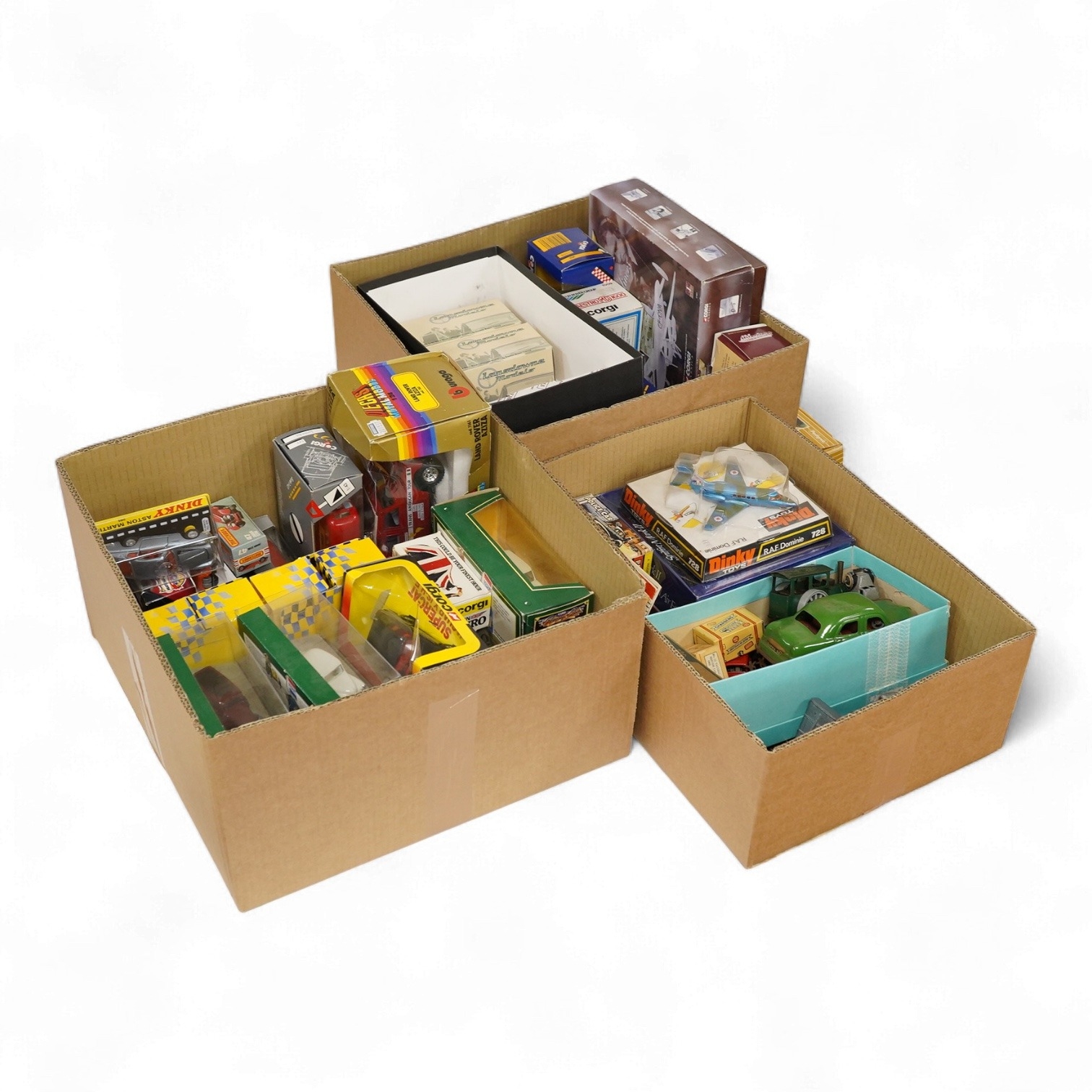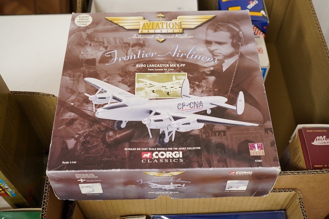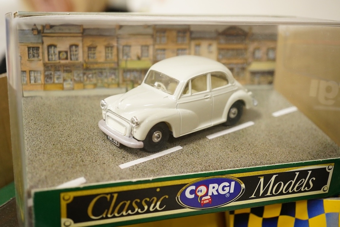 Thirty-six diecast and white metal vehicles, including; four white metal vehicles; a Crossway Models Morris Oxford, a Gem & Cobwebs Austin Taxi, two Lansdown Models; a 1951 Bentley Mk.VI and a 1936 Morris Ten-Four, together with a variety of boxed diecast by Corgi, Matchbox, Bburago, etc., plus older diecast including; a boxed Modern Product Police Car, three Charbens Miniature Series, a Schuco car, Dinky Toys, Corgi Toys, a Tri-ang Minic road roller, etc.