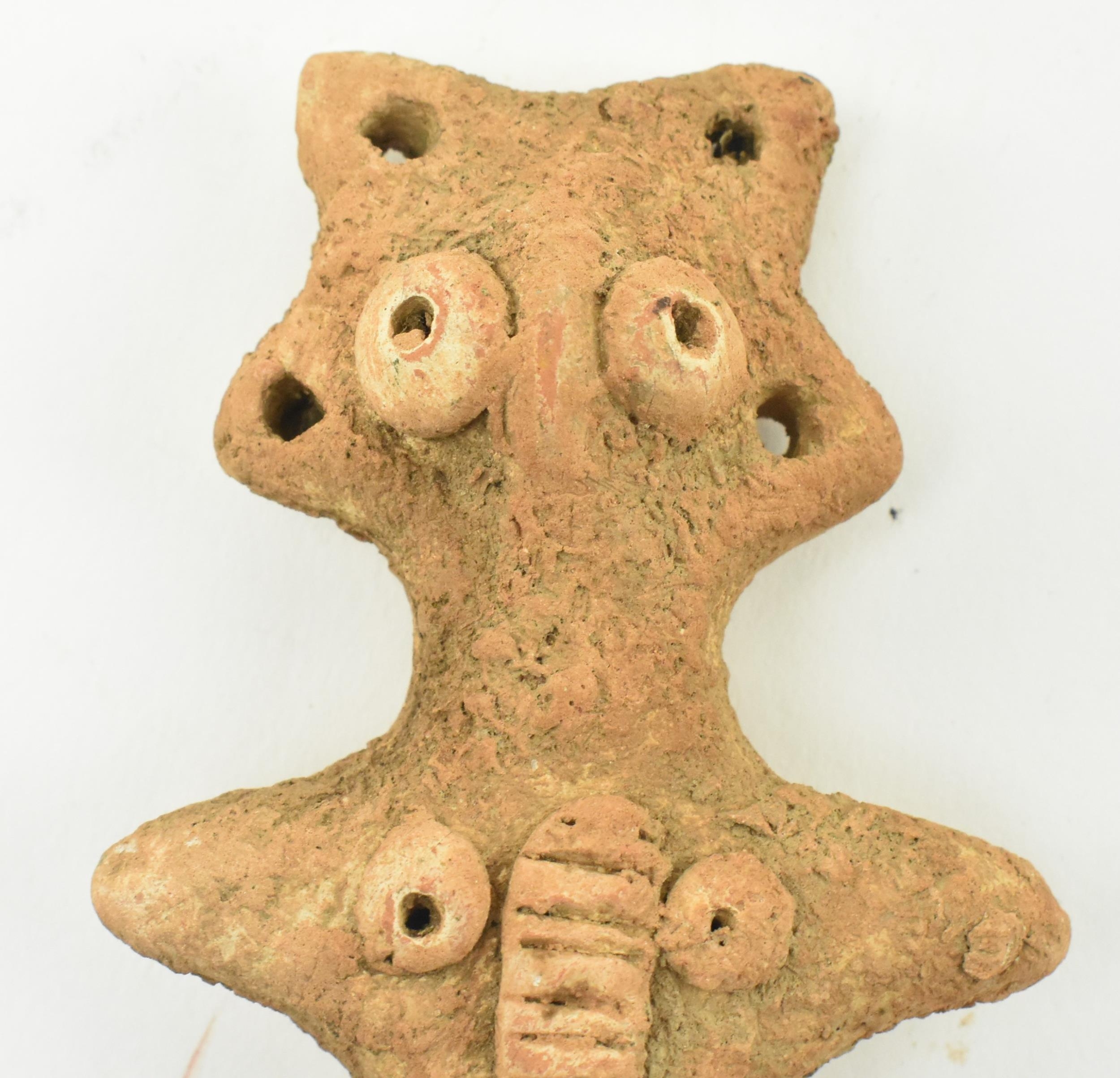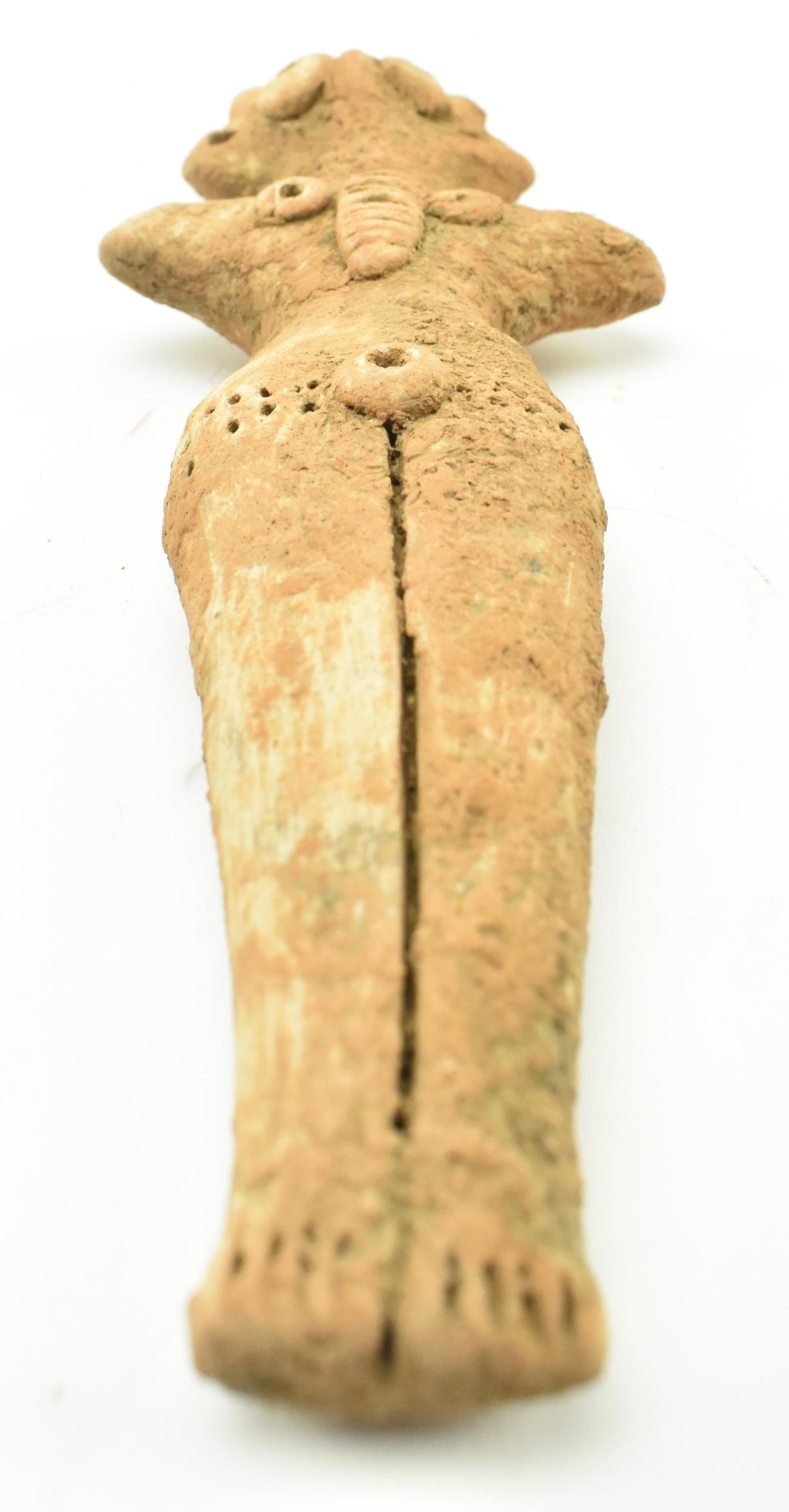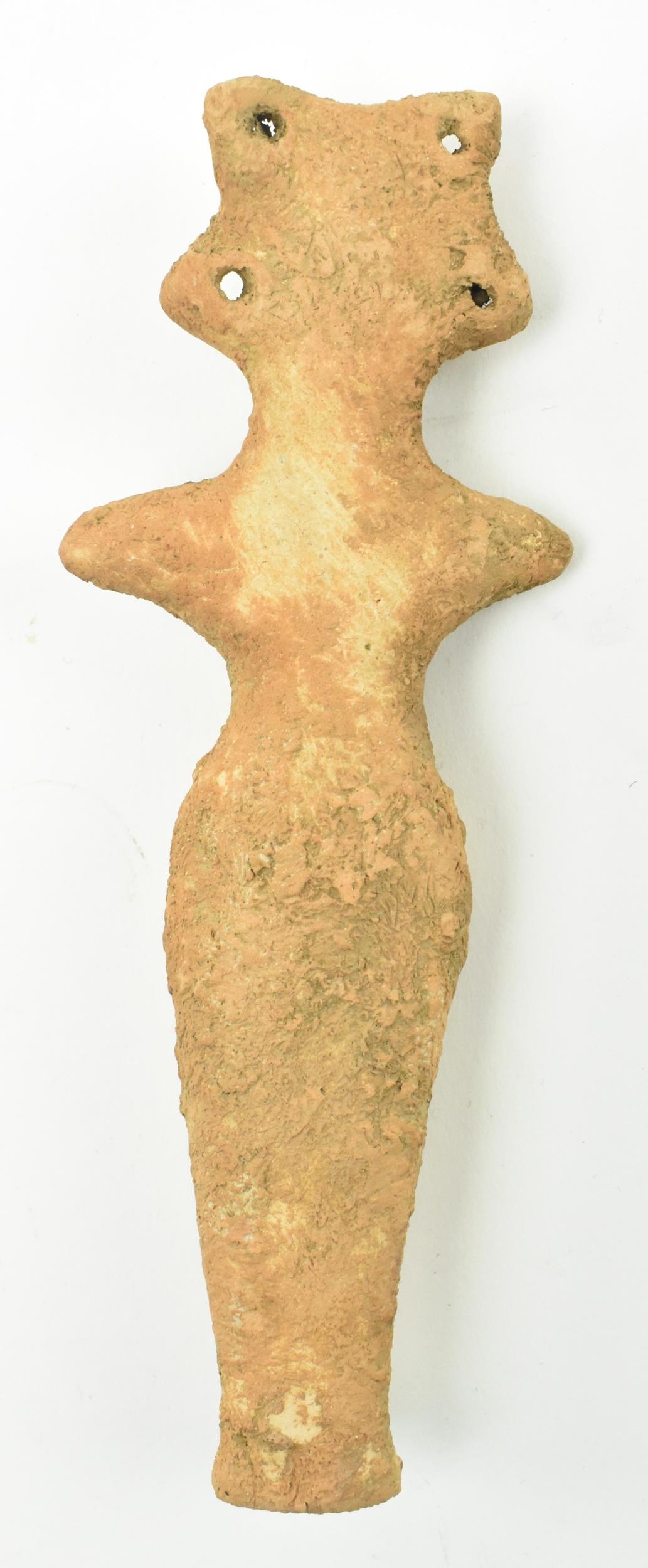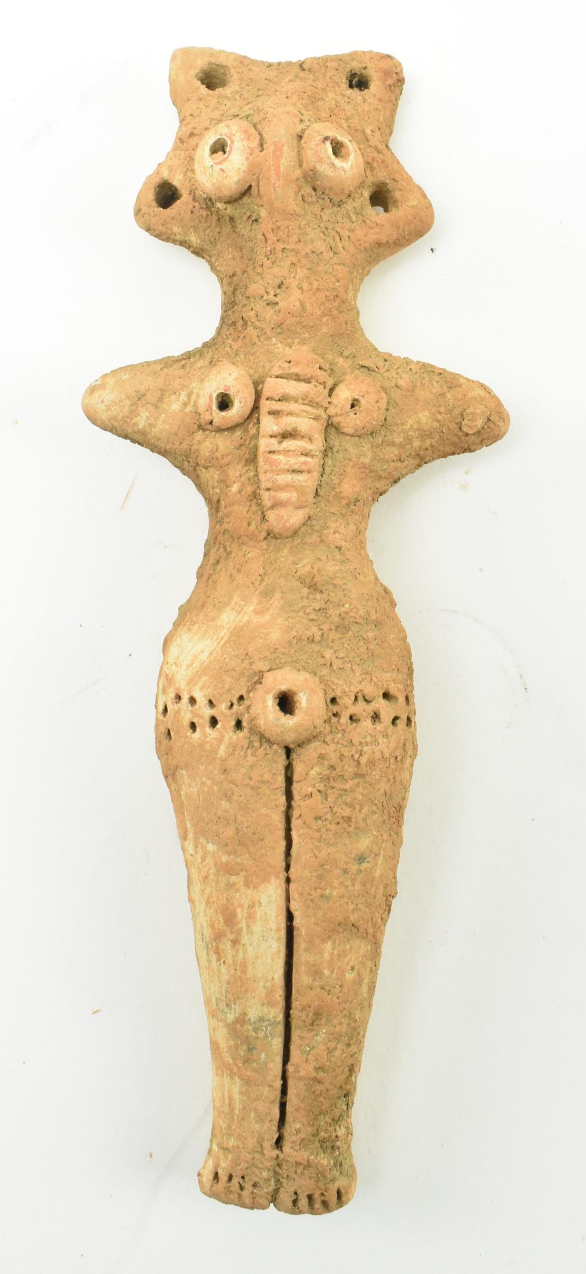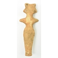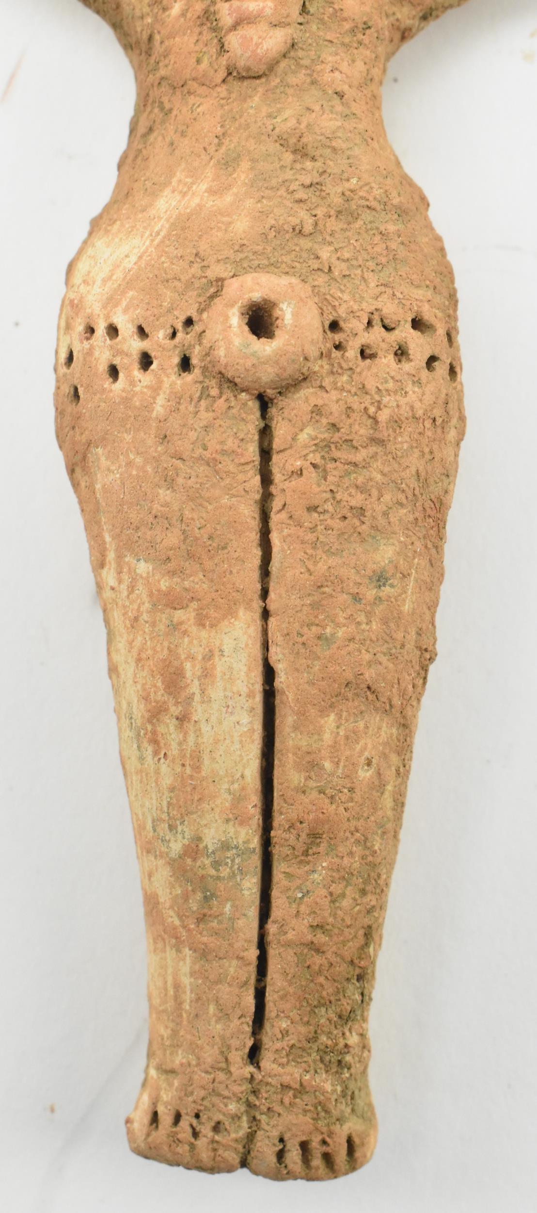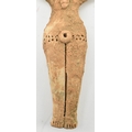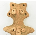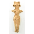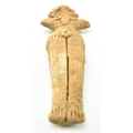 A Syro-Hittite terracotta goddess figurine, believed 1st millennium BC, possibly depicting the goddess Astarte. The goddess modelled with styled hair & raised ring eyes, neckless, stump arms, stippled garment below the waist & carved toes. Measures approx. 15.6cm long.