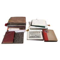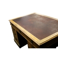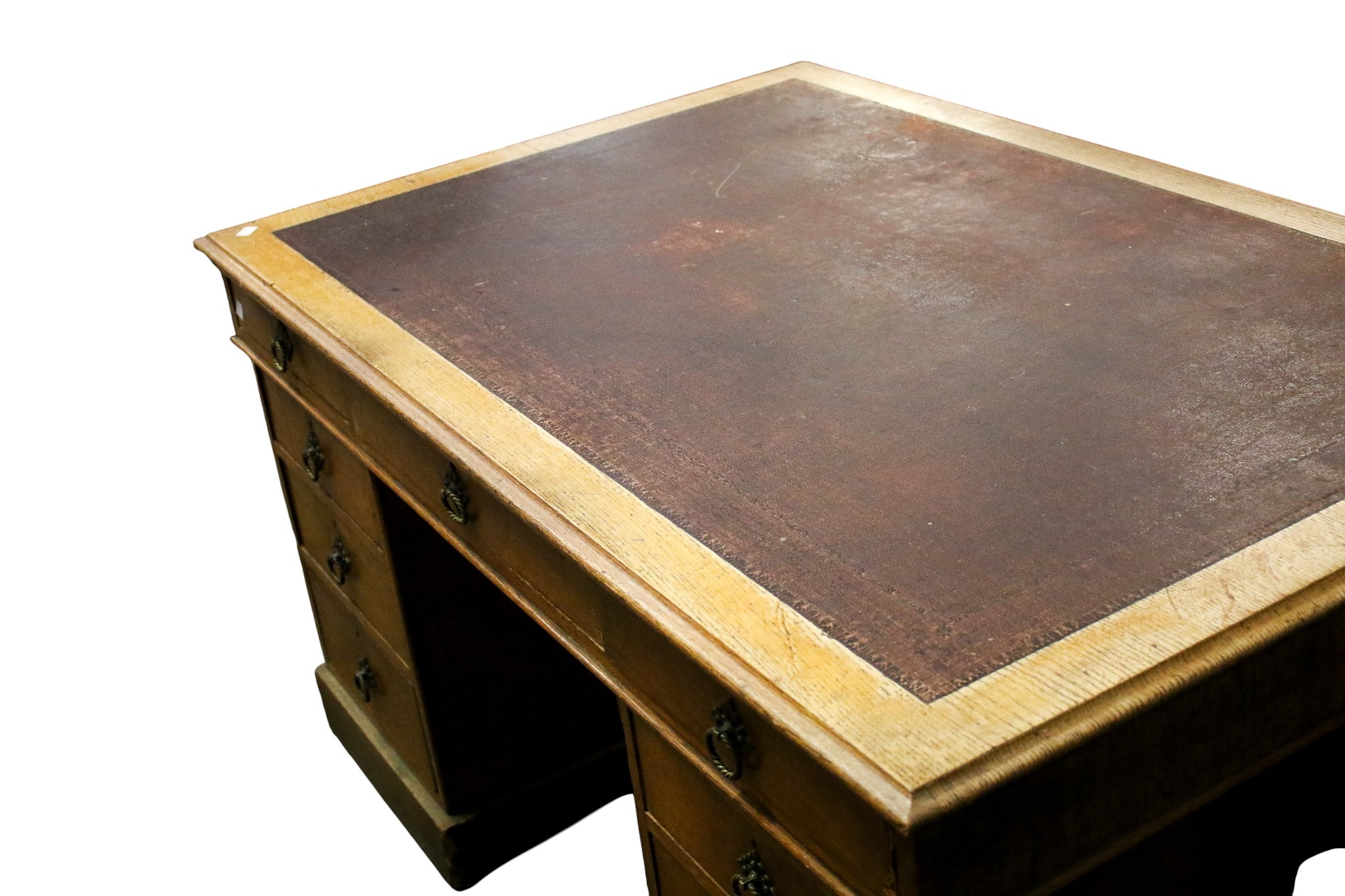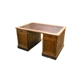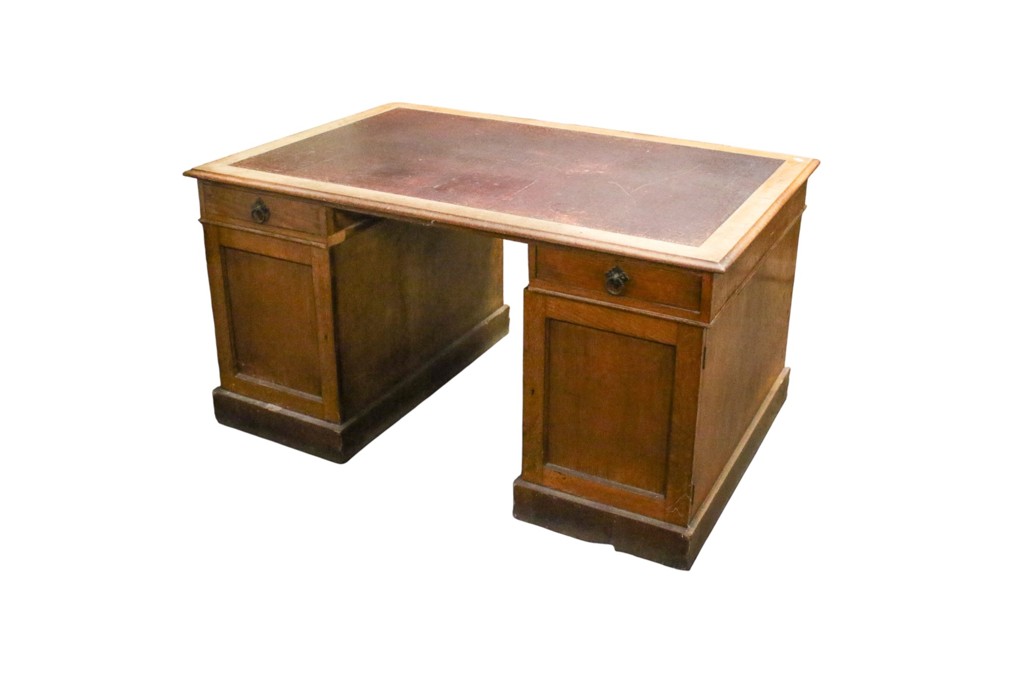 An early 20th century oak twin pedestal partner's desk. Having an inset top drawer to one side and cupboard to the other, raised on a plinth base. H72cm x W137cm x D90cm