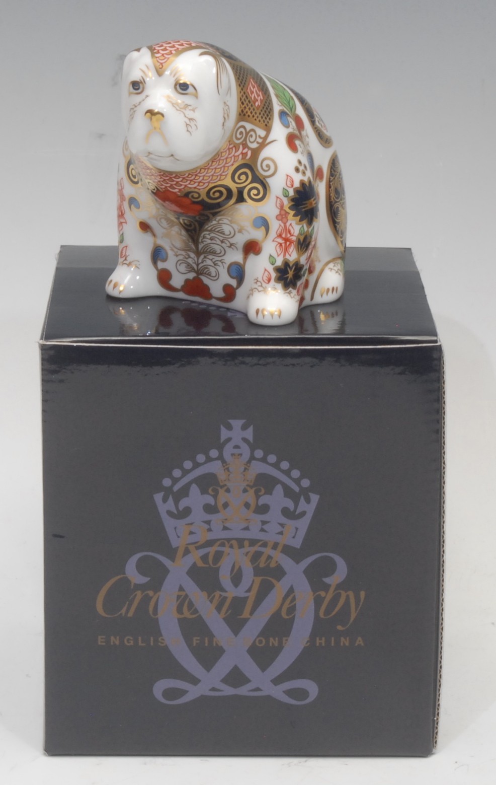 A Royal Crown Derby paperweight, Old Imari Bulldog, decorated in the 1128 pattern, gold stopper, 8.5cm, printed mark in red, boxed