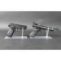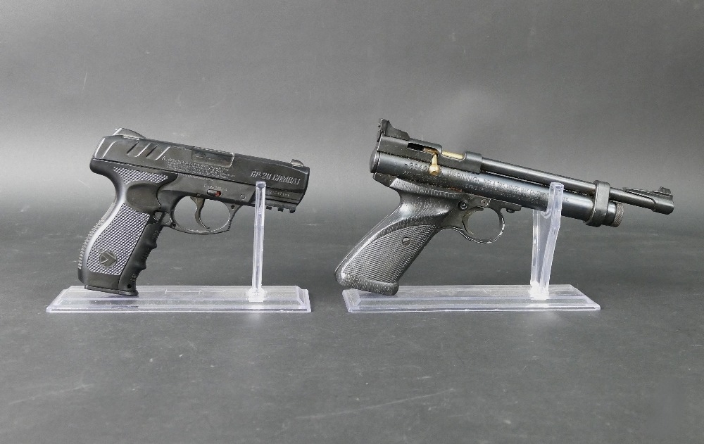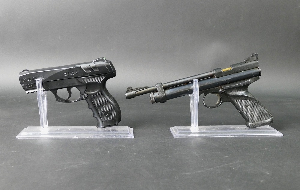 A Crosman 2240 cal 22 CO2 powered air pistol, together with a Gamo GP-20 Combat cal 177 CO2 air pistol. Crosman Serial No. 415B03666, Gamo Serial No. W21E42156. WE CANNOT POST AIR GUNS TO PRIVATE ADDRESSES. POSTAGE TO REGISTERED FIREARMS DEALERS ONLY.
