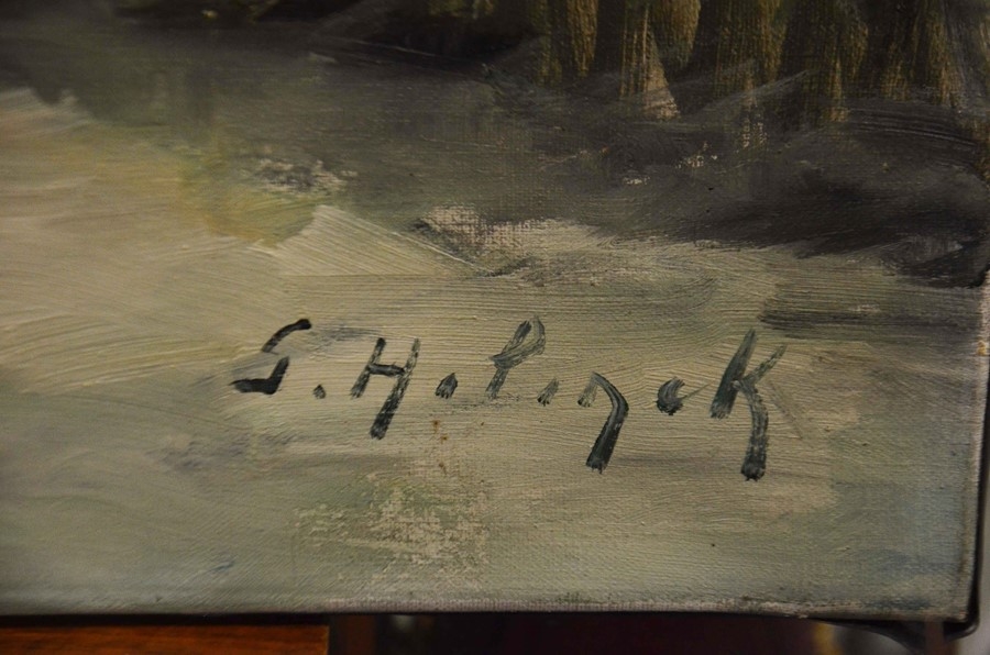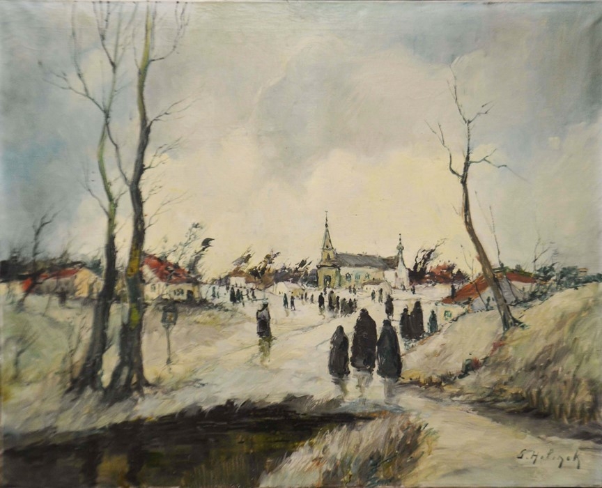 Gustave Helinck (1884-1954), Villagers going to Church, oil on canvas, signed, 80cm x 100cm, unframed