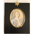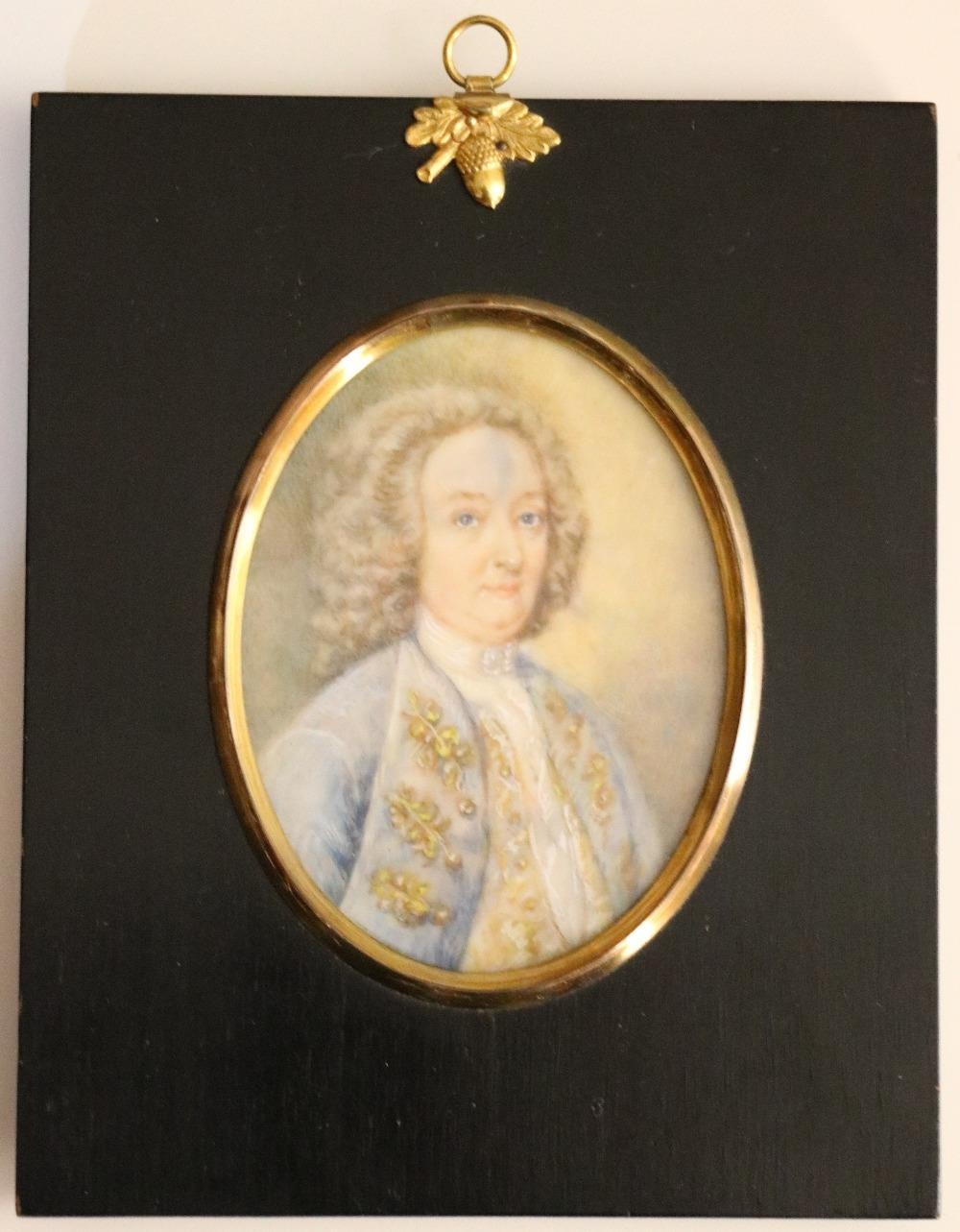 Miniature: Head and shoulders, "Portrait of Gentleman with wig, in profusely decorated blue coat," on ivory, approx. 10.5cms x 8cms (4 1/4" x 3") in black frame. (1)