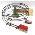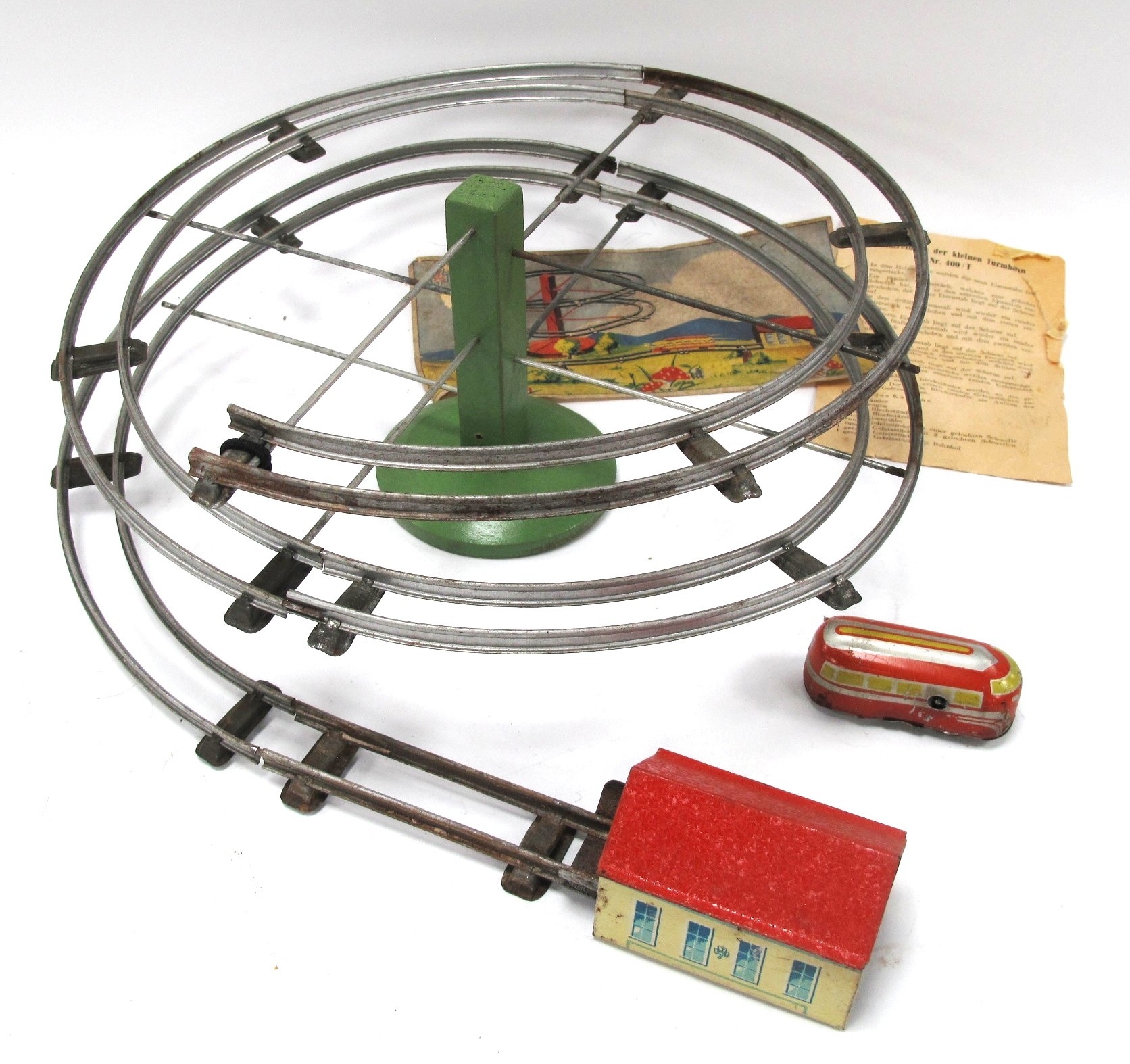 A circa Mid 1900s 'Tower Railway' Made in US Zone Germany, with circular track, tinplate car (working but requires key) and paperwork.