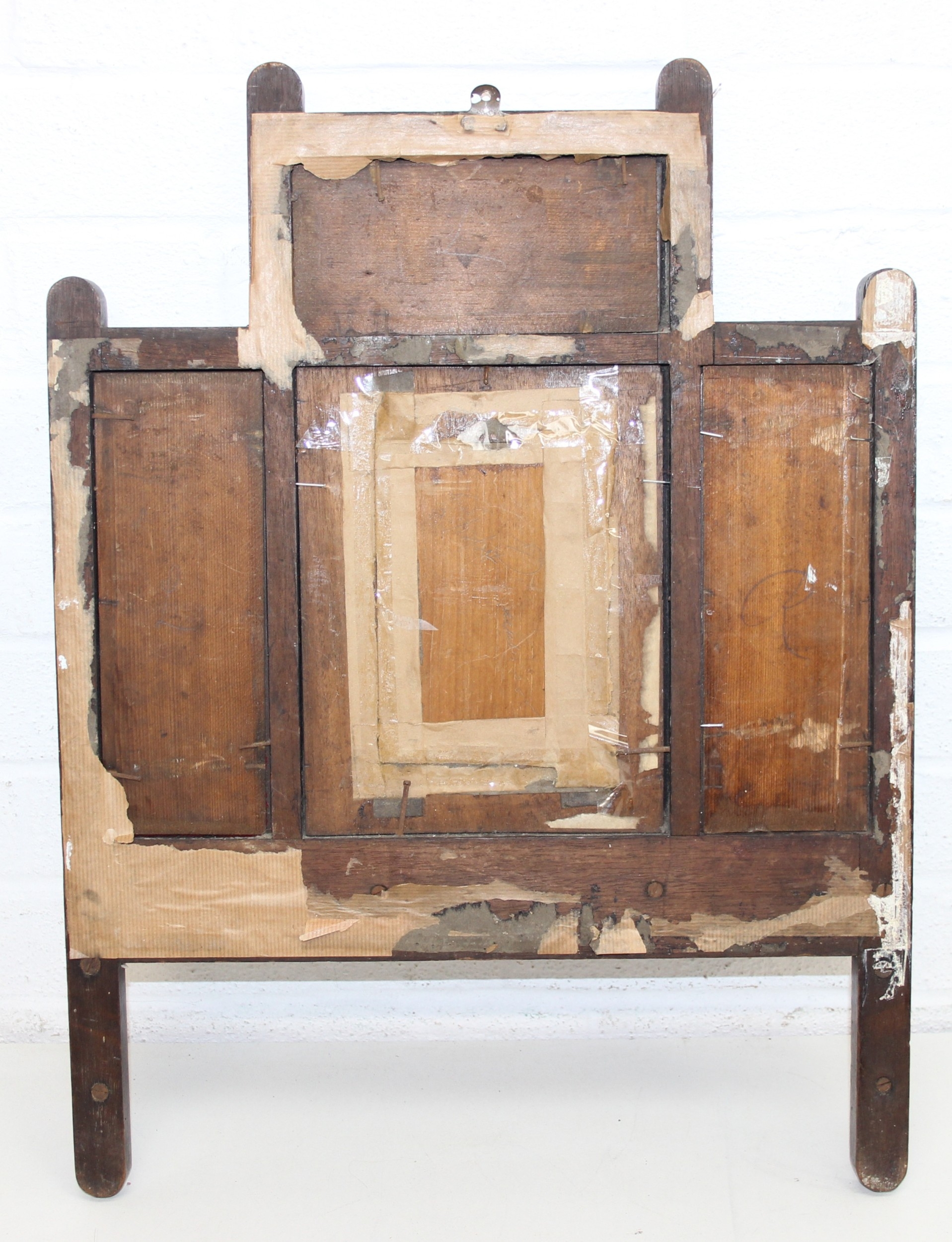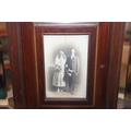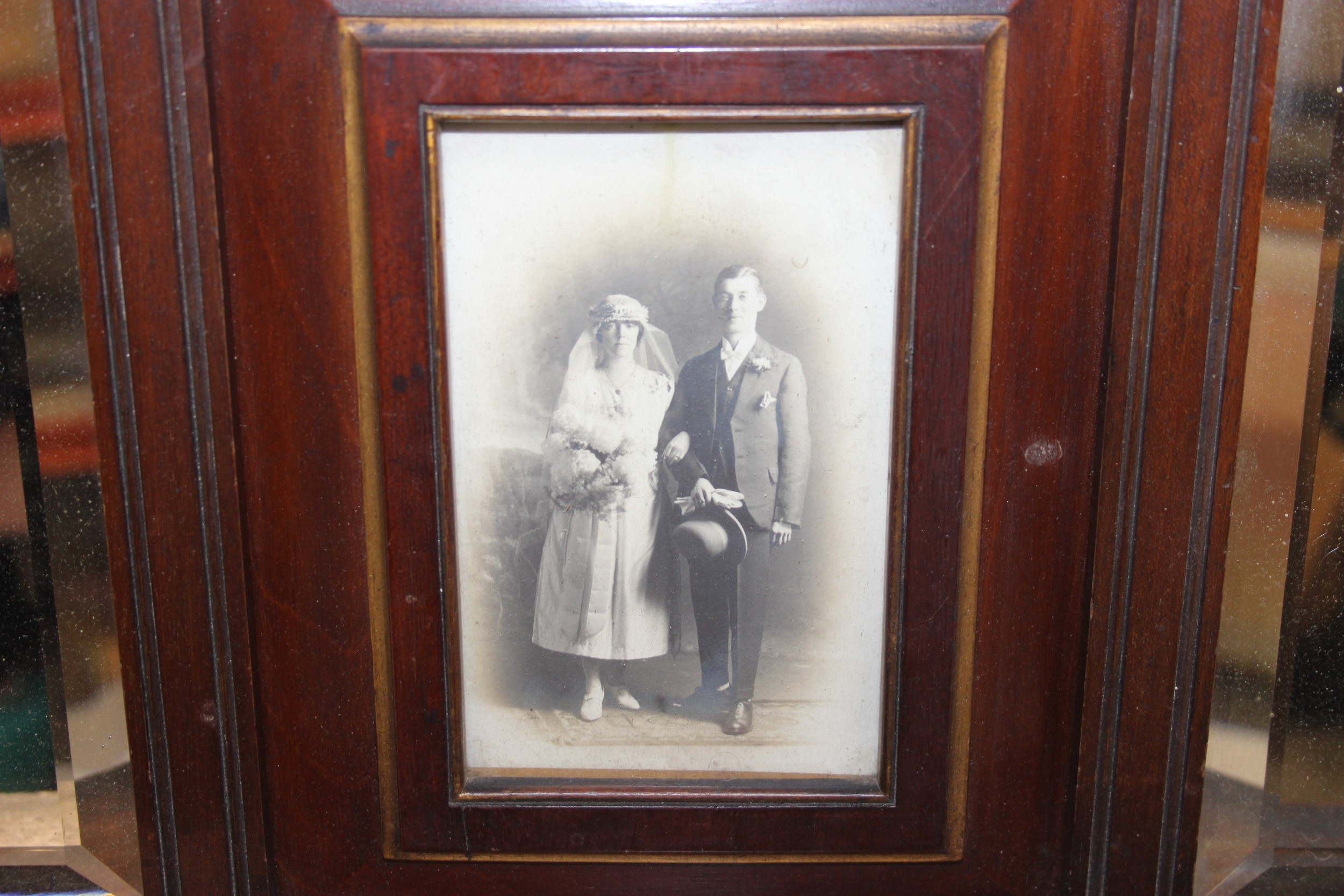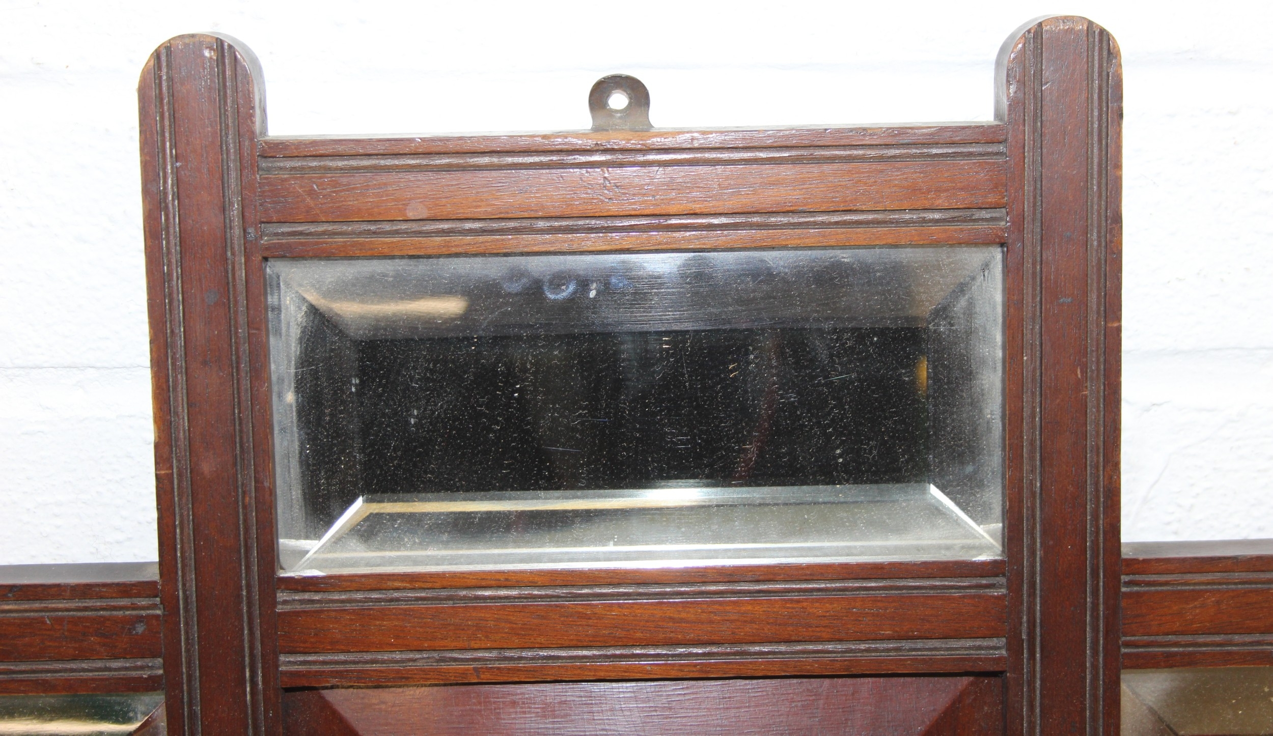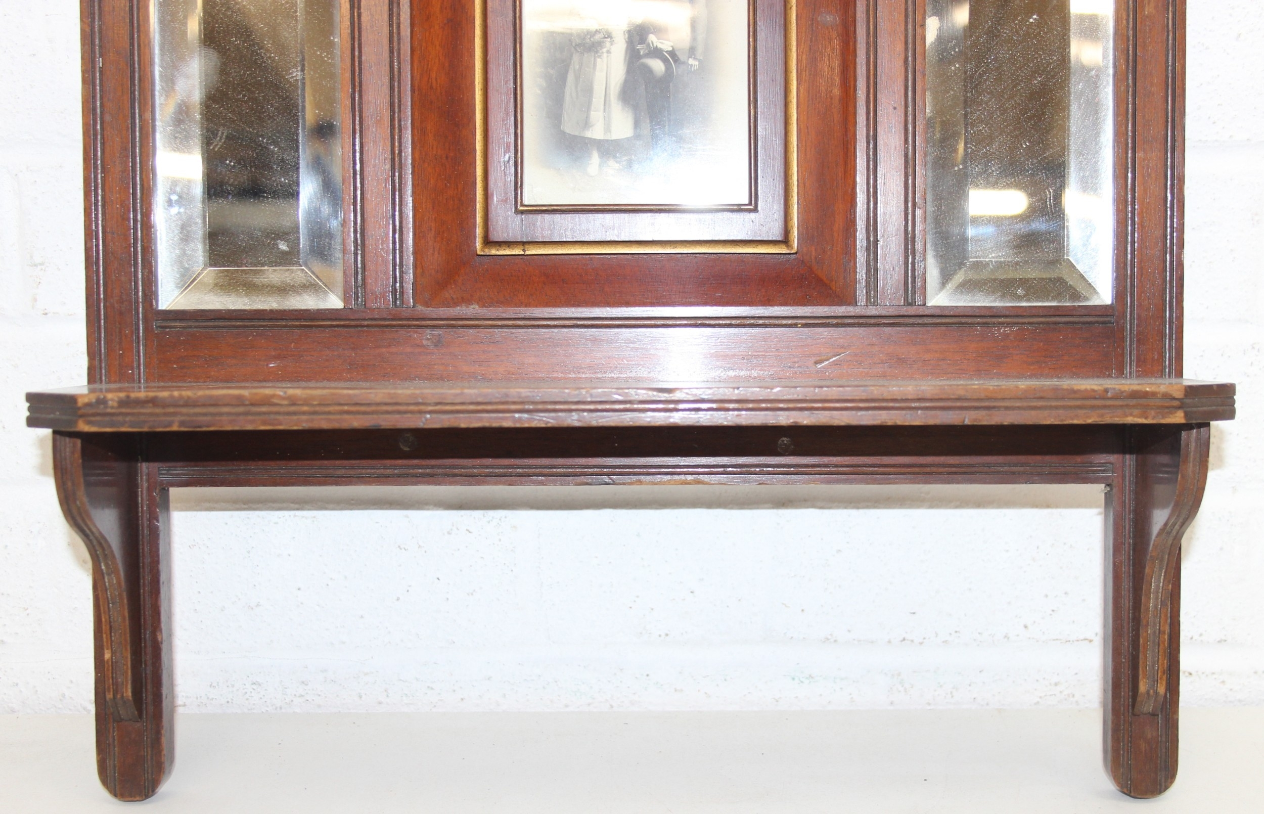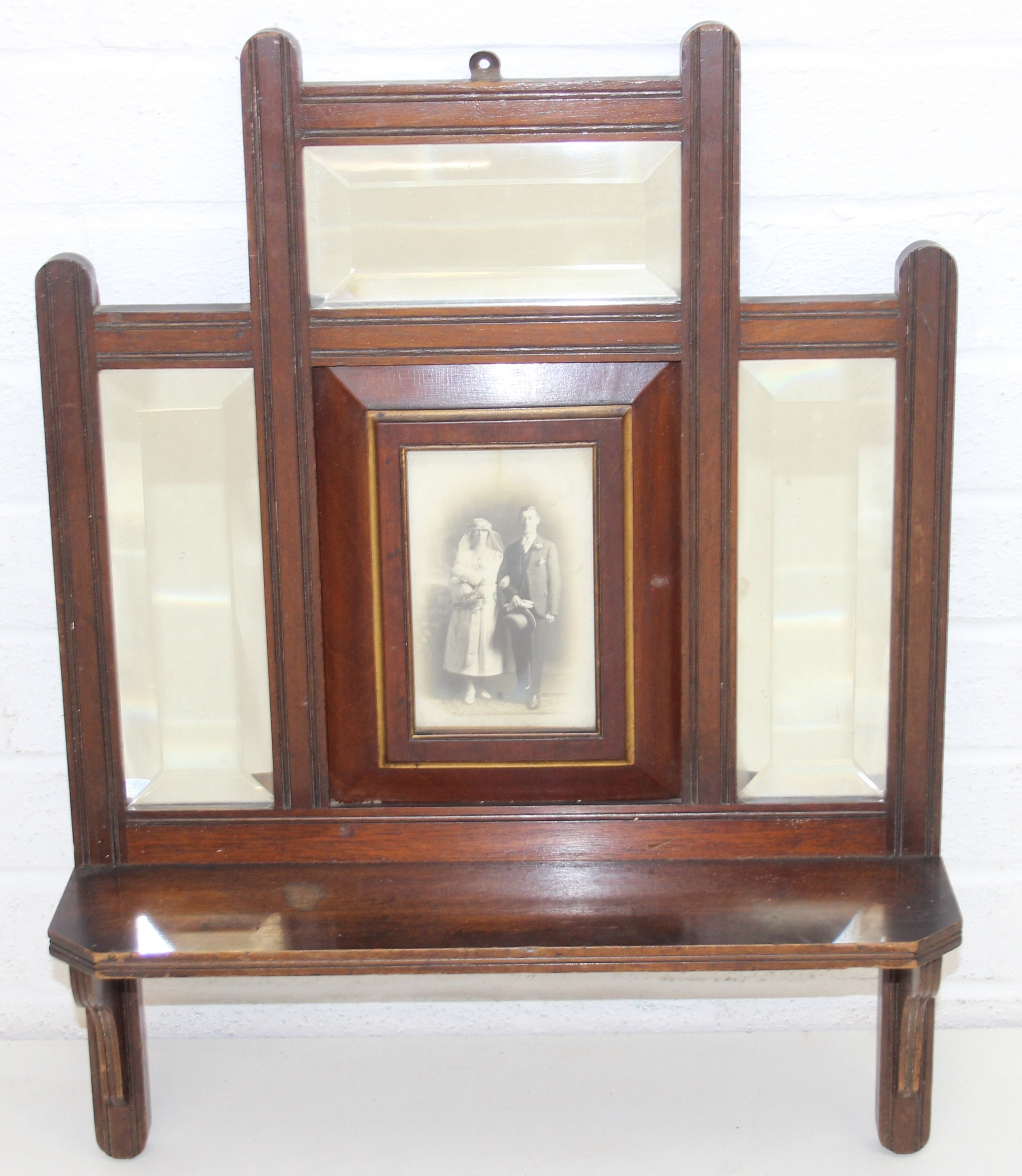 An antique Edwardian mahogany wall shelf with bevelled-edged mirror, display shelf and central photograph area, 45cm W x 60cm H