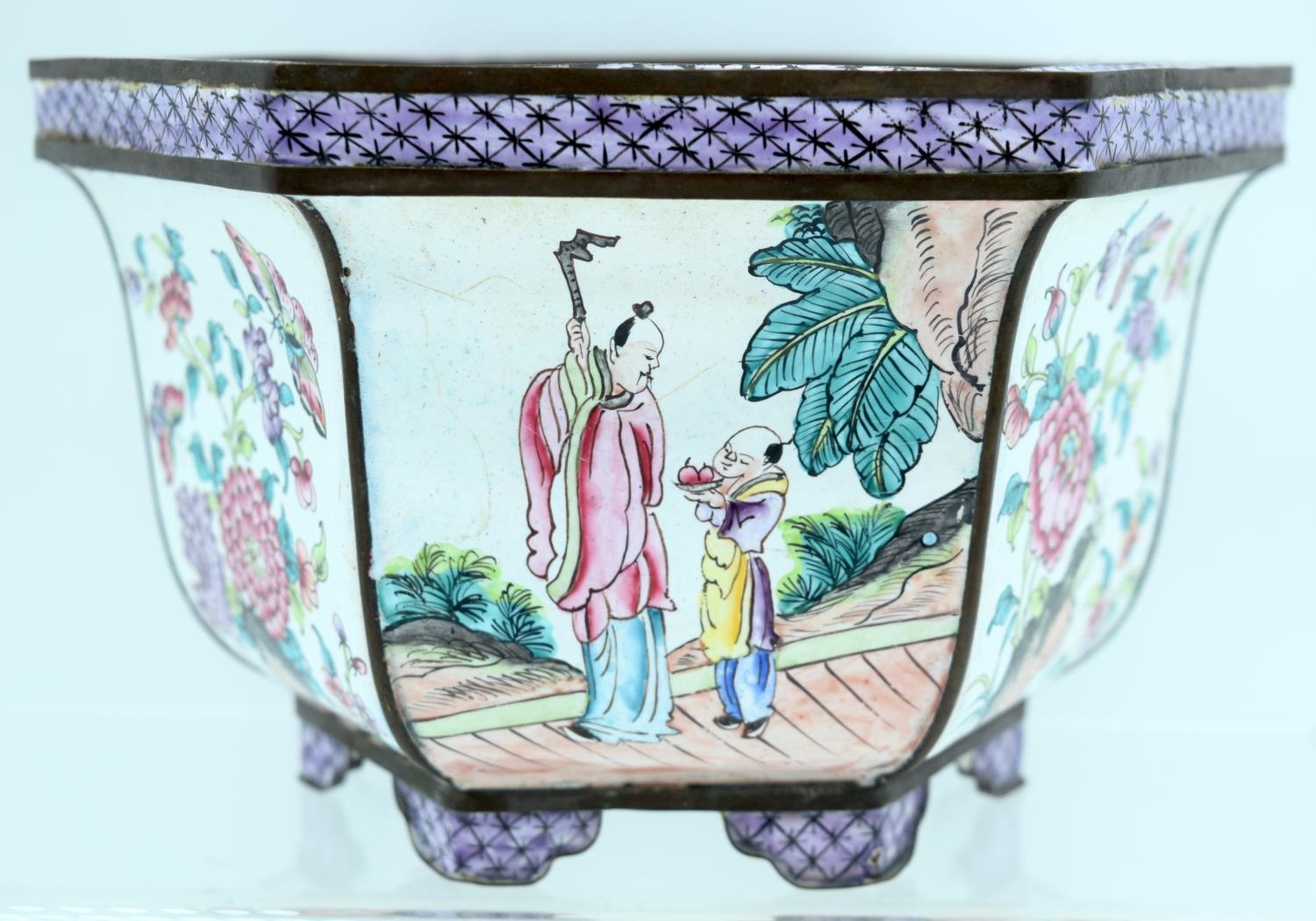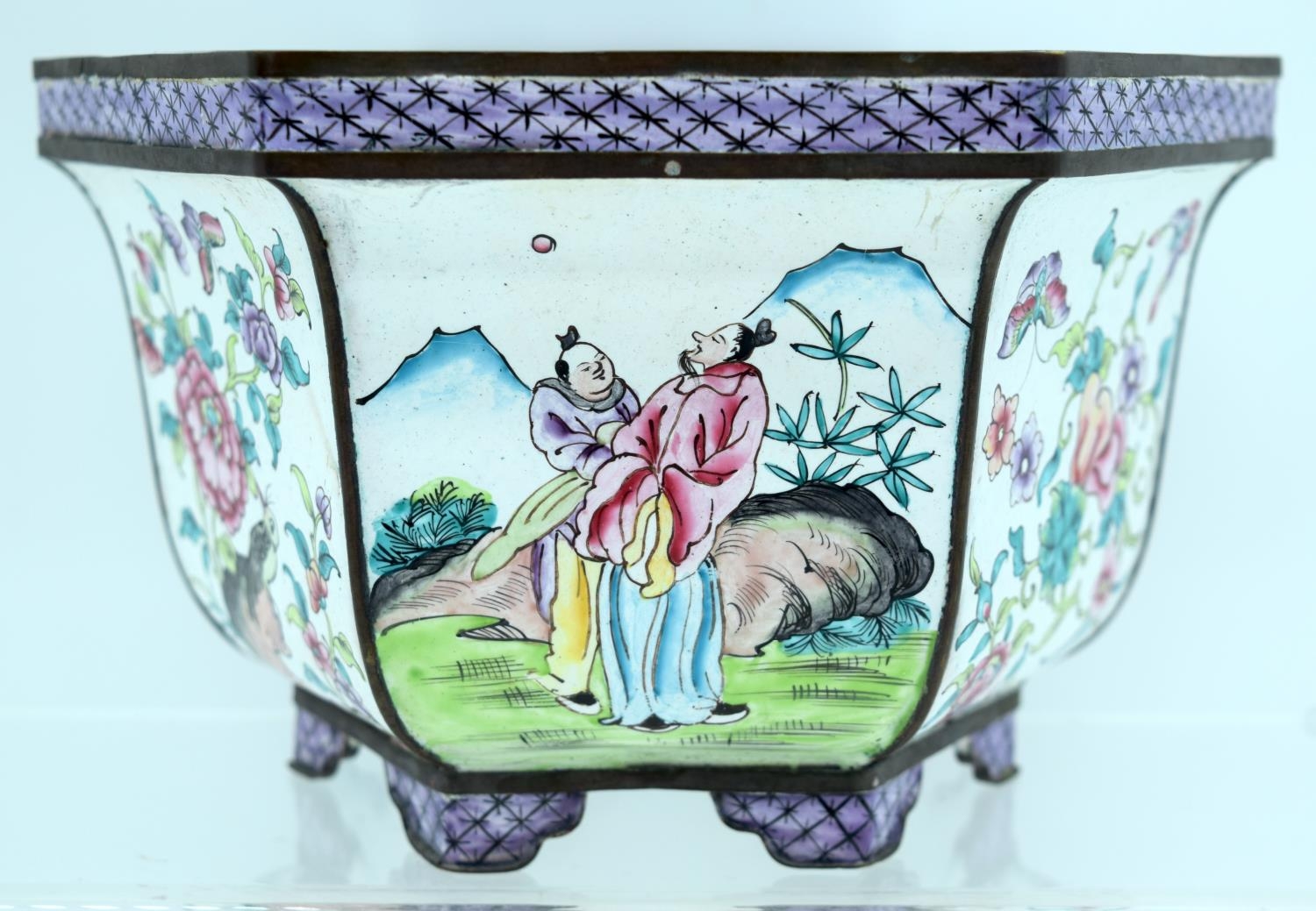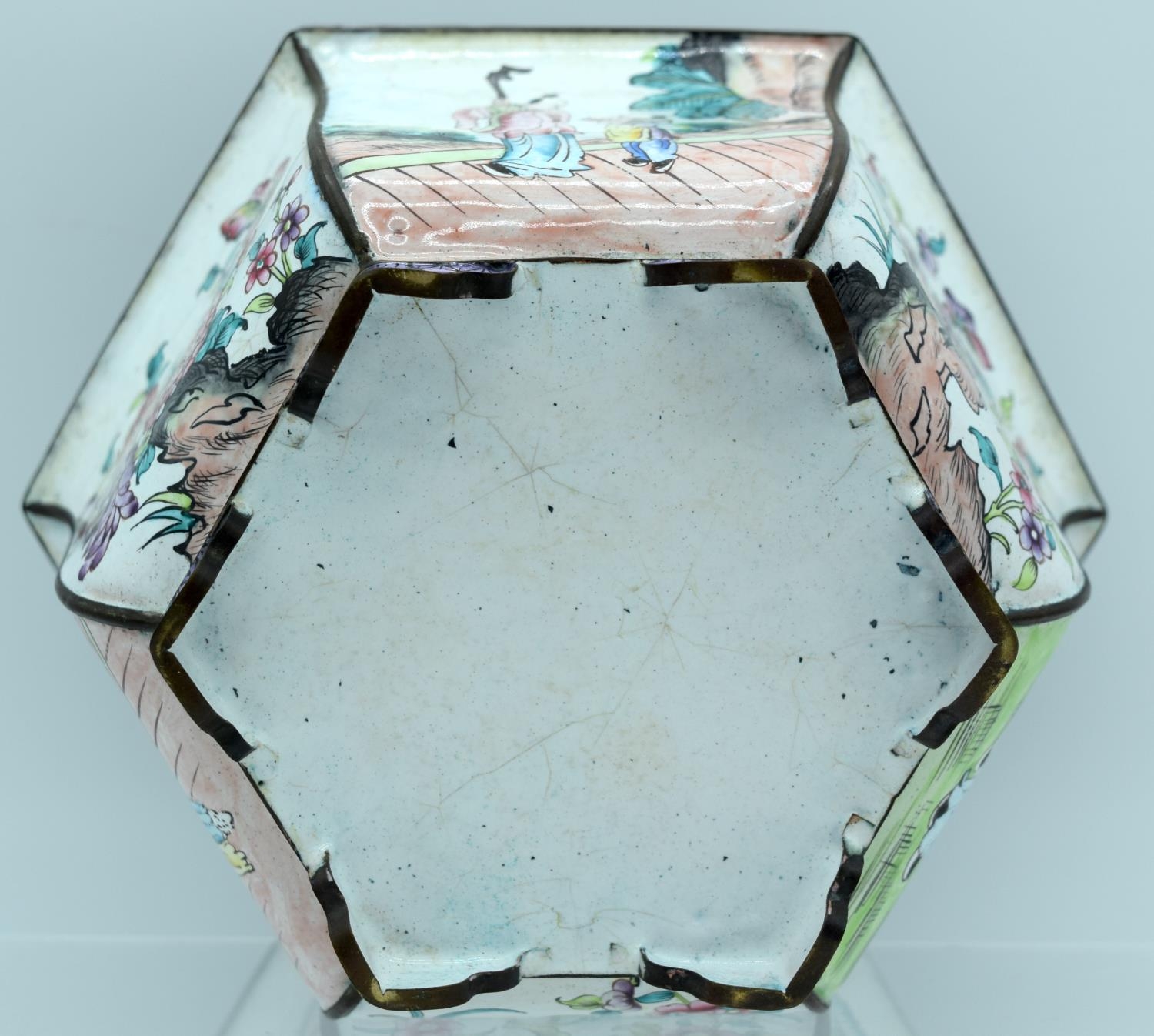 AN EARLY 20TH CENTURY CHINESE CANTON ENAMEL HEXAGONAL JARDINIERE Late Qing, painted with figures within landscapes. 18 cm x 11 cm.
