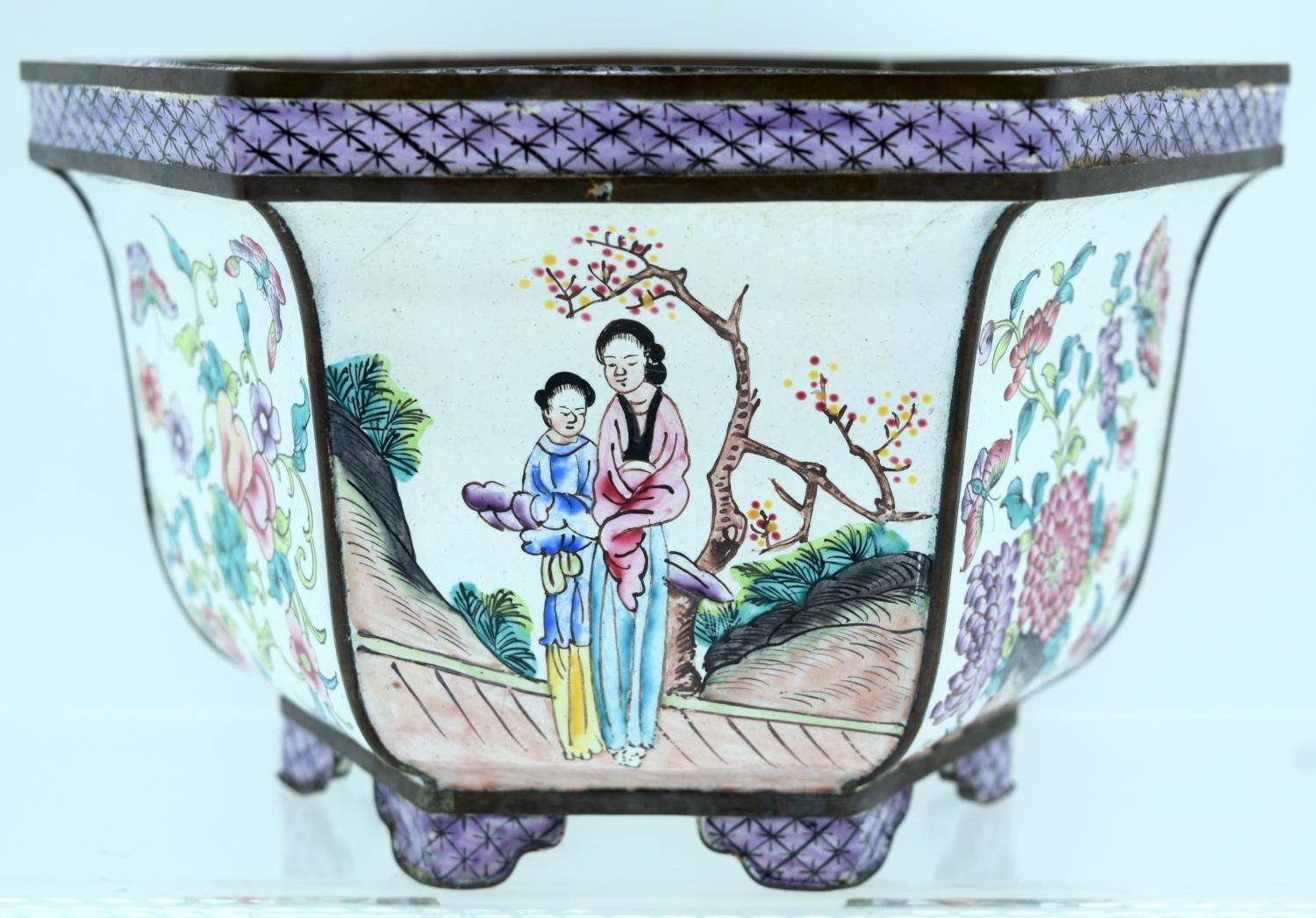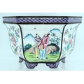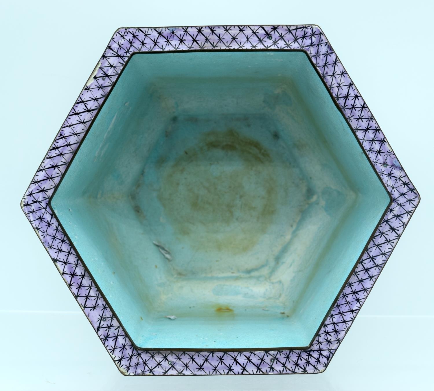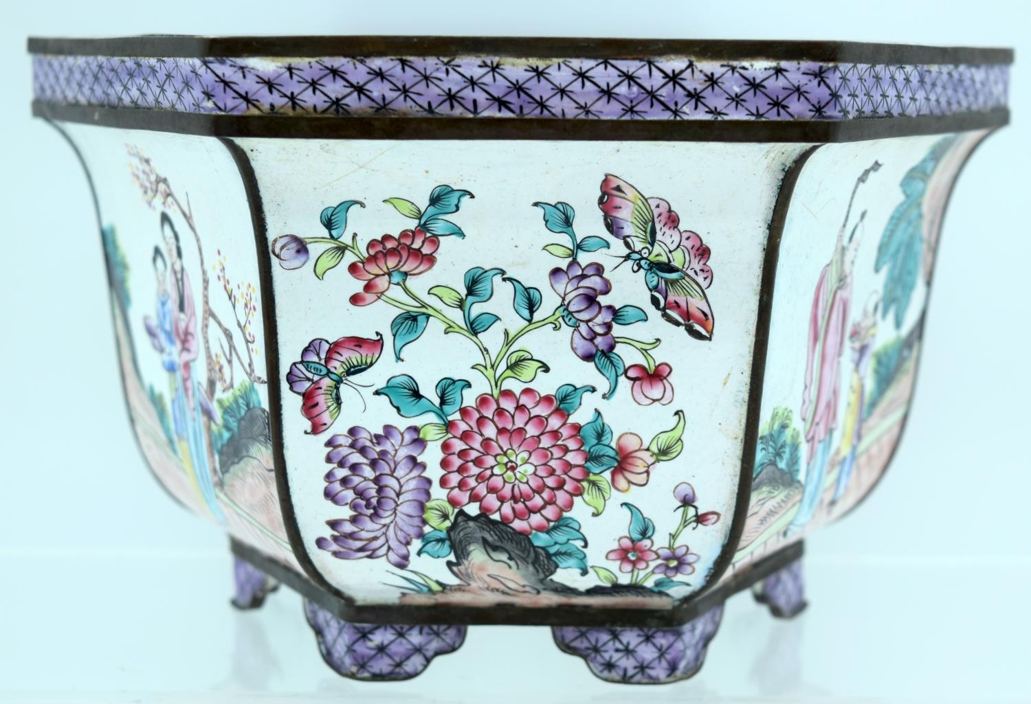 AN EARLY 20TH CENTURY CHINESE CANTON ENAMEL HEXAGONAL JARDINIERE Late Qing, painted with figures within landscapes. 18 cm x 11 cm.