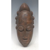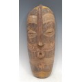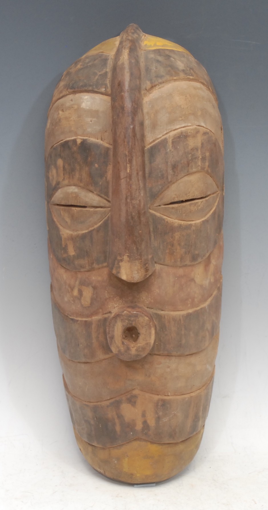 Tribal Art - a Baule mask, concave profile, pursed lips, horizontal pattern painted in alternating tones of white and black, pursed lips, 43cm long, Ivory Coast, West Africa