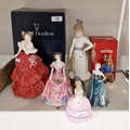 Collection of figures of ladies, various printed marks, including a Royal Doulton figure of Joy HN4054 (20.5cm high), a Coalport figure of Penelope, Francesca Art China Staffordshire figure of a lady table bell, a Coalport figure of Cinderella's Ball, a Nao figure of a girl with a hoop, a Bunnykins Figure of the Year 2004 Winter Lapland with box and a Royal Doulton box (6)