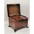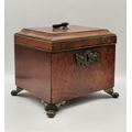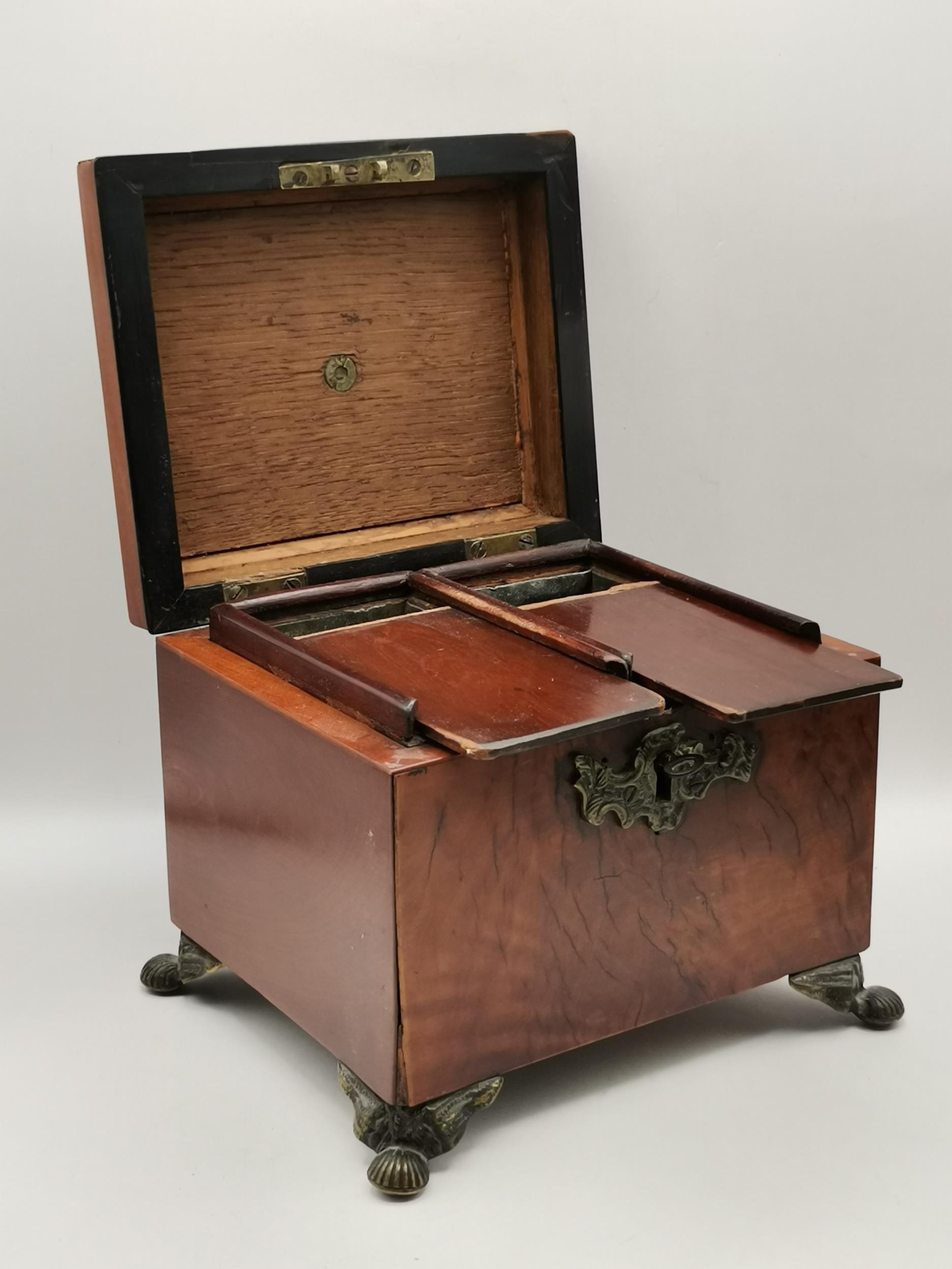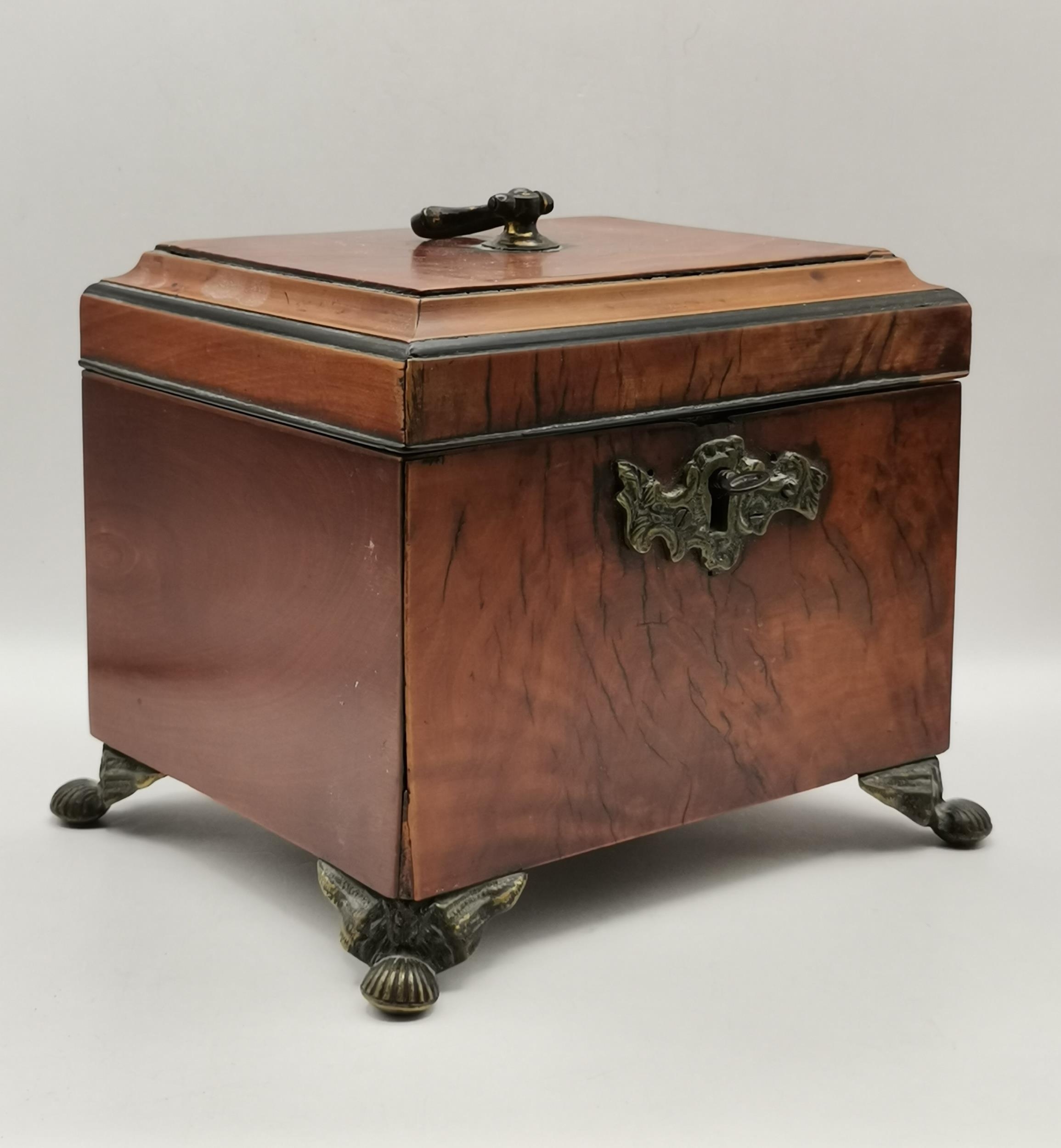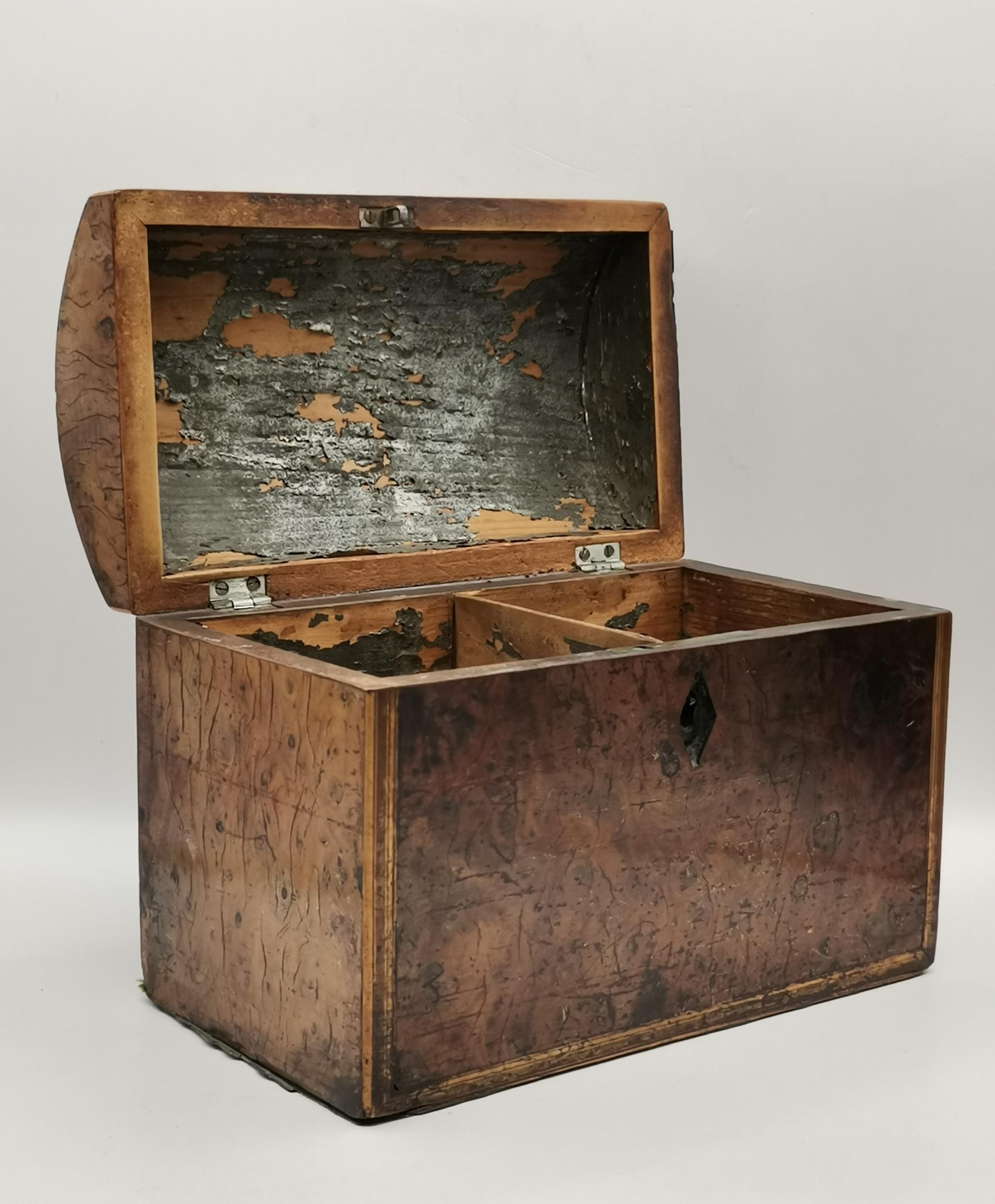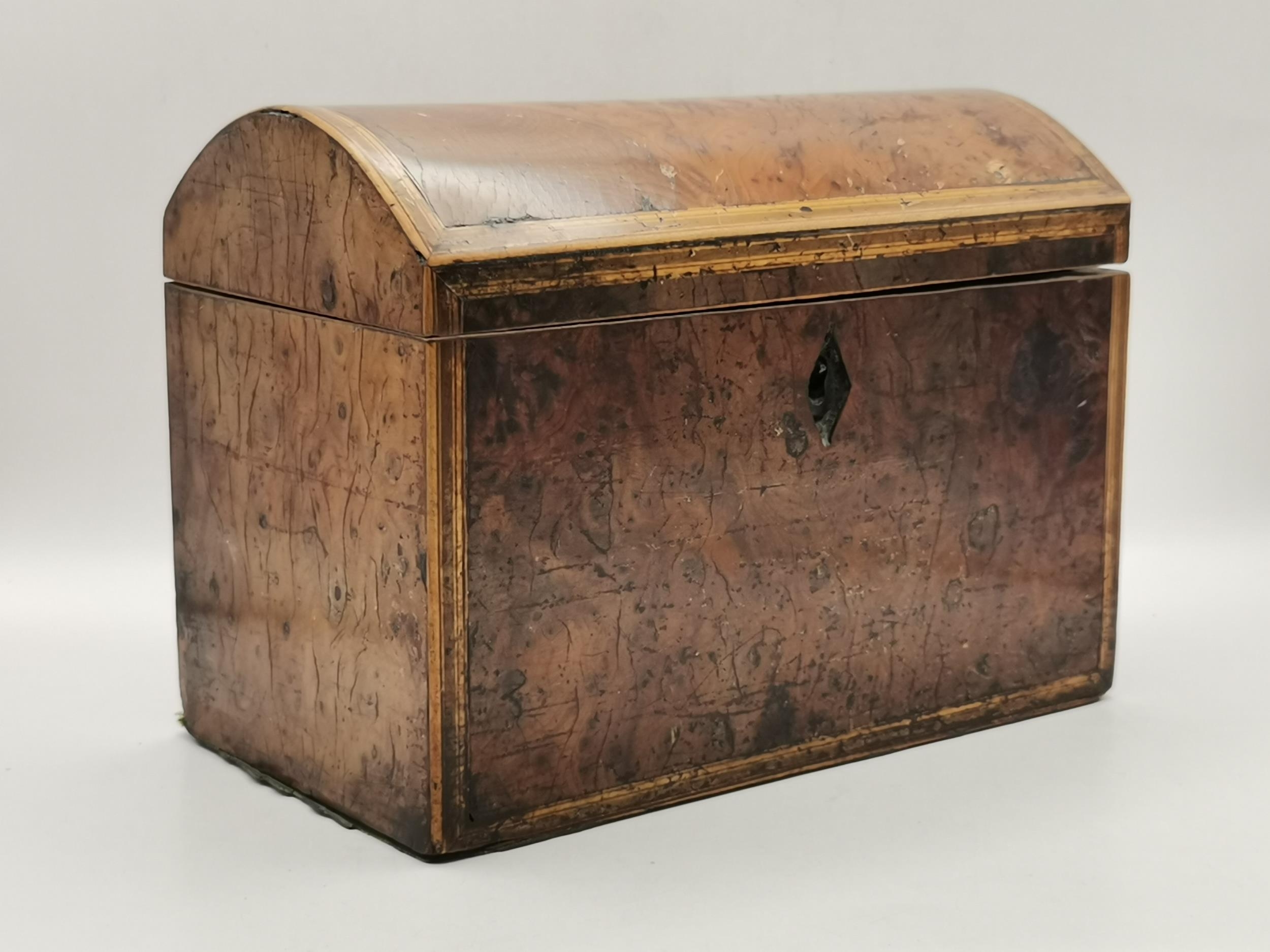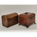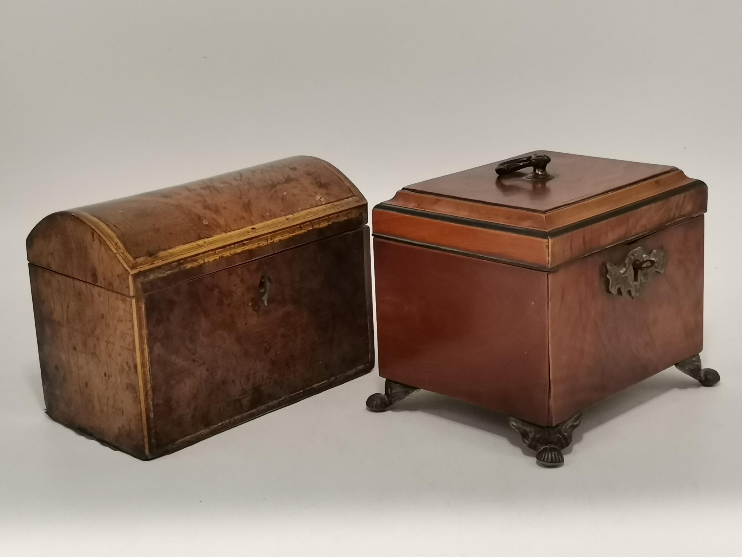 Two Georgian Tea Caddys - one Georgian with stepped top with original handle and lock raised on Ogee bracket feet 16cm x 13cm x H14cm plus Domed banded walnut tea caddy 19cm x 11cm x H14cm
