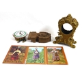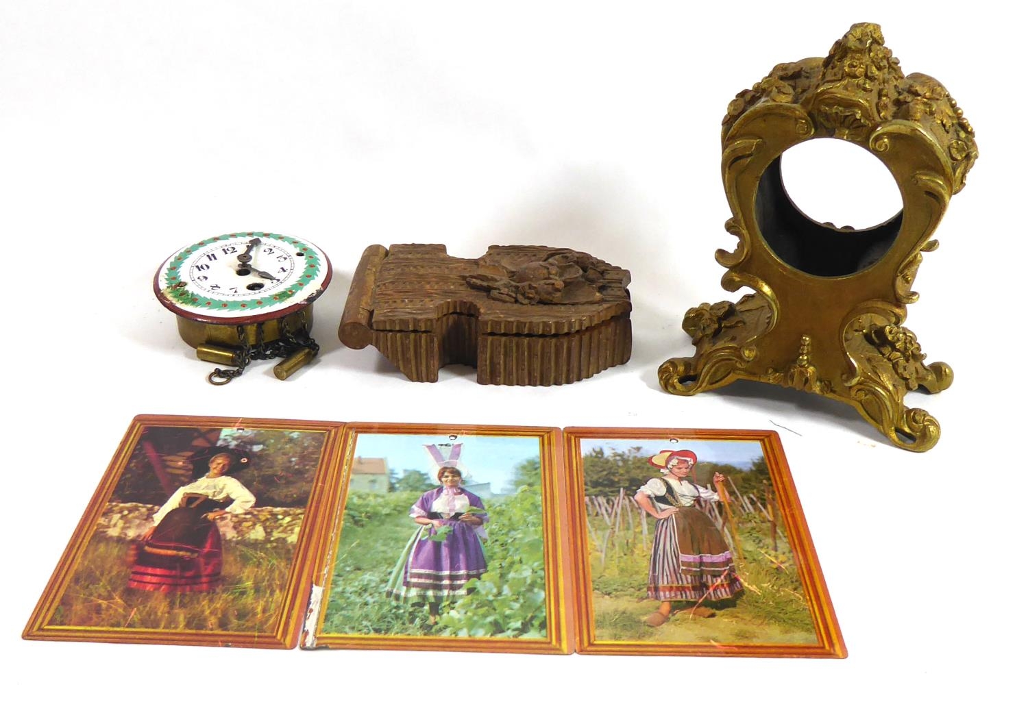 Hand painted enamel dial with two drop weights, together with a Rococo form gilt brass clock case and a carved wooded pocket watch holder/stand and three French enamel portrait photographs.