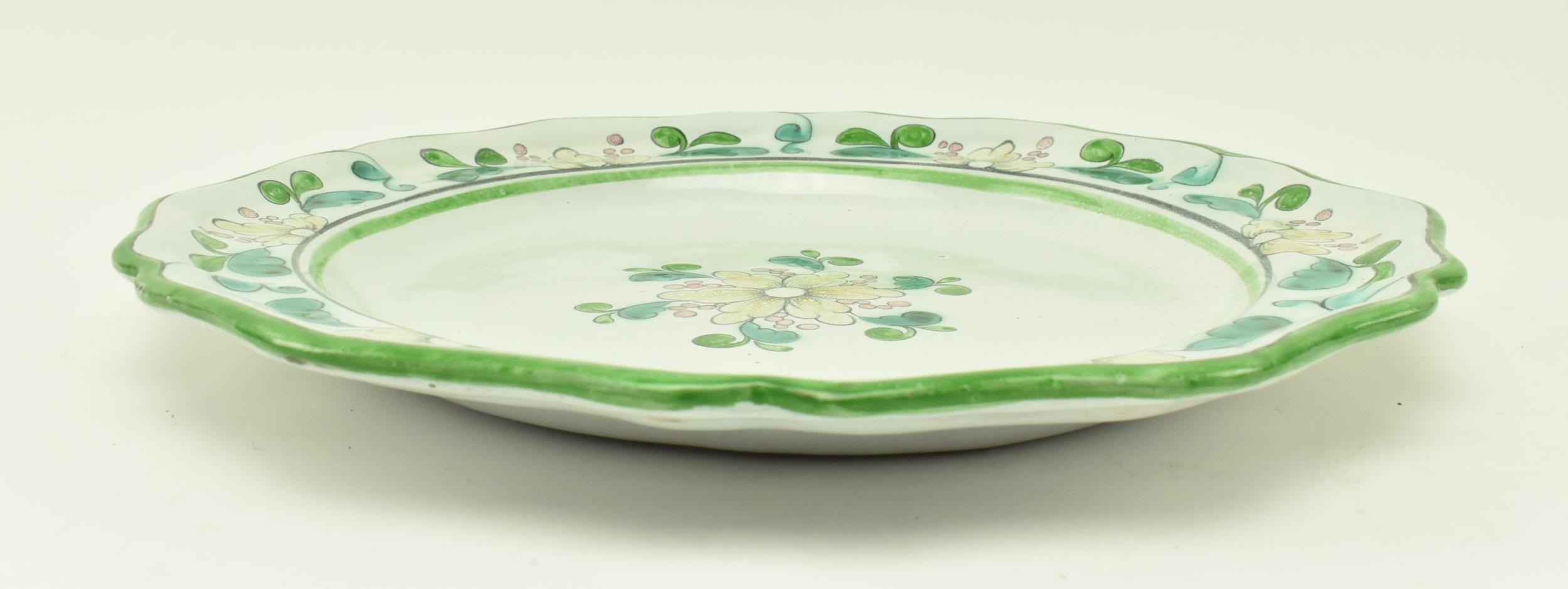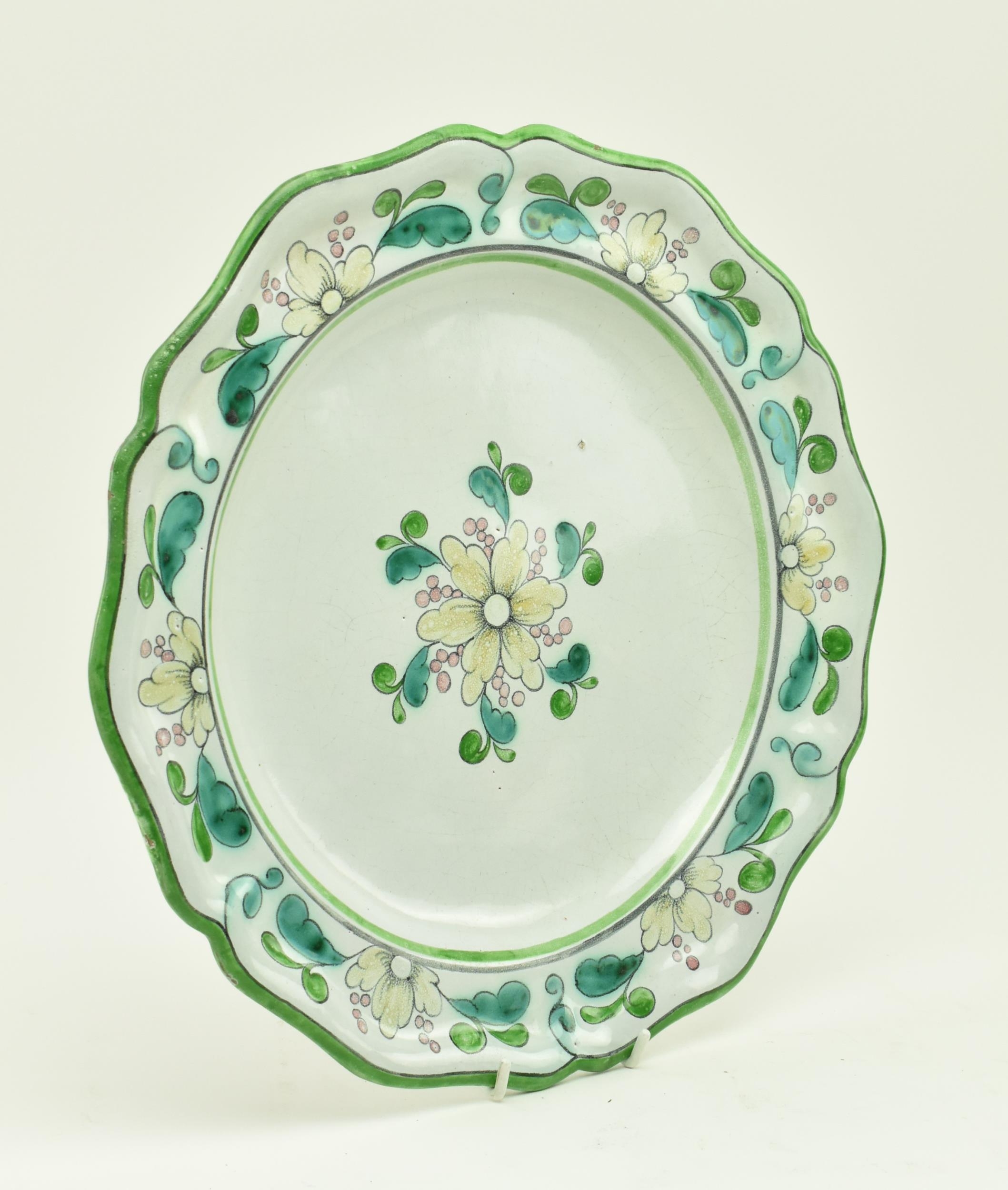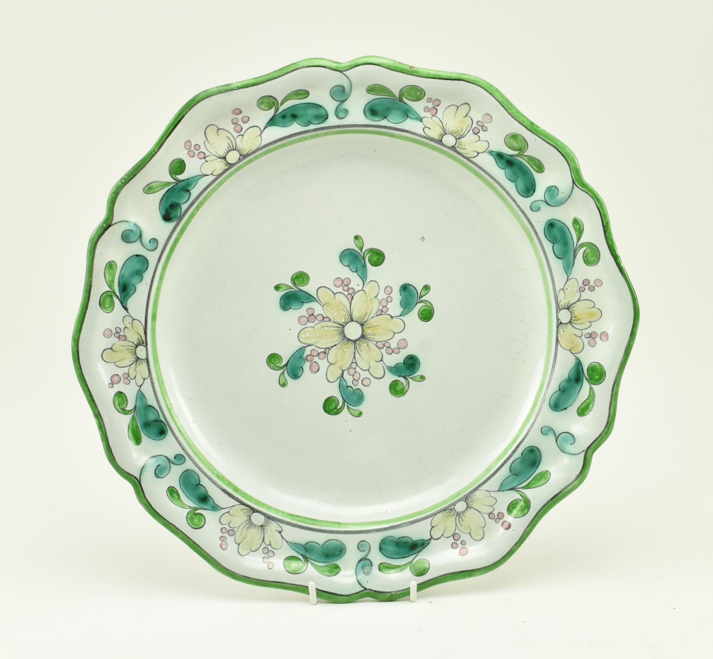 A 18th century Italian continental ceramic charger. The lettuce rim charger decorated with hand painted flowers and foliage scrolling on the rim. Flower and vignette leaves in the centre of the plate. Marked to the base. Measures approx. 34.5cm diameter.