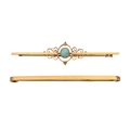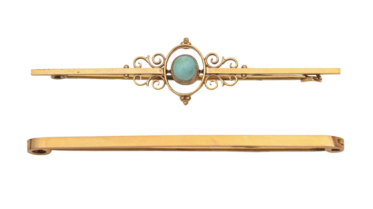 A turquoise bar brooch, early 20th c, in gold, 63mm l, marked 9ct and a plain gold brooch, also marked 9ct, 5.1g (2)