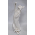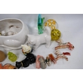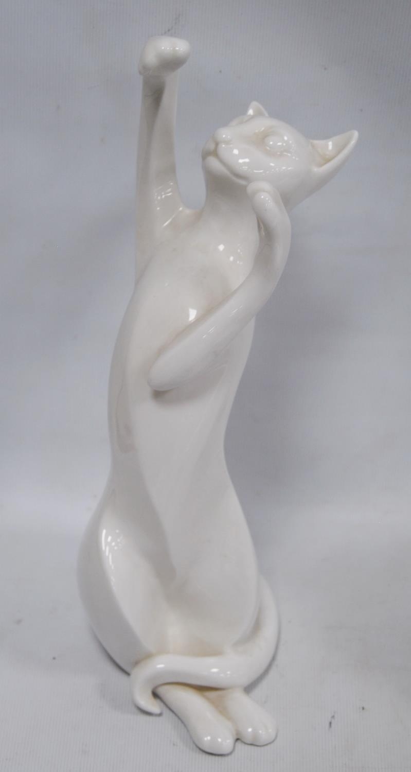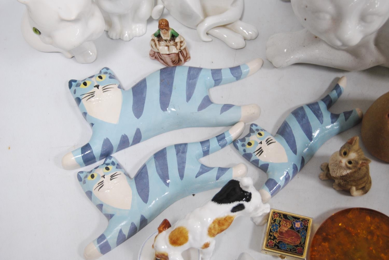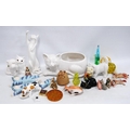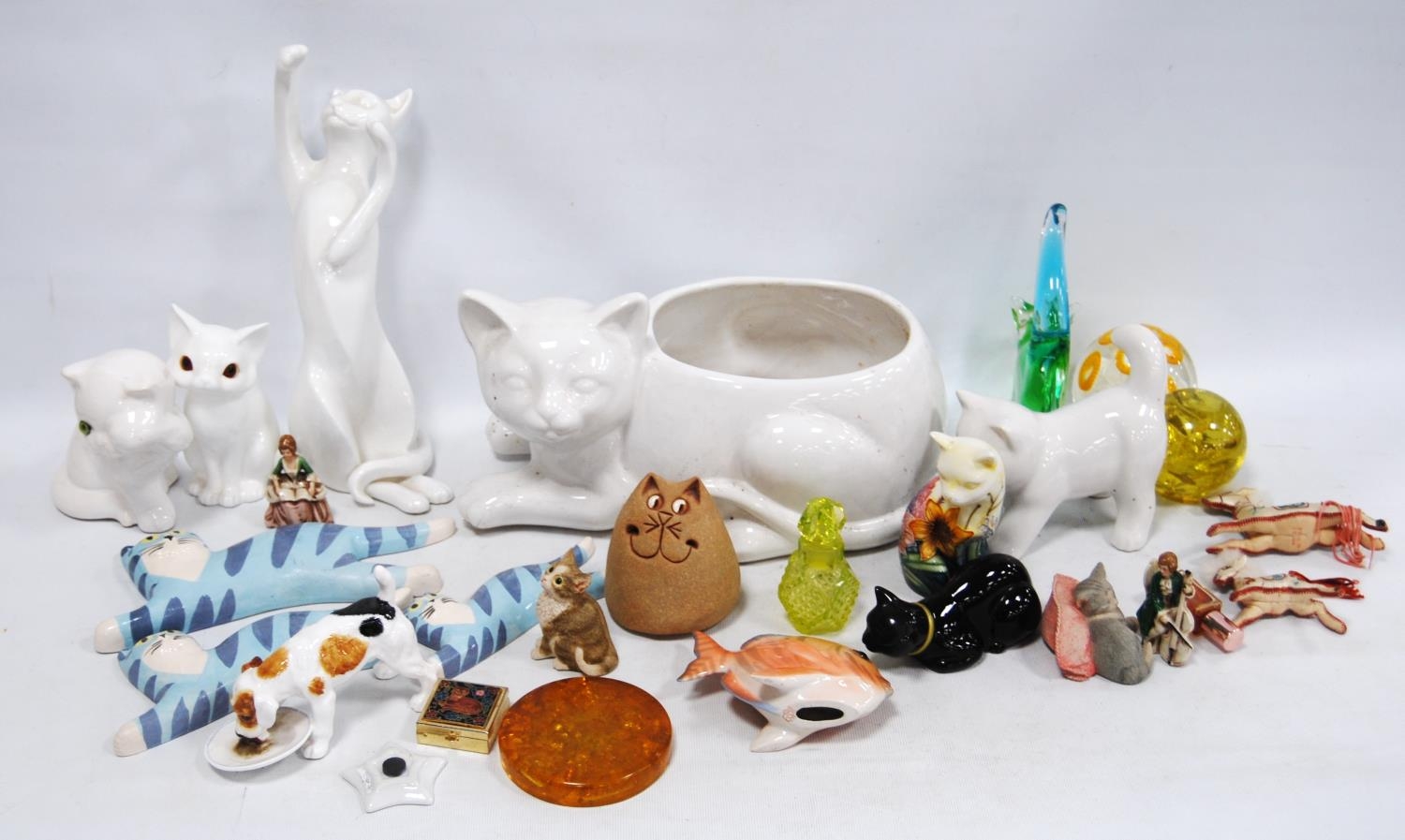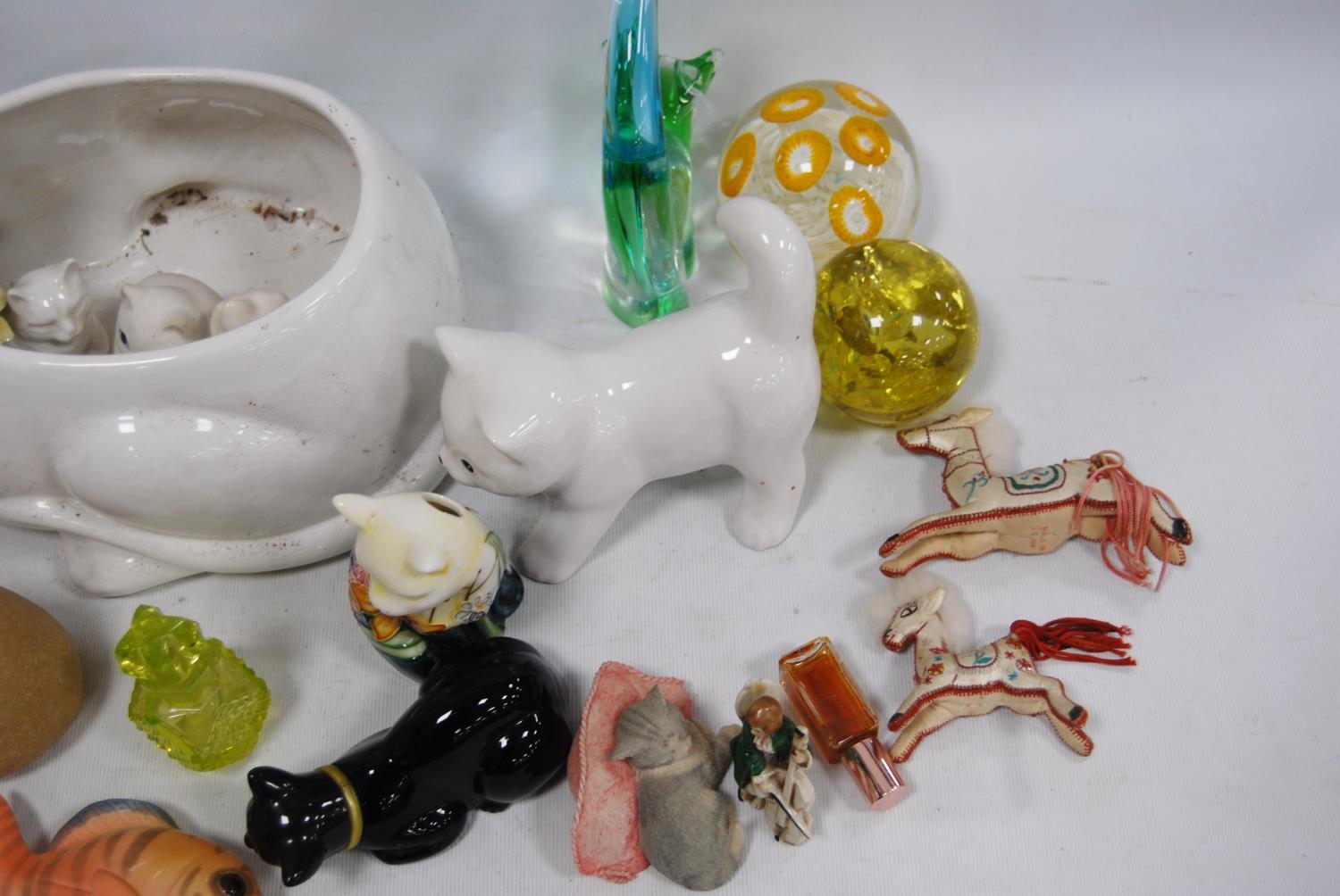 Collection of ceramic and glass cat ornaments, glass paperweight and other glass ornaments.