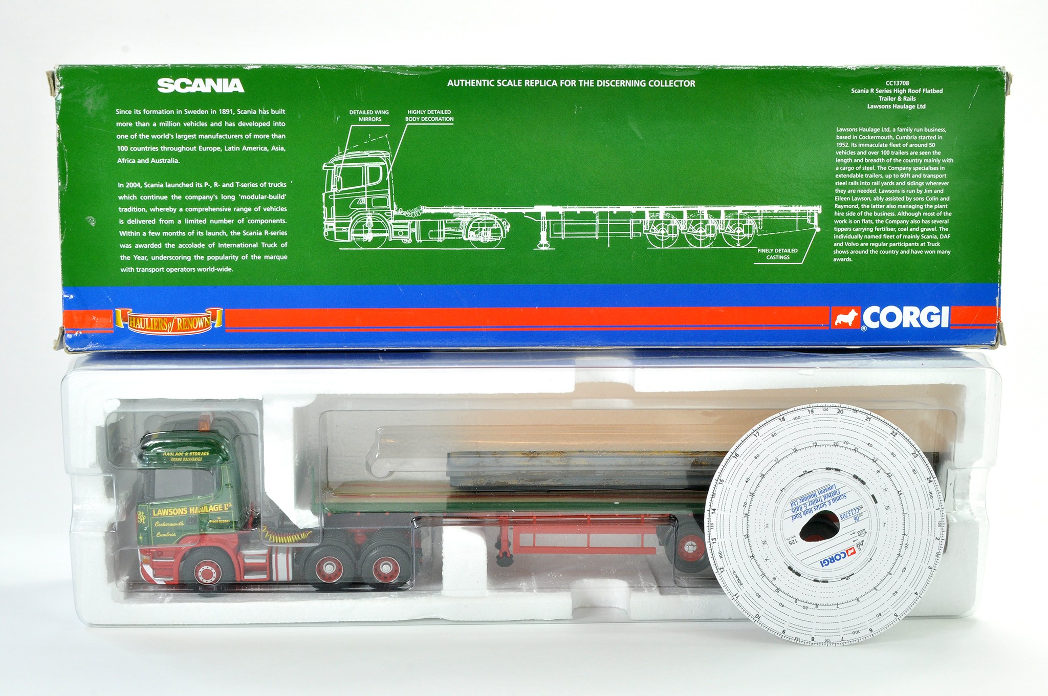 Corgi Diecast Model Truck issue comprising No. CC13708 Scania R Series Flatbed Trailer in the livery of Lawsons. Appears good, missing mirrors and inner packing pieces, likely displayed so possibly some light cosmetic wear in places.