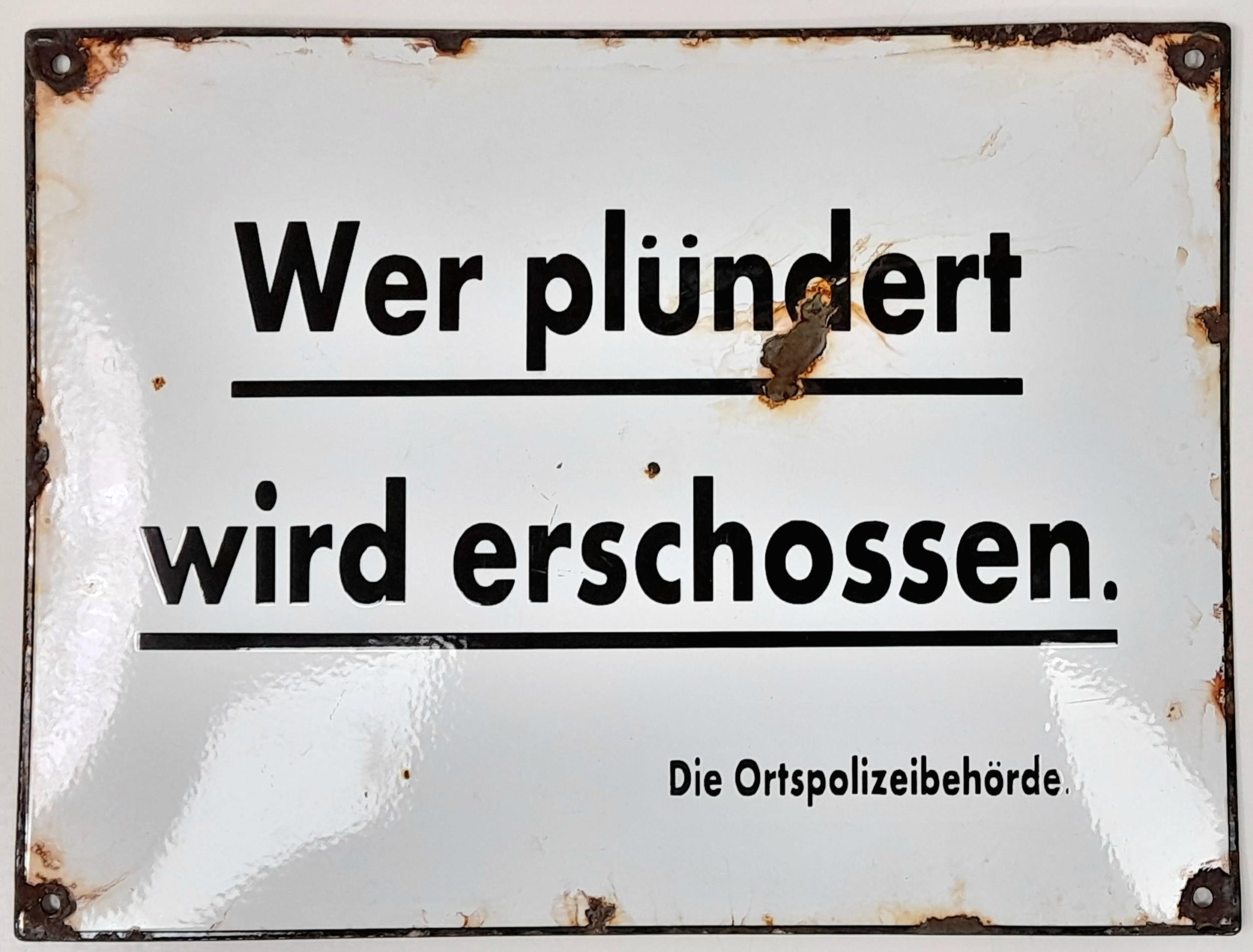 A 1944 Dated German Enamel Sign. THOSE WHO PLUNDER WILL BE SHOT” This is an original sign with smooth enamelled lettering and not raised screen printed like the cheap copies.