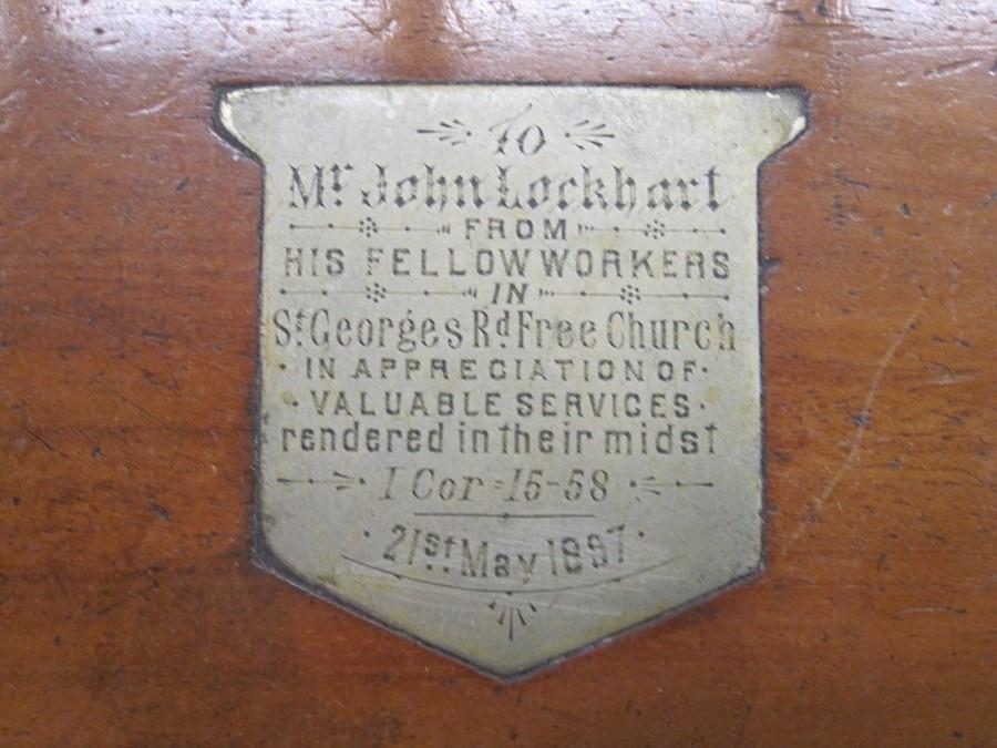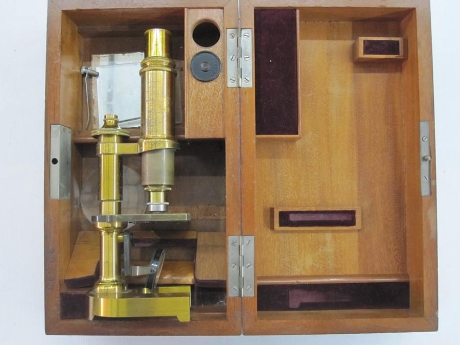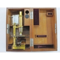 Late 19th century microscope by Leitz Wetzlar, marked to the foot no. 32348, in fitted wooden case, with inlaid inscription to lid of box ' To Mr. John Lockhart from his fellow workers in St. Georges Rd free church in appreciation of his valuable services in their midst 1 Cor 15-58, 21st May 1897'