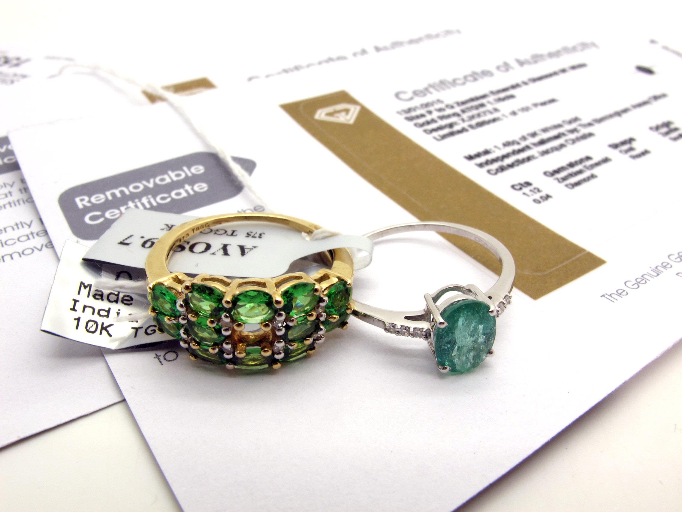 The Genuine Gemstone Company Ltd; A 9ct Gold Tsavorite Garnet and Diamond Dress Ring, allover claw set stones, between tapered shoulders (finger size O 1/2), A 9ct White Gold Zambian Emerald and Diamond ring, oval four claw stone, between inset shoulders (finger size Q) (total weight 4.5 grams) (2).