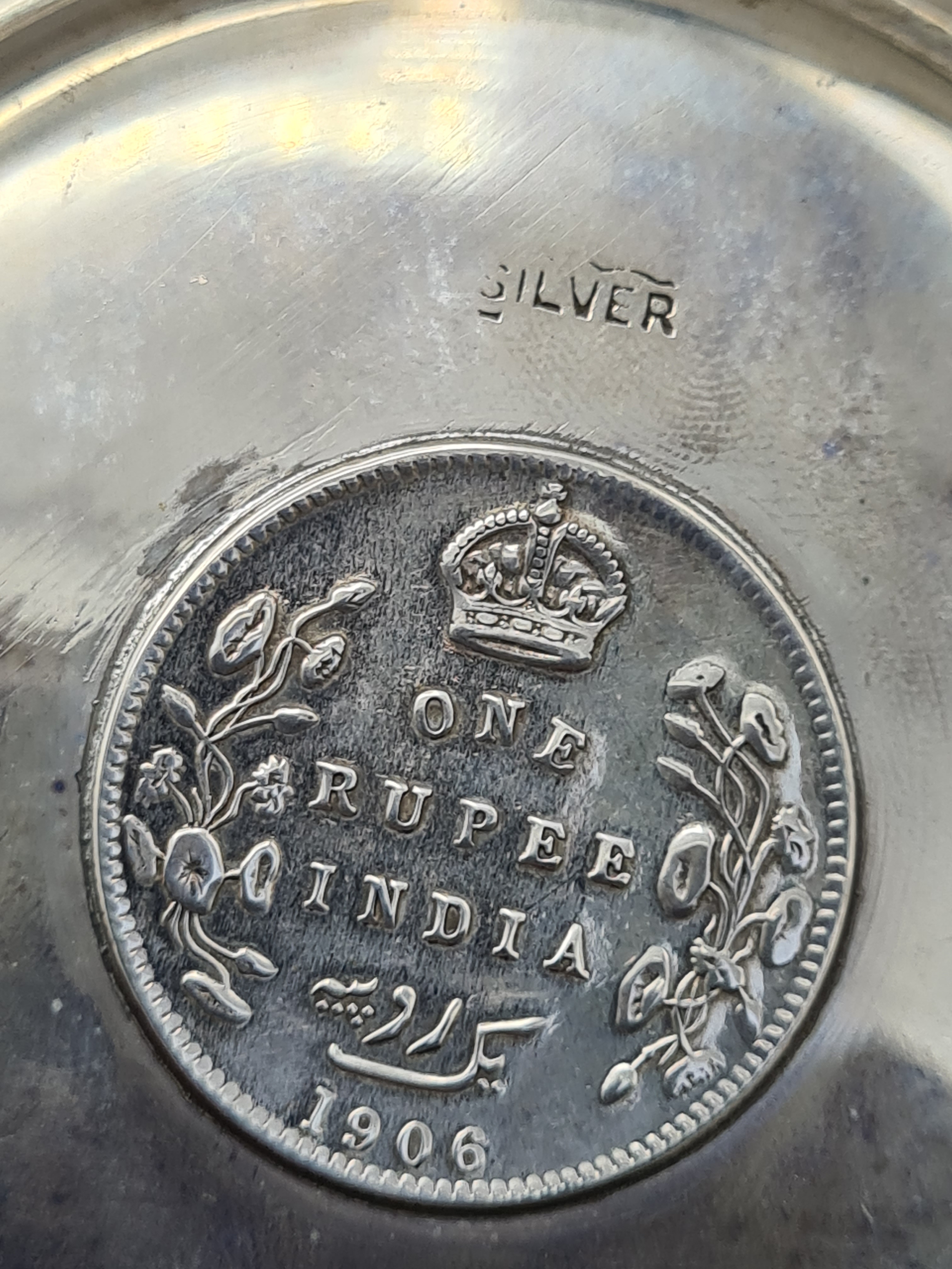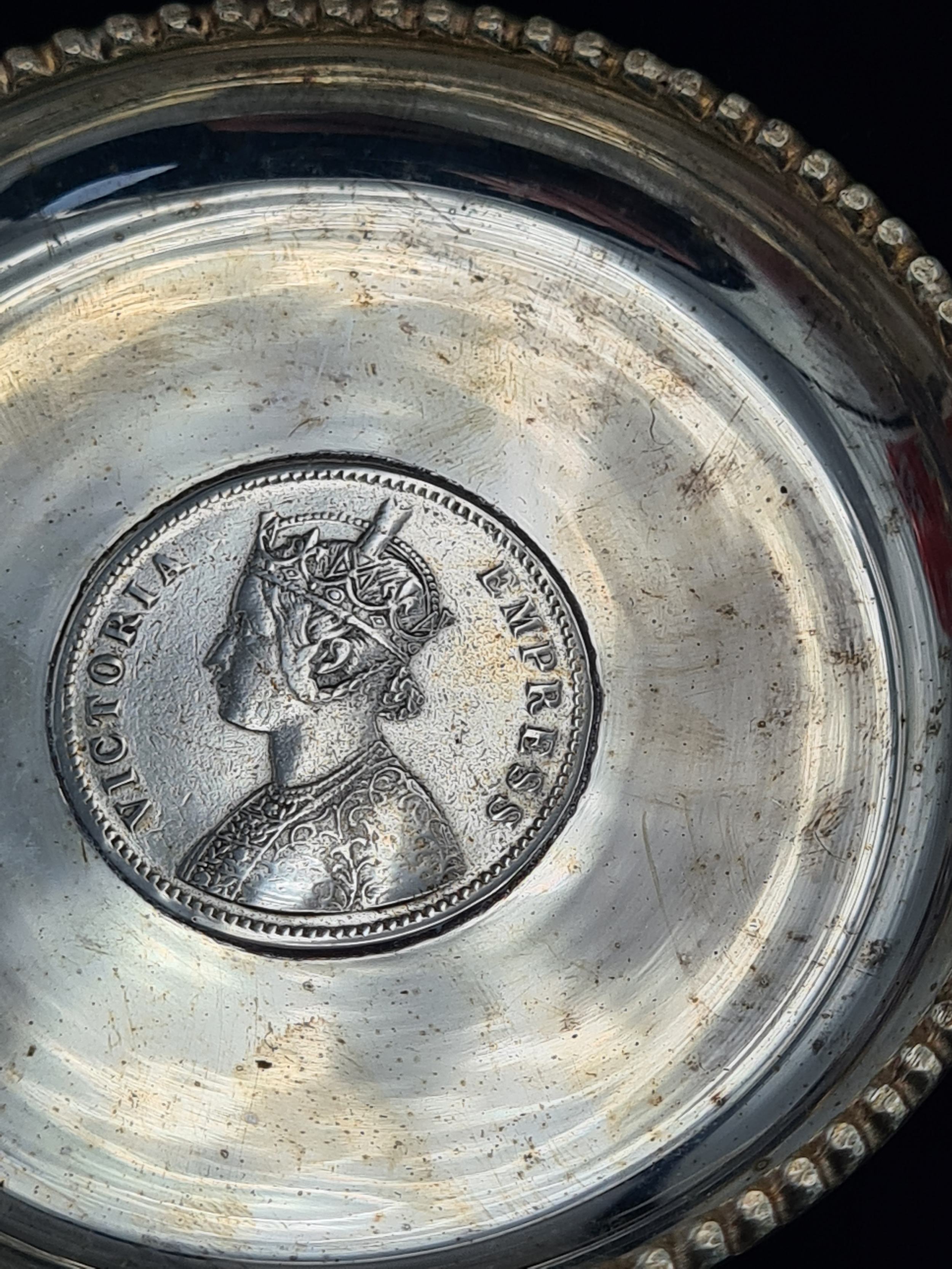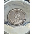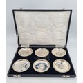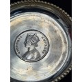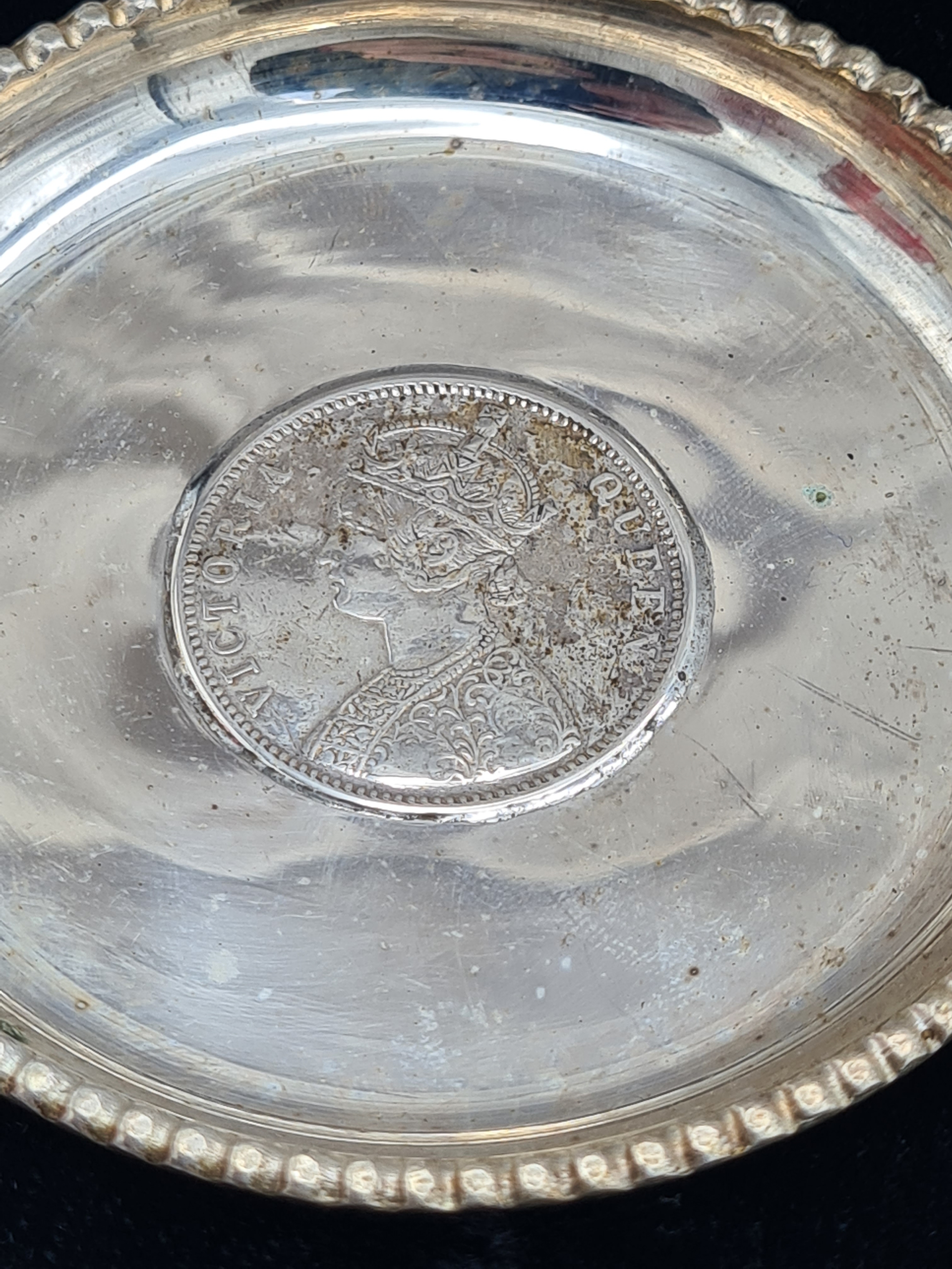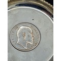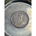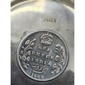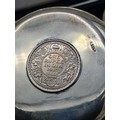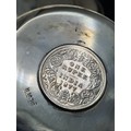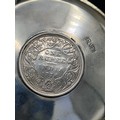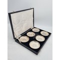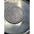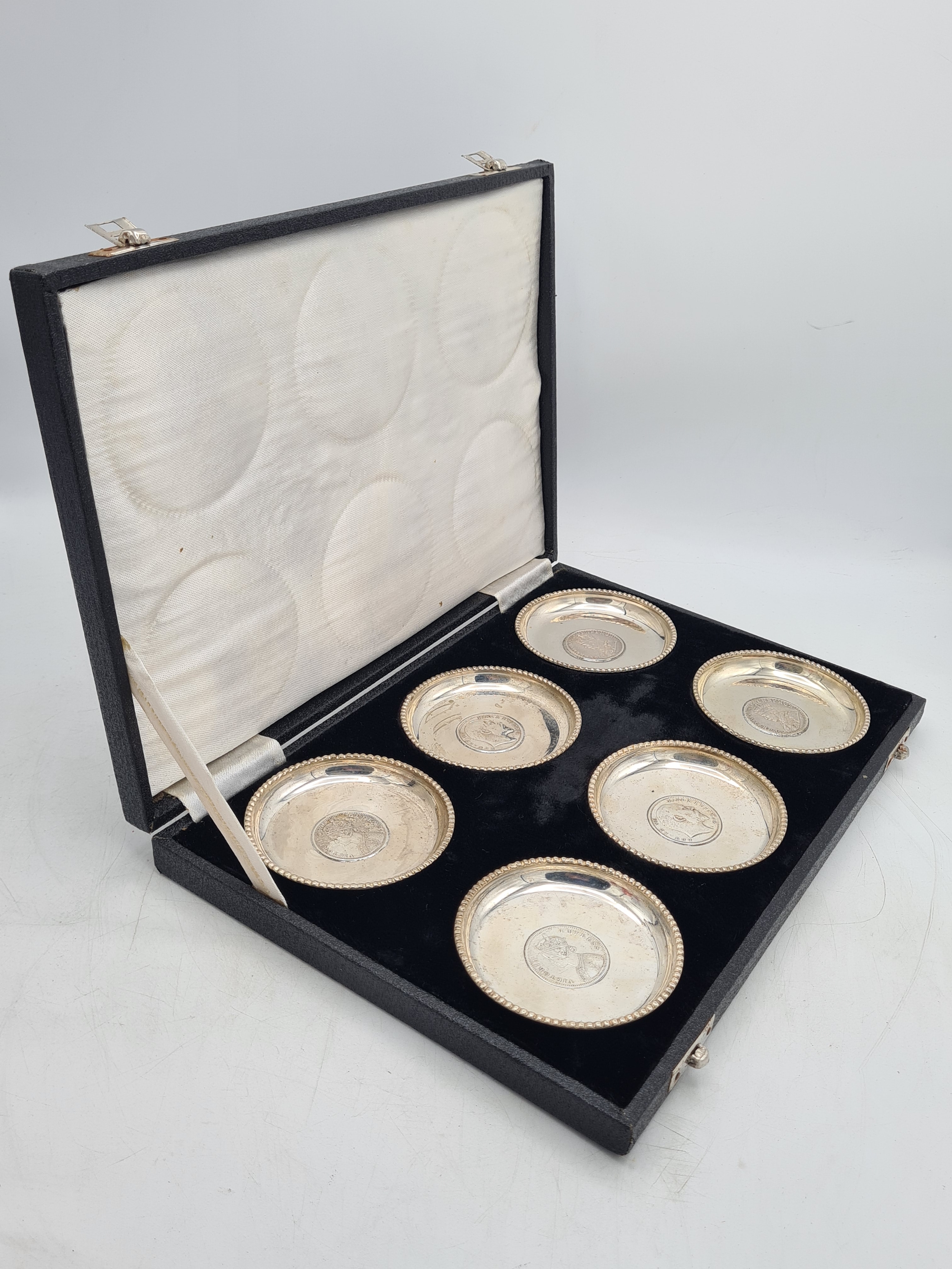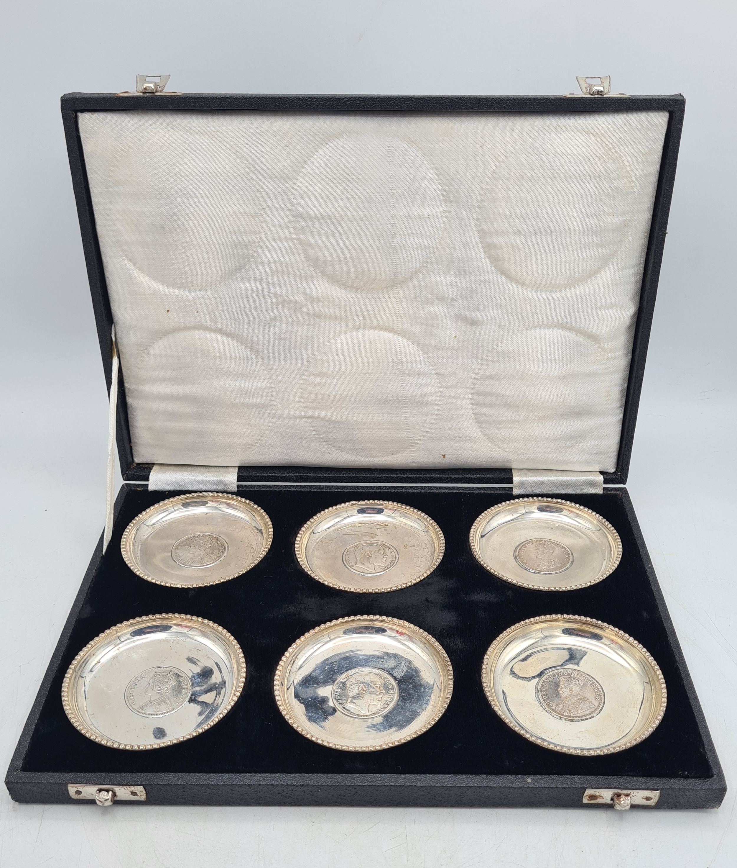 A presentation set of 6x 1 Indian Rupee Coin Silver Dishes, Each dish has an original coin in the middle and measures 8cm in diameter by 1 cm high. Dishes are all marked Silver and include coin years 1876, 1877, 1904, 1906, 1913 & 1917. The box measures 30cm x 21cm x3cm and has a red embossed crown on the lid.