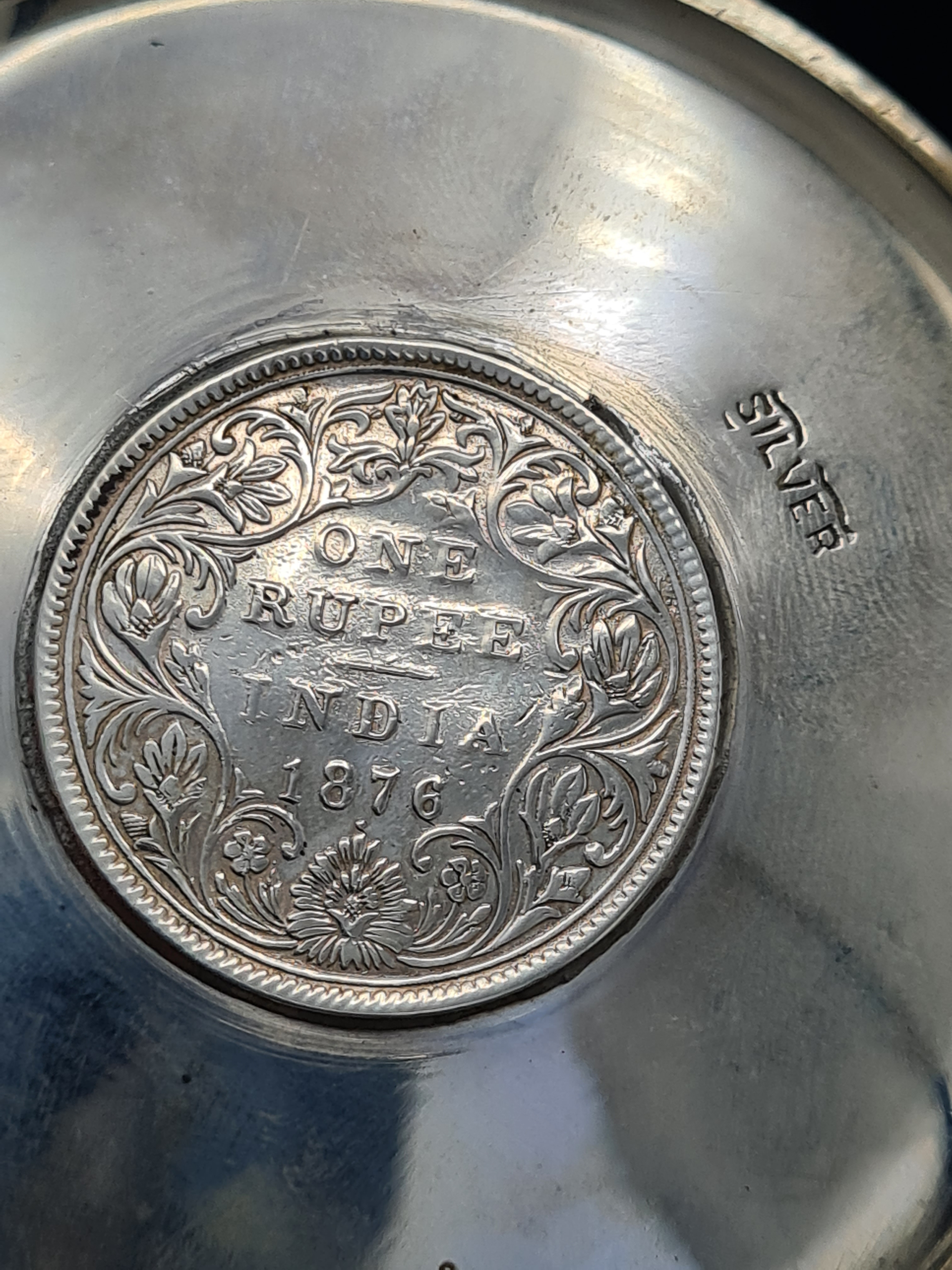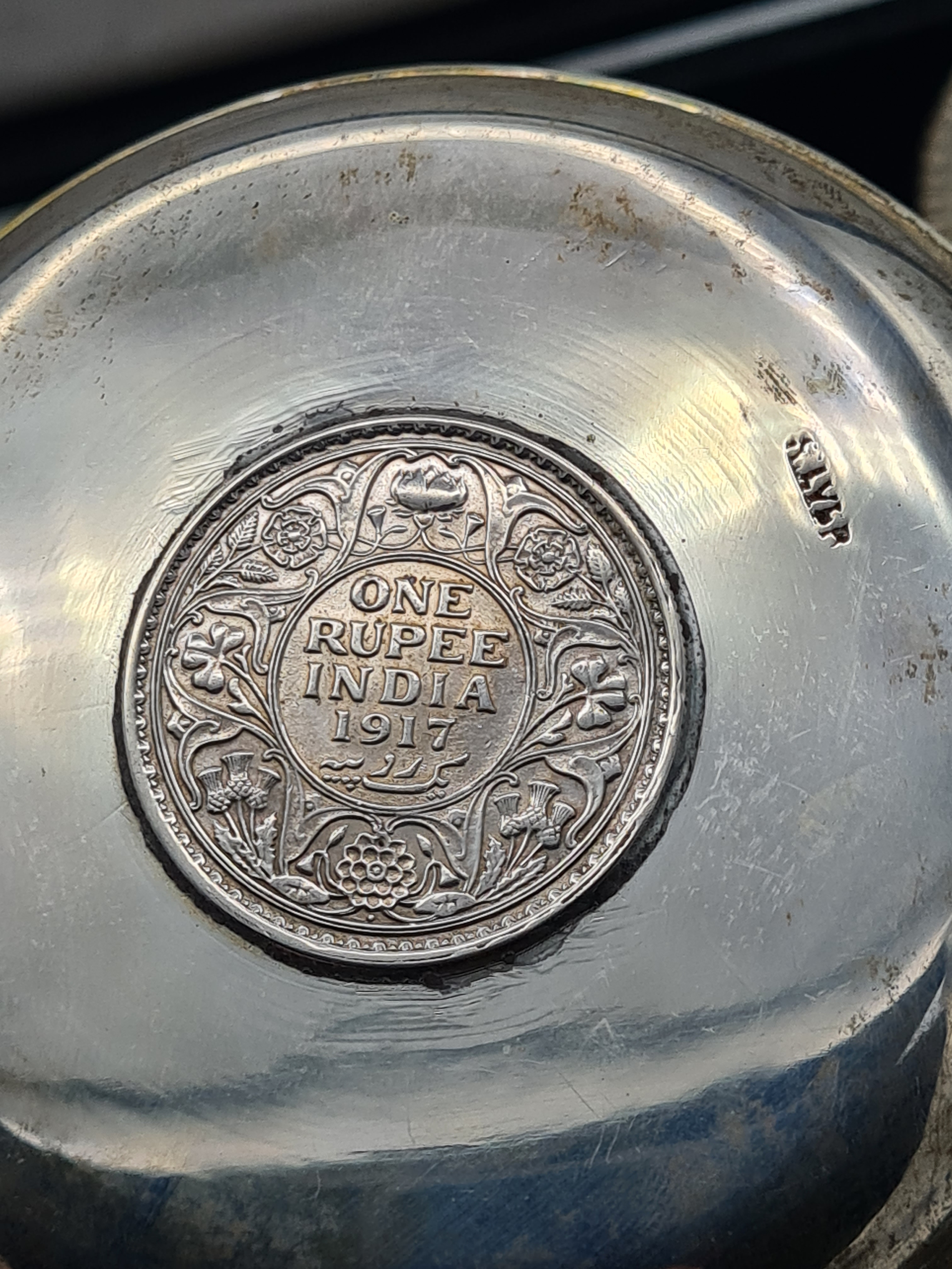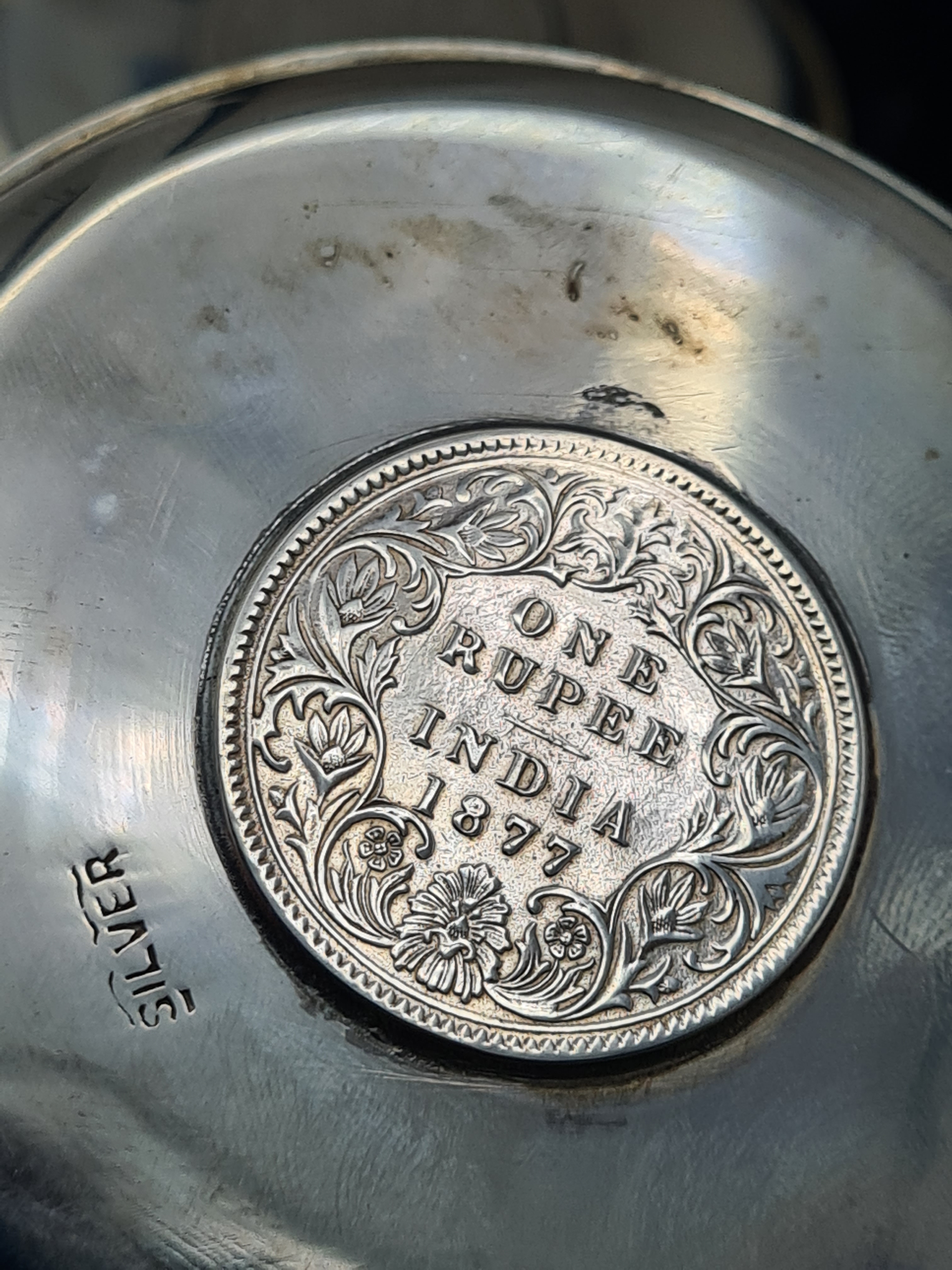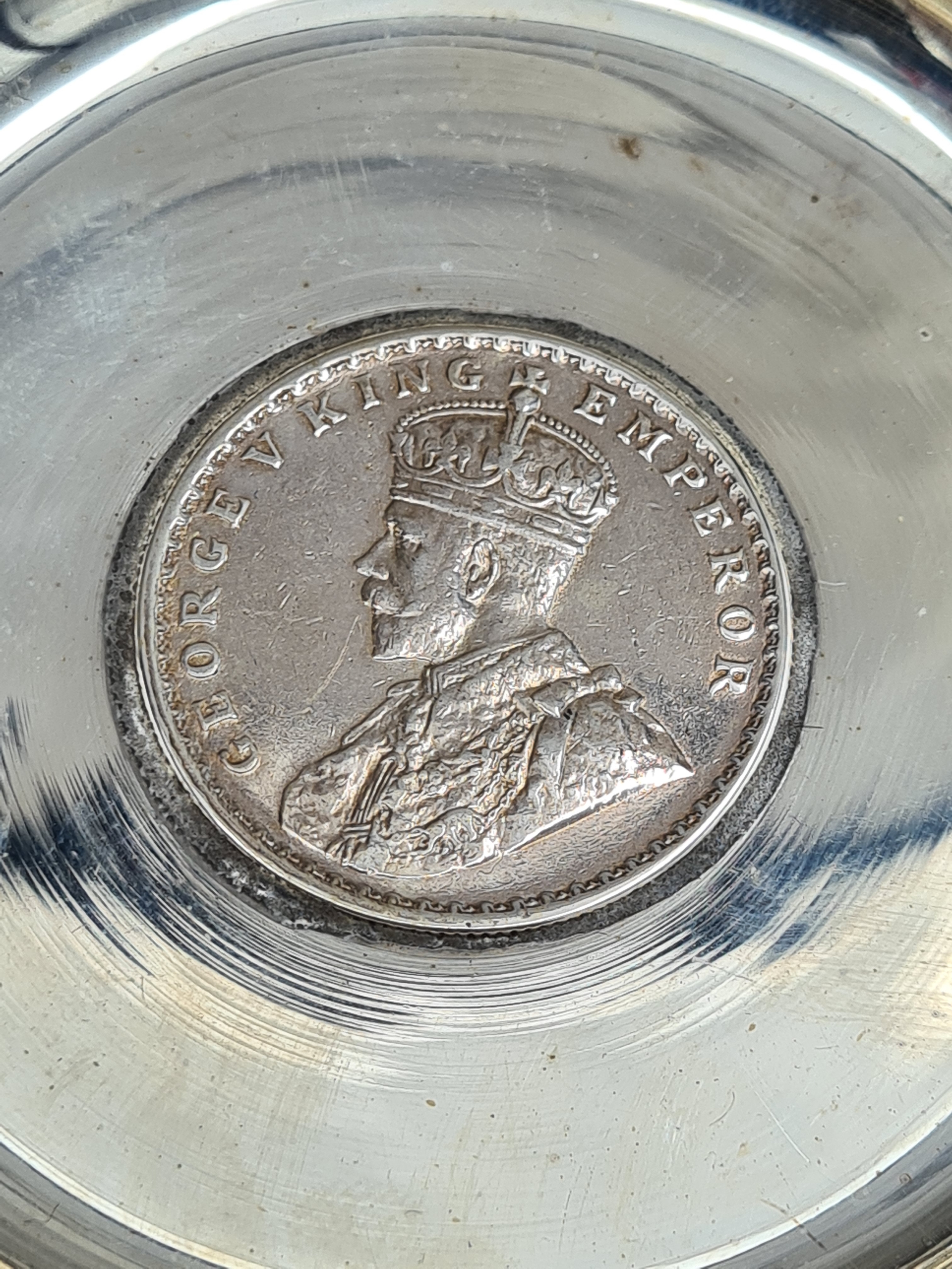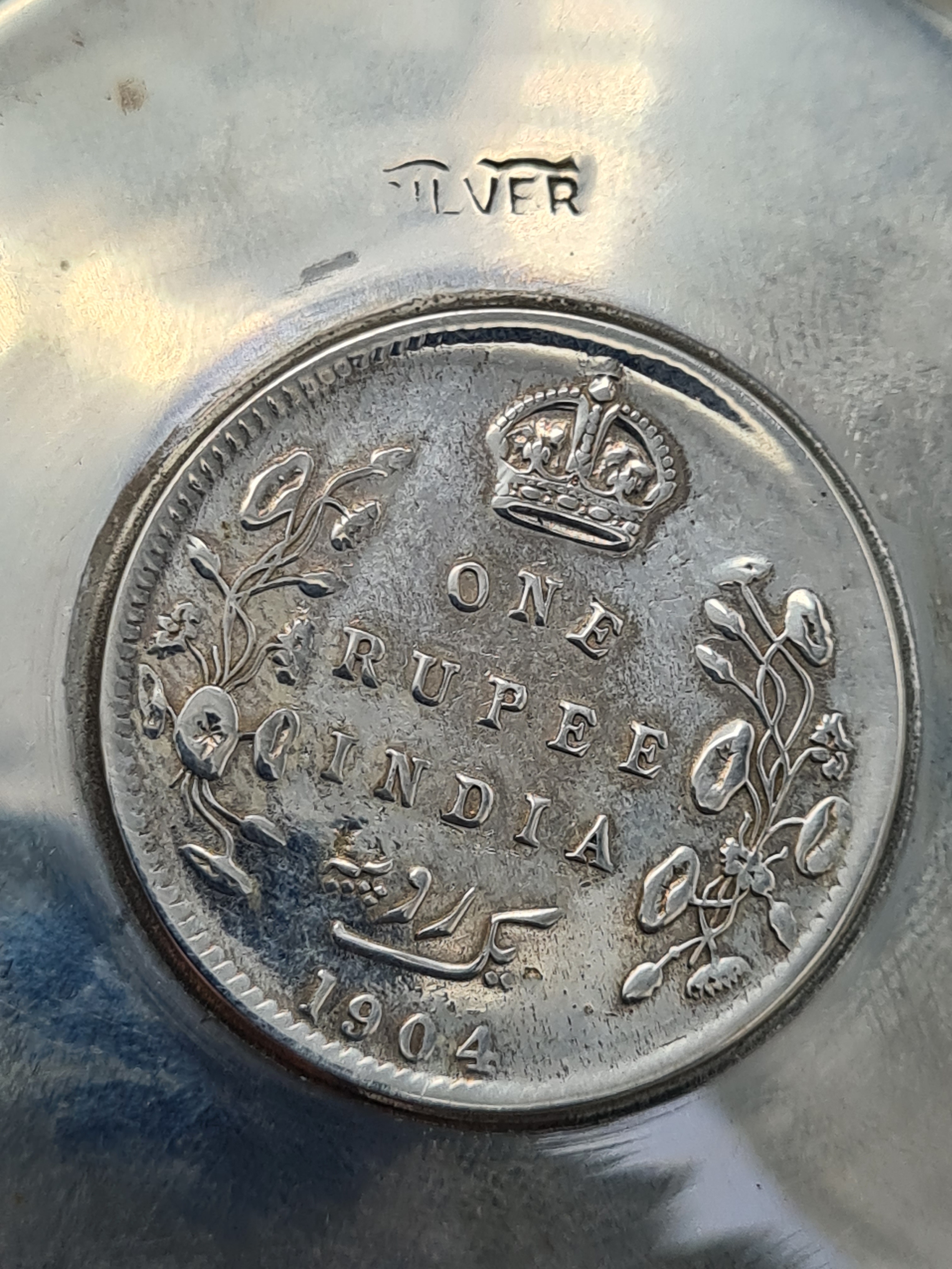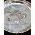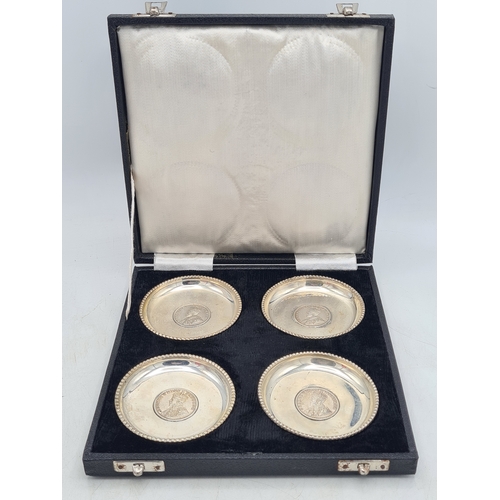 A presentation set of 6x 1 Indian Rupee Coin Silver Dishes, Each dish has an original coin in the middle and measures 8cm in diameter by 1 cm high. Dishes are all marked Silver and include coin years 1876, 1877, 1904, 1906, 1913 & 1917. The box measures 30cm x 21cm x3cm and has a red embossed crown on the lid.
