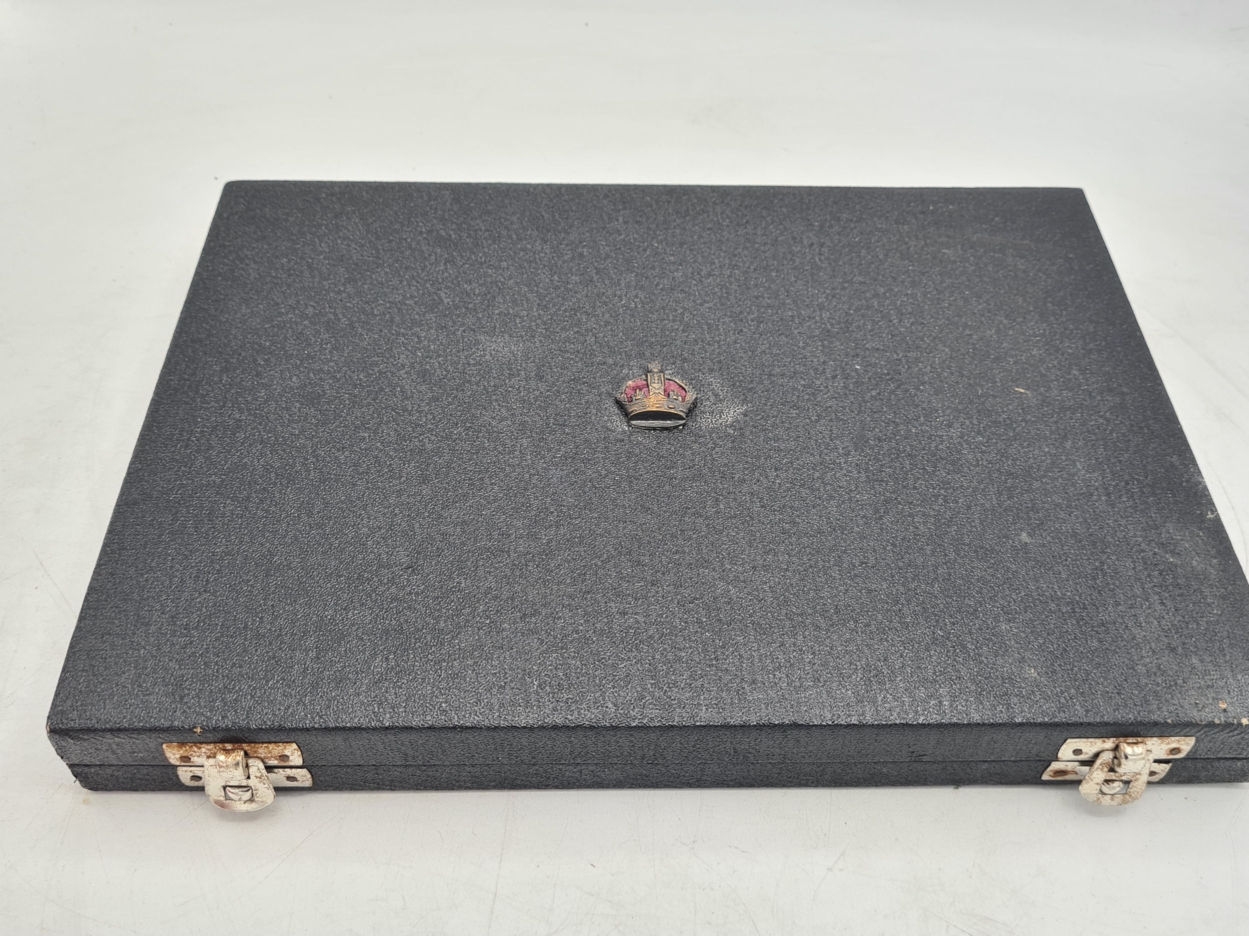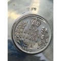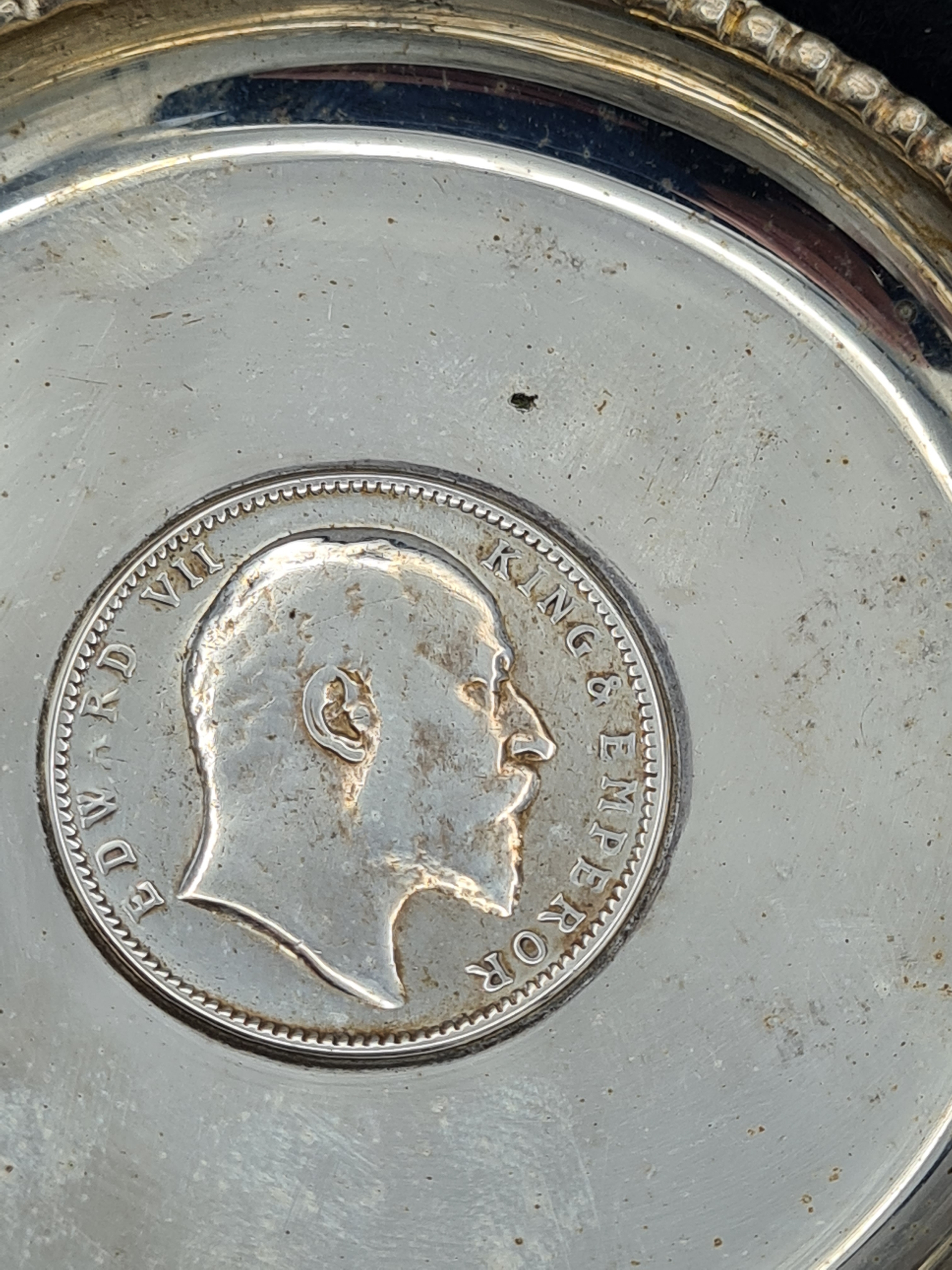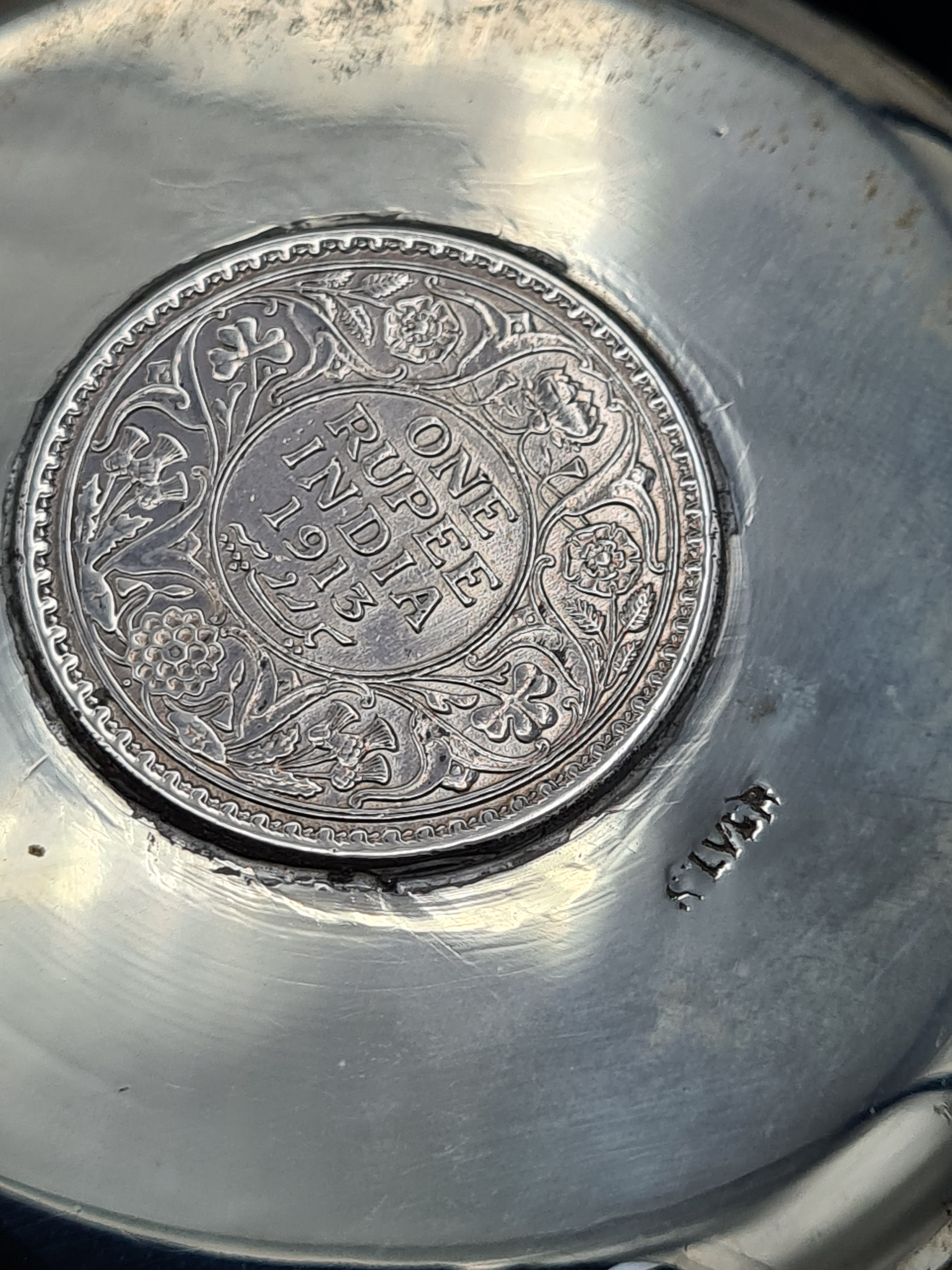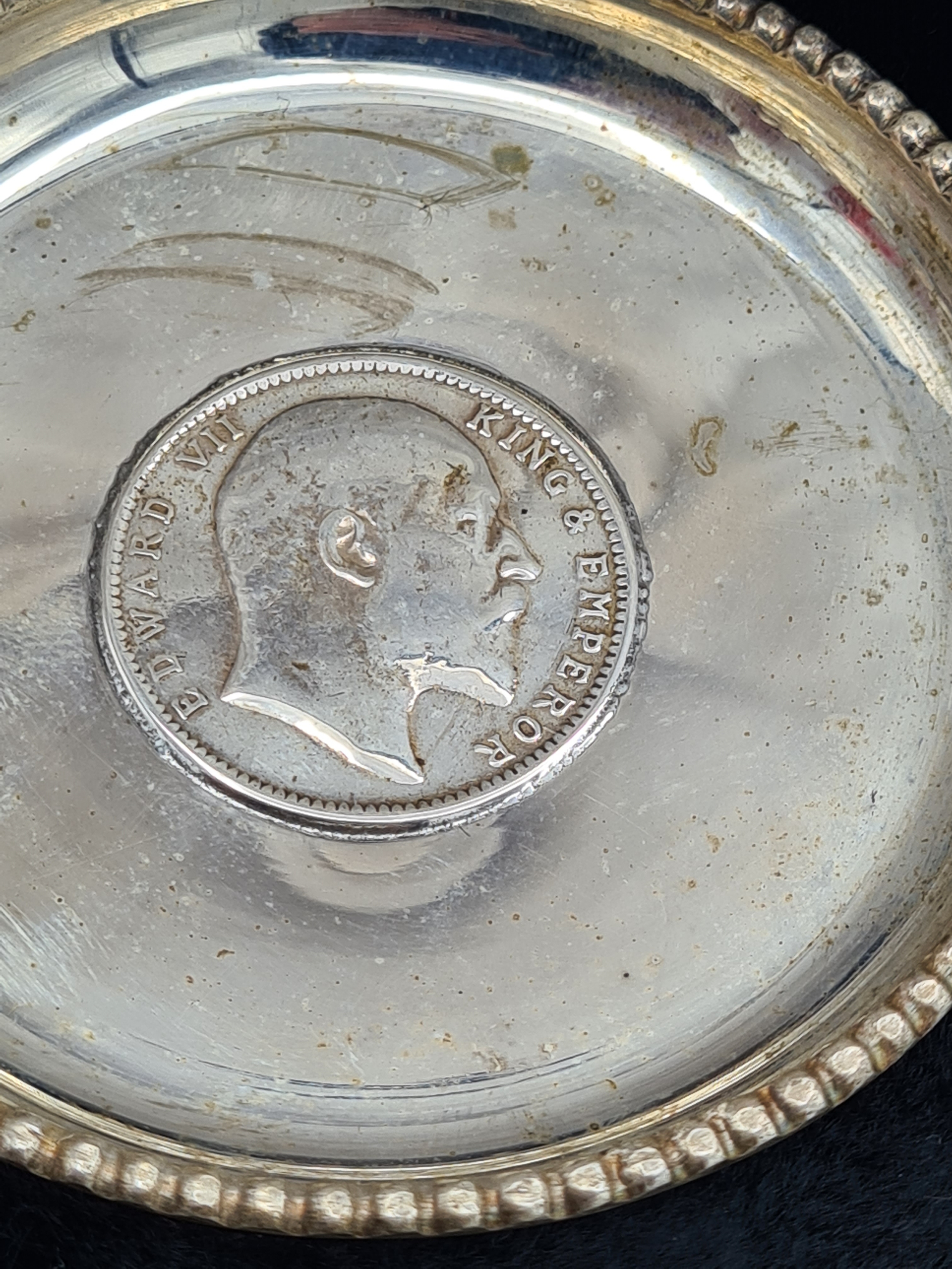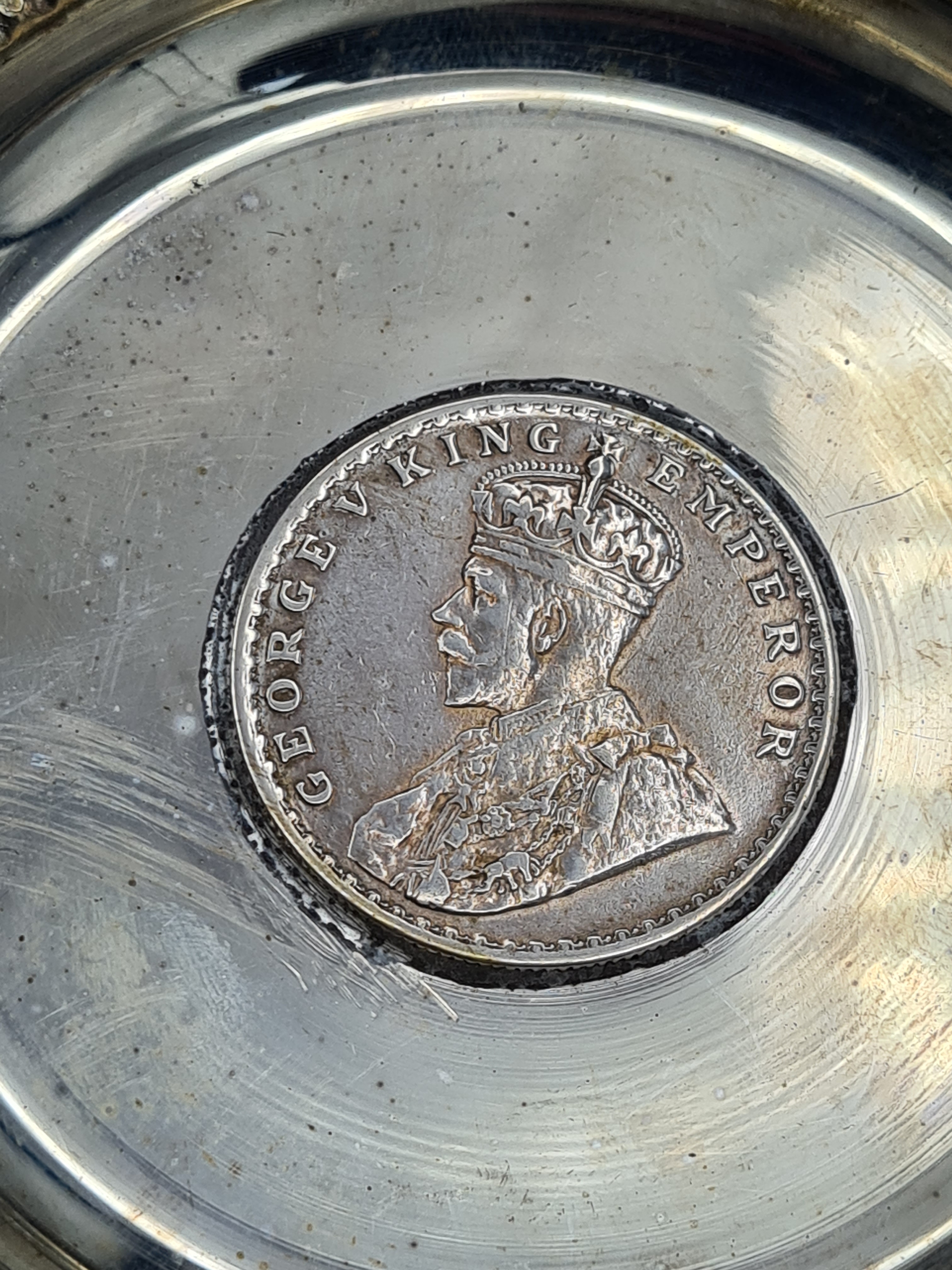 A presentation set of 6x 1 Indian Rupee Coin Silver Dishes, Each dish has an original coin in the middle and measures 8cm in diameter by 1 cm high. Dishes are all marked Silver and include coin years 1876, 1877, 1904, 1906, 1913 & 1917. The box measures 30cm x 21cm x3cm and has a red embossed crown on the lid.