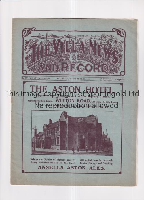 ASTON VILLA Programme for the home League match v Notts. County 26/9/1925, staple removed. Generally good