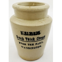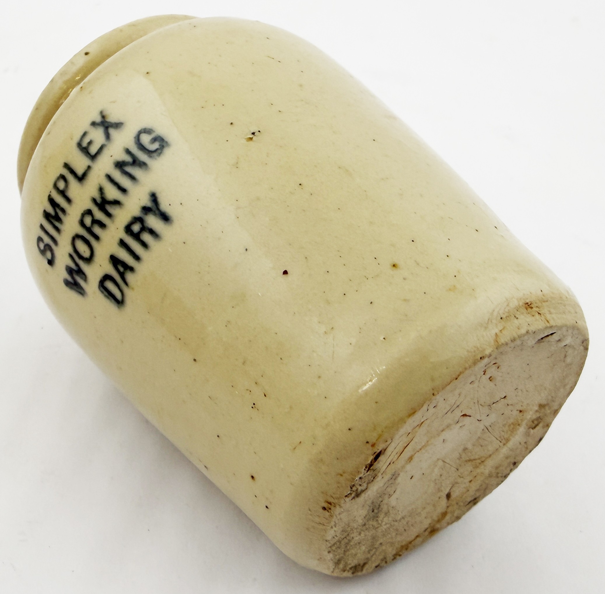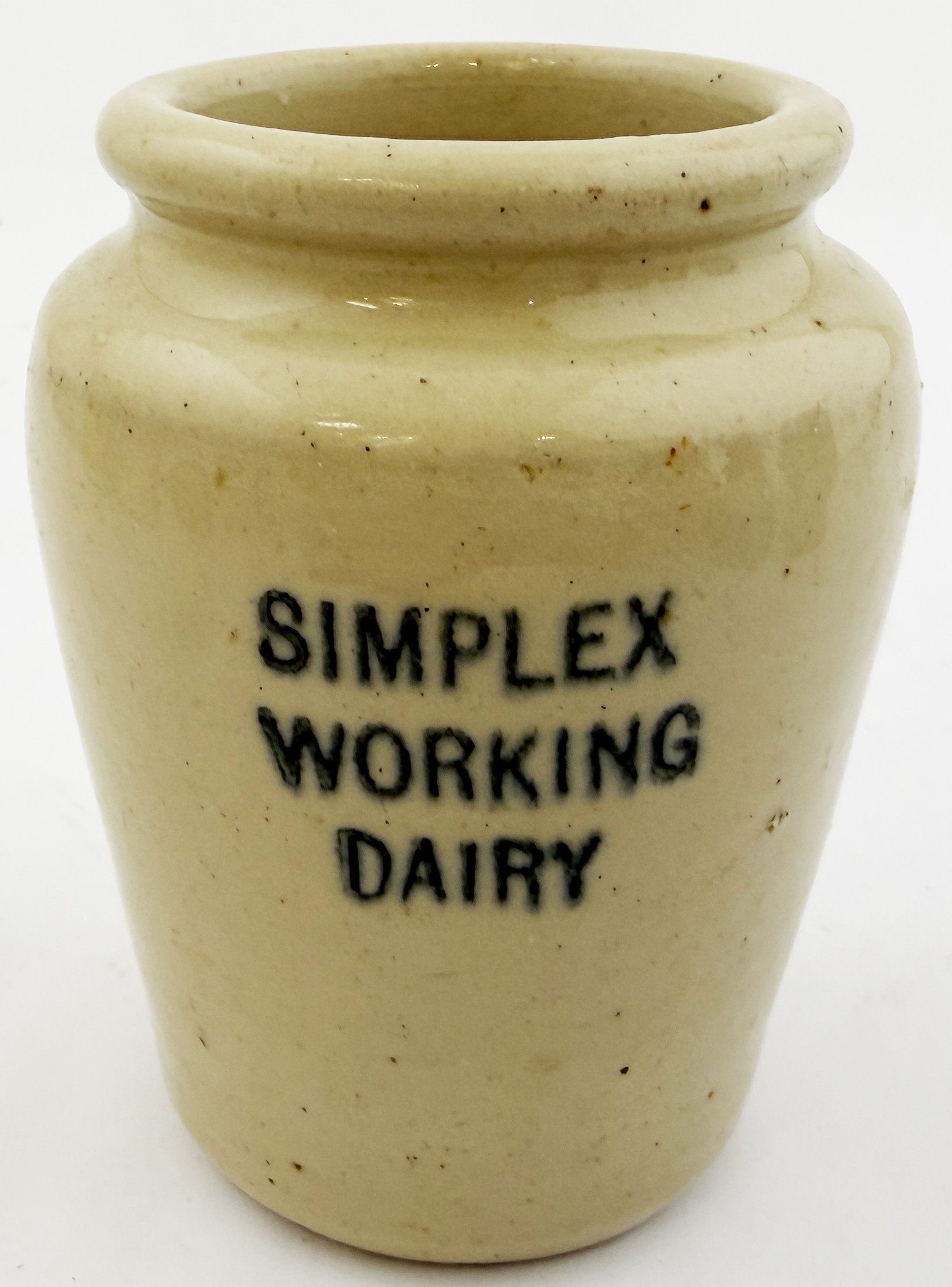 SIMPLEX DAIRY STOKE-ON-TRENT CREAM POT? 3.5ins. All white pot simply black printed SIMPLEX/WORKING/ DAIRY. Dairy was based in Stoke-on Trent. Hugh Davidson collection. Excellent condition.