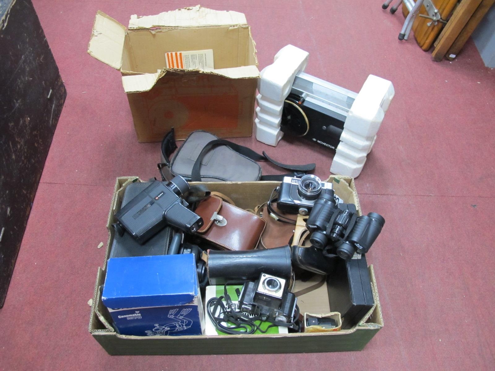 Minolta - 16 MG Camera and Accessories, in fitted case, Canon M70 Conomatic, Konica EE-Matic, Nikon TW zoom with varied camera equipment, two pairs of binoculars:- One Box plus one, and a Movector 888 TYP S206