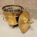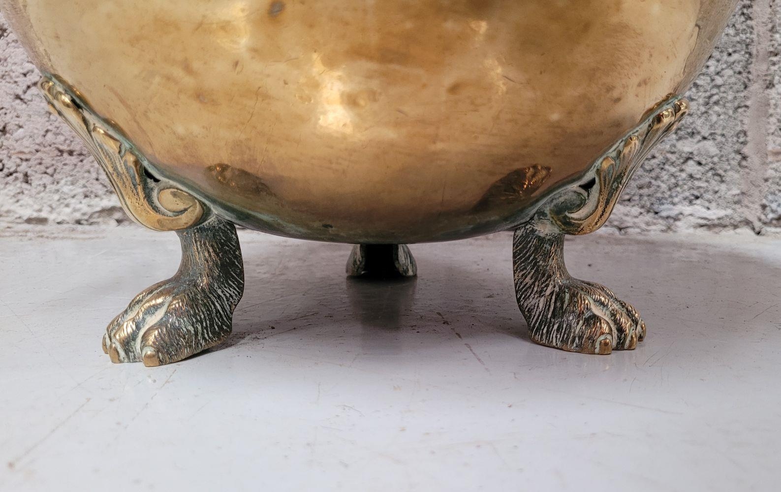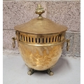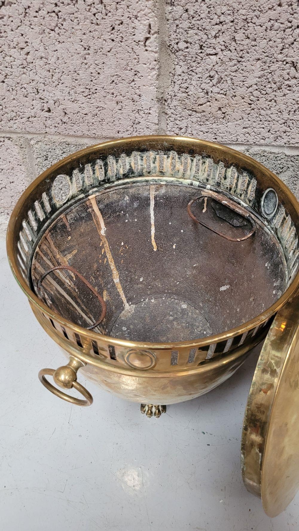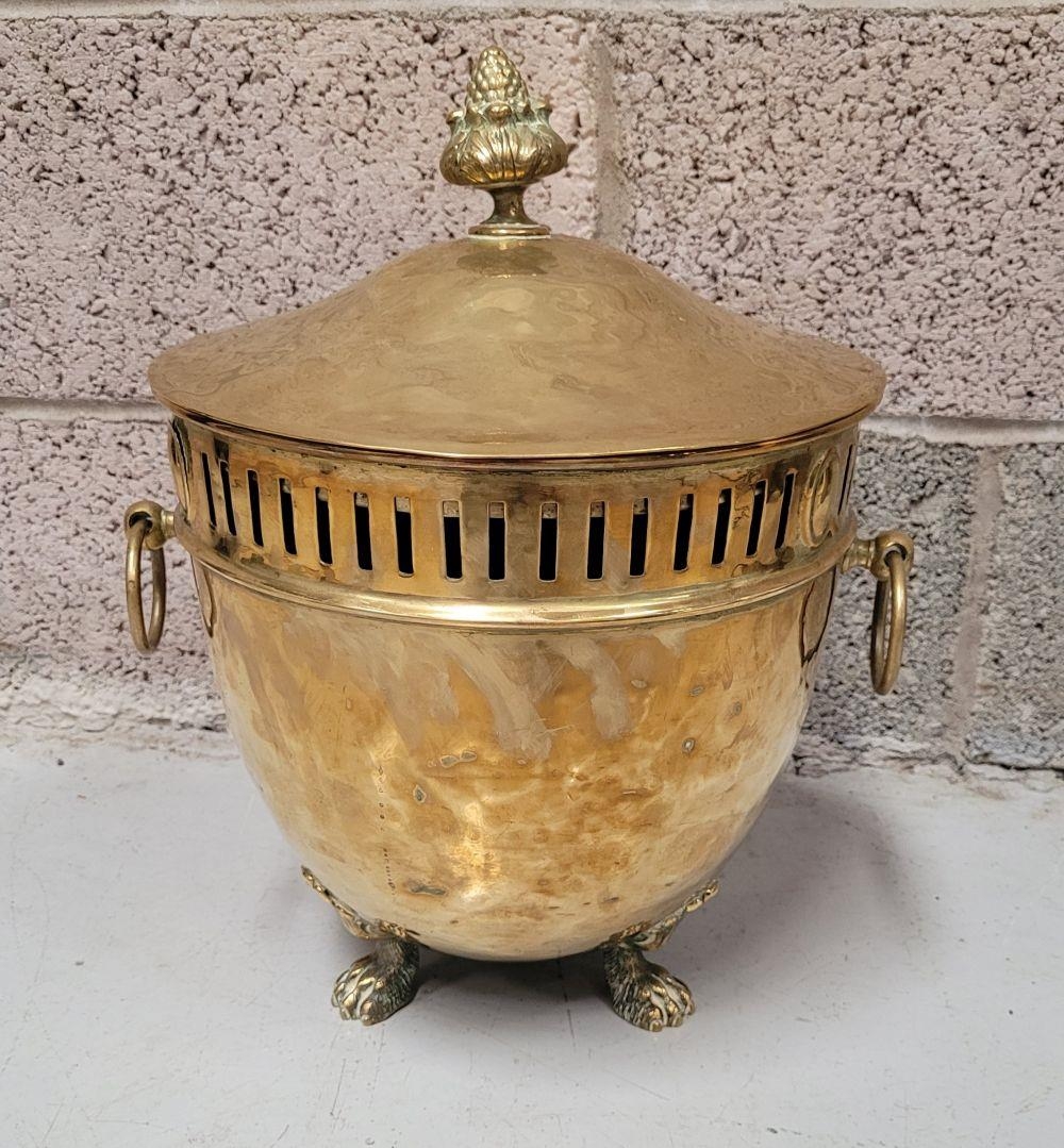A LATE 19TH / EARLY 20TH CENTURY BRASS COAL / FIRE FUEL BUCKET, with a finial topped lid, pierced detail to the body and a pair of ring handles on each side. To the interior is the original liner, all resting on three lion paw feet with a foliage knee. A lovely piece of fire furniture, in fair/good condition – the item is a little dented from use/age and the finial to the top sits a little askew – but it does not detract from what is a lovely brass piece, great detail in the feet in particular. Dimensions: 42 x 35cm (H x W).