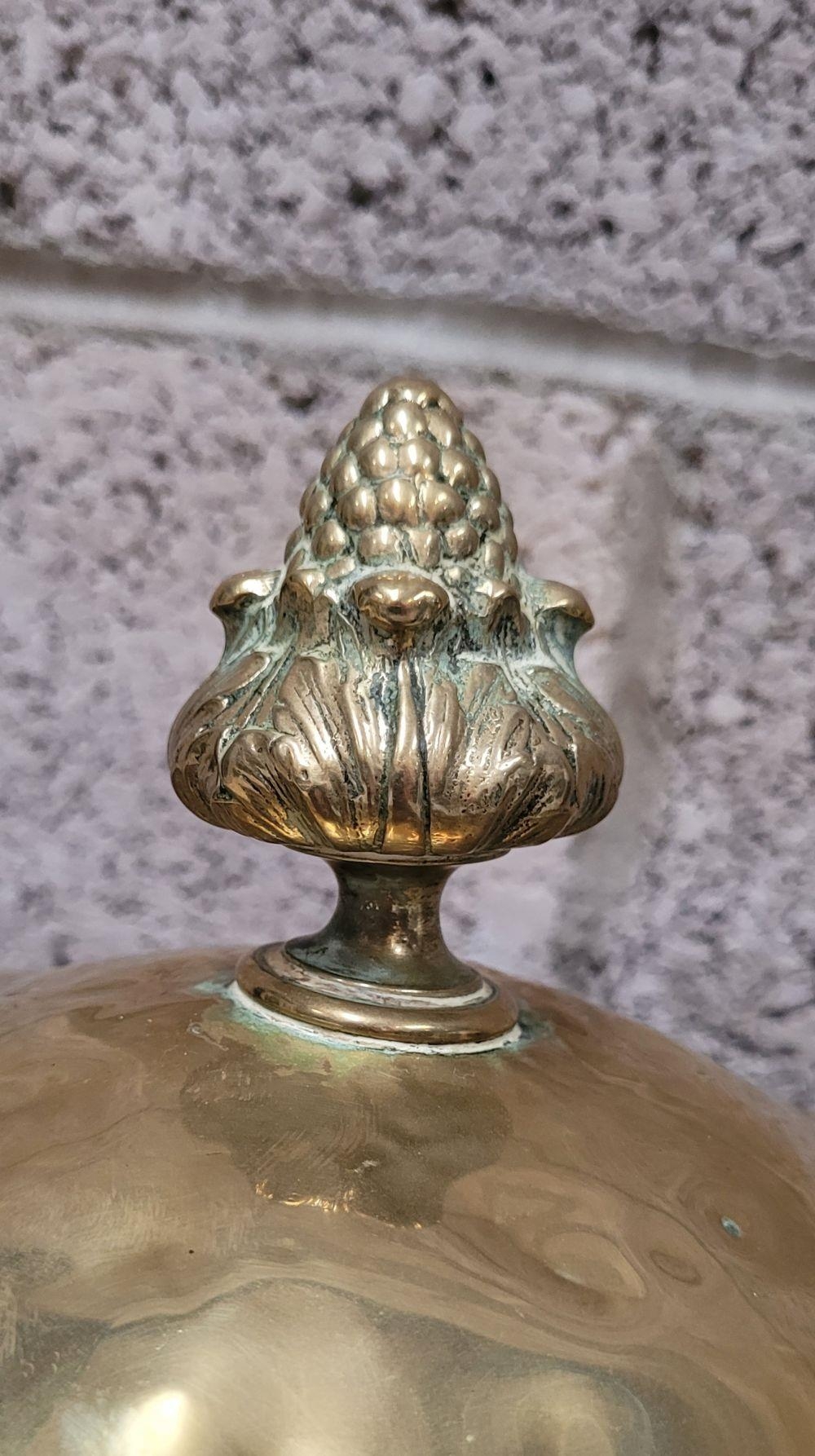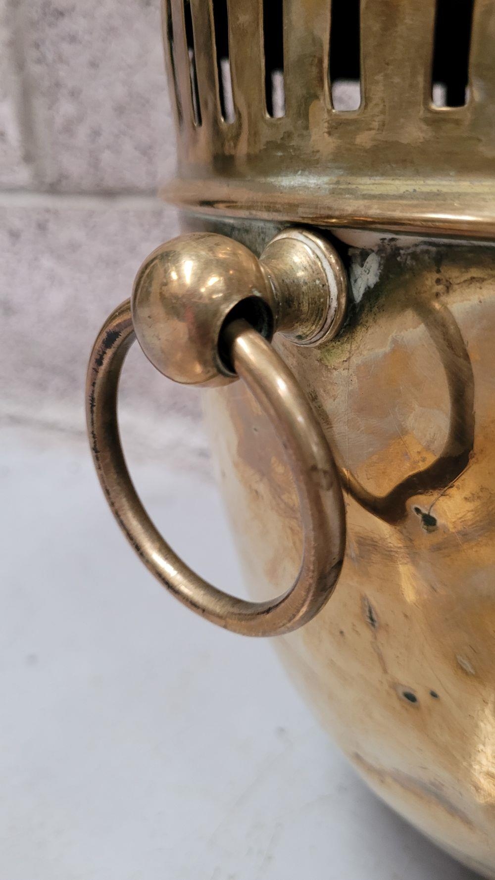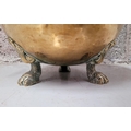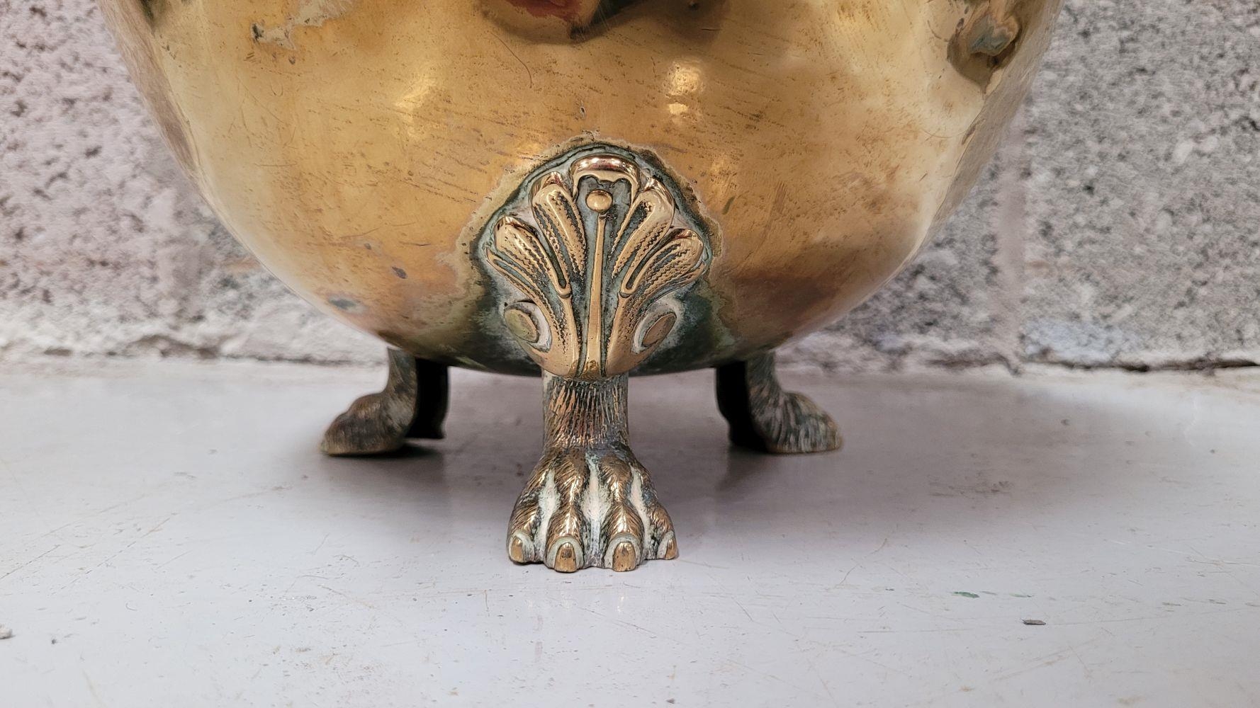 A LATE 19TH / EARLY 20TH CENTURY BRASS COAL / FIRE FUEL BUCKET, with a finial topped lid, pierced detail to the body and a pair of ring handles on each side. To the interior is the original liner, all resting on three lion paw feet with a foliage knee. A lovely piece of fire furniture, in fair/good condition – the item is a little dented from use/age and the finial to the top sits a little askew – but it does not detract from what is a lovely brass piece, great detail in the feet in particular. Dimensions: 42 x 35cm (H x W).
