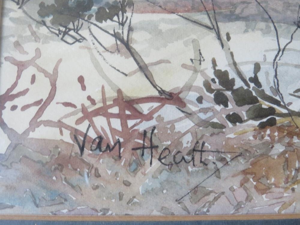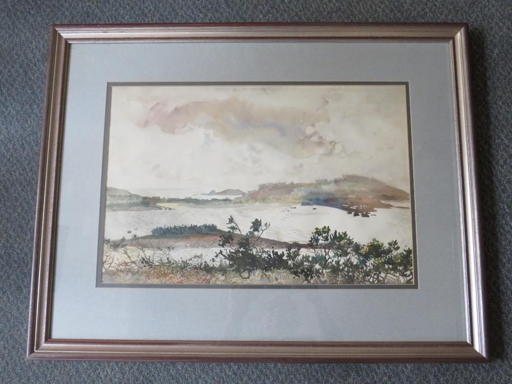 NAN HEATH (XX). Scilly Isles scene, 'High Town from Golf Course, Porth Loo St Mary's, Isles of Scilly', see verso, signed lower left, watercolour, framed and glazed, 36 x 54 cm