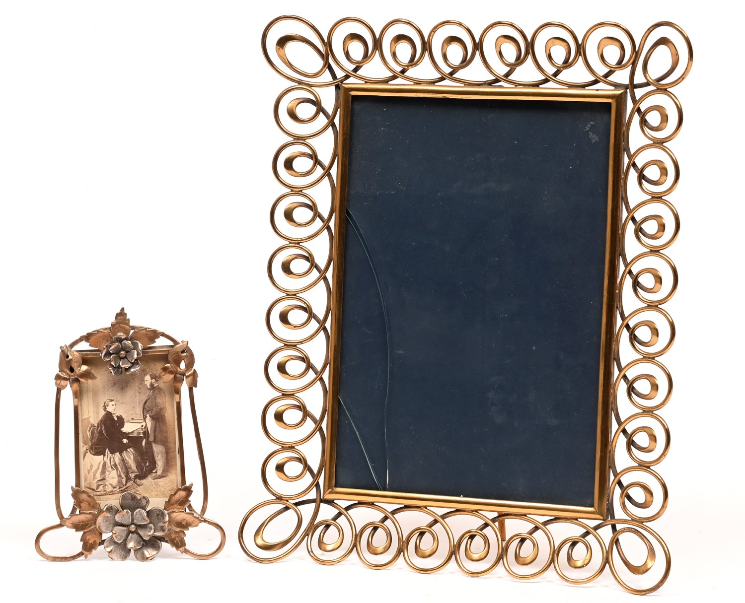 An Edwardian brass wirework photograph frame, 34 x 24cm and a smaller, contemporary Art Nouveau example, the frame mounted with flowers, 16 x 12cm (2)