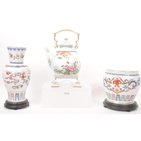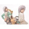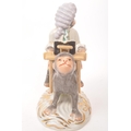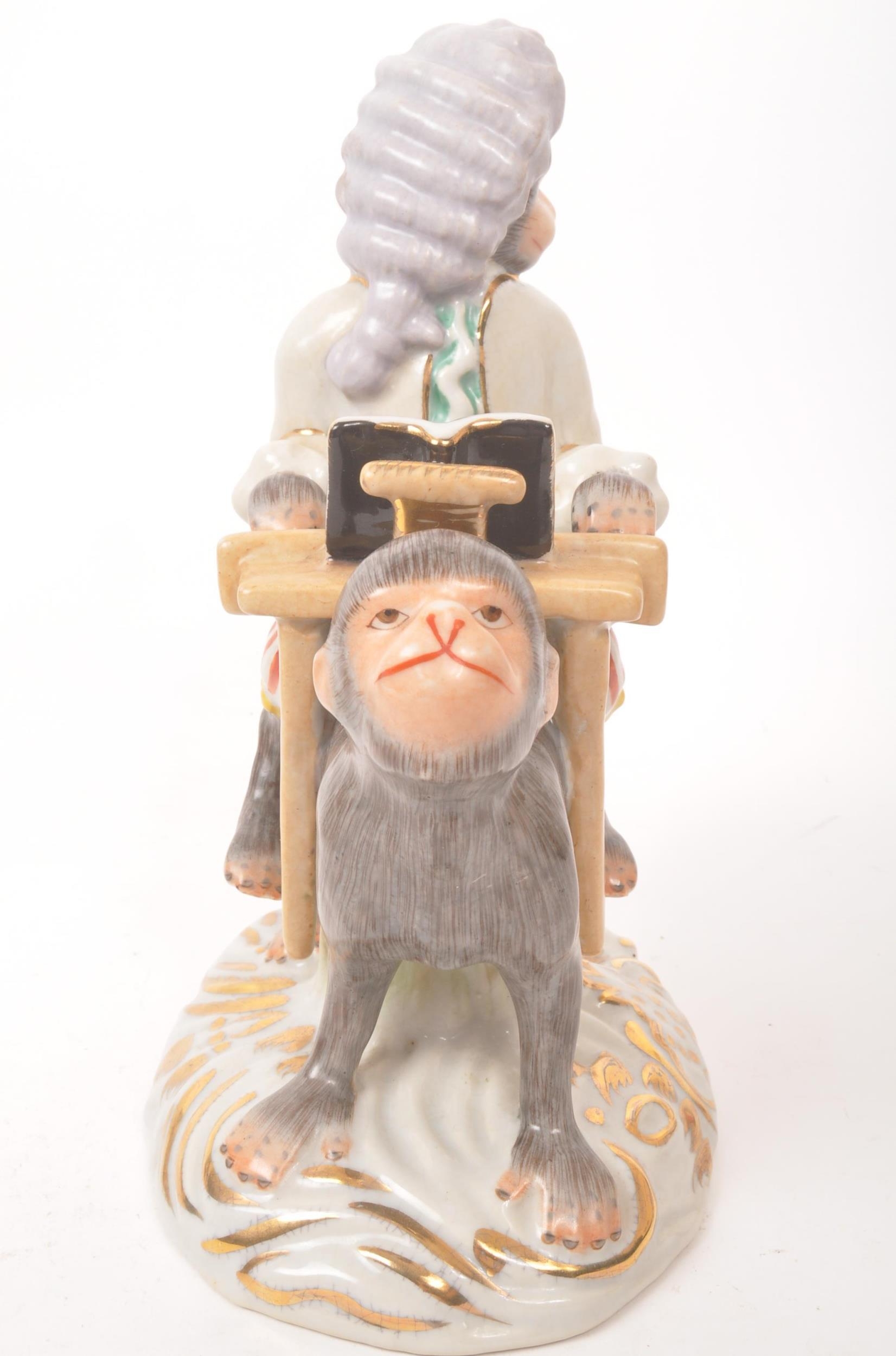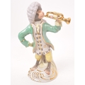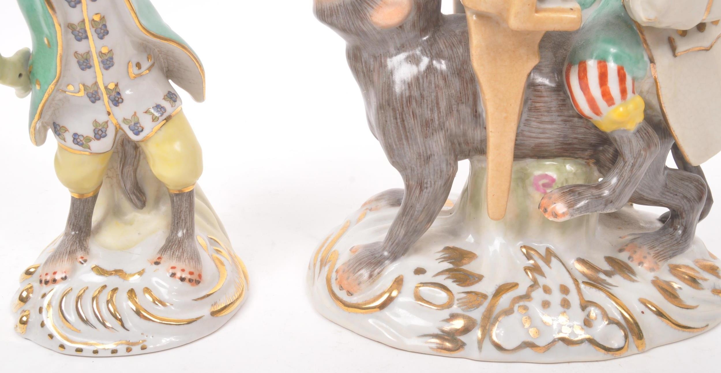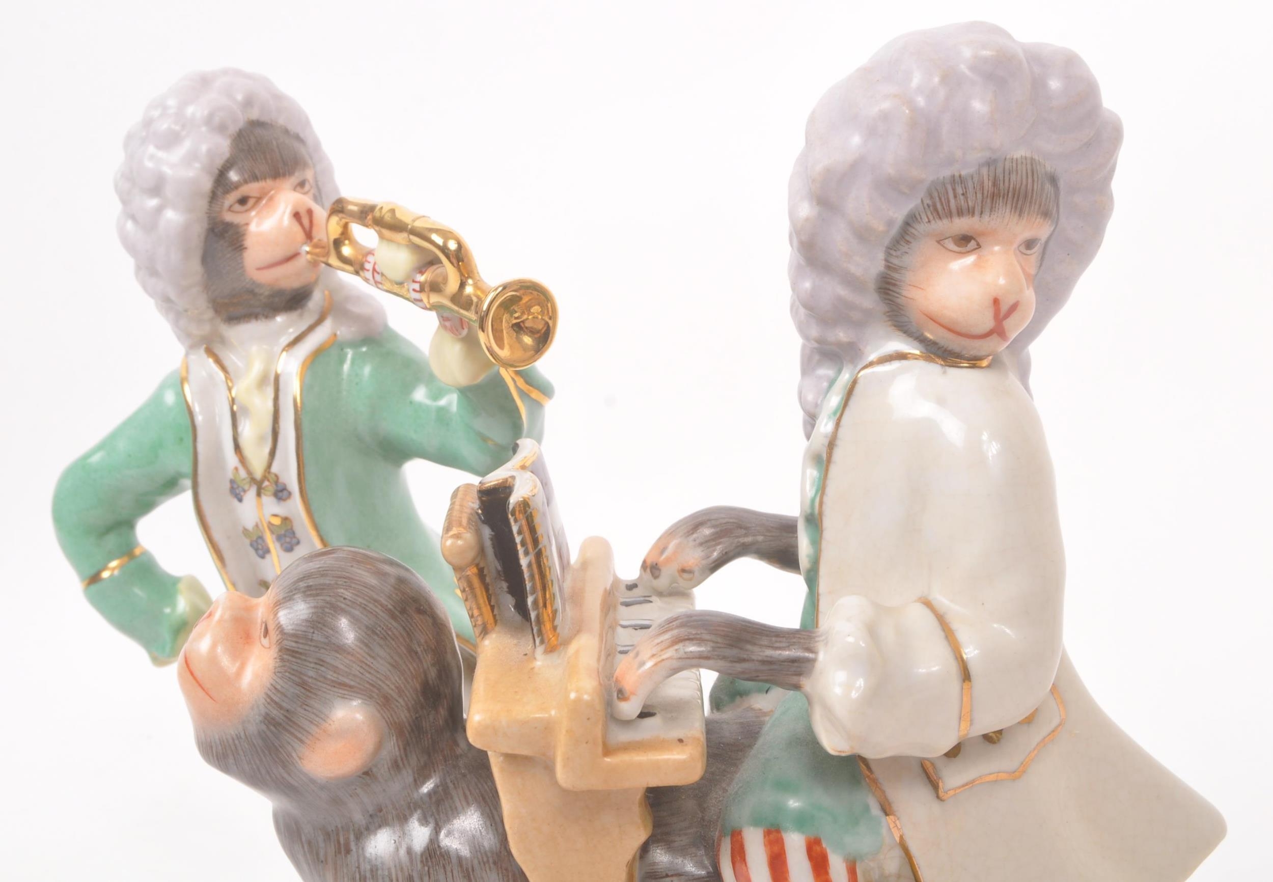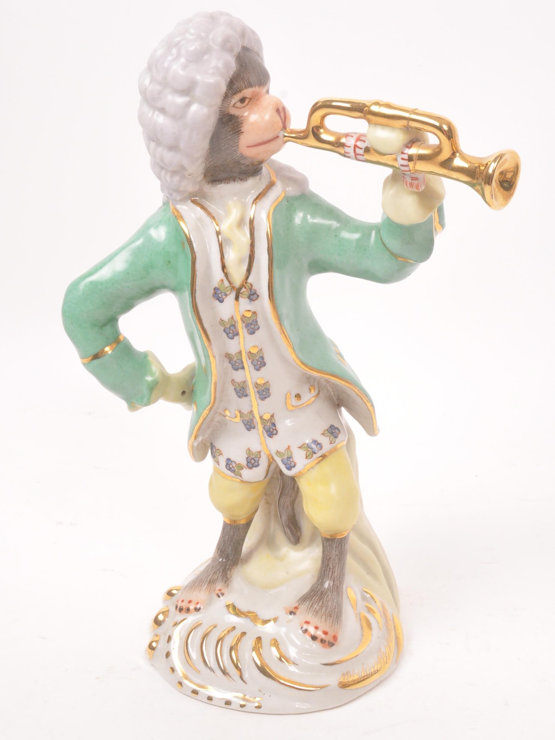 Two 20th century Meissen manner porcelain monkey figures. One figure depicting a monkey stood, with trumpet to mouth, the other playing a piano riding atop a monkey. Largest measures approx. 28cm tall.