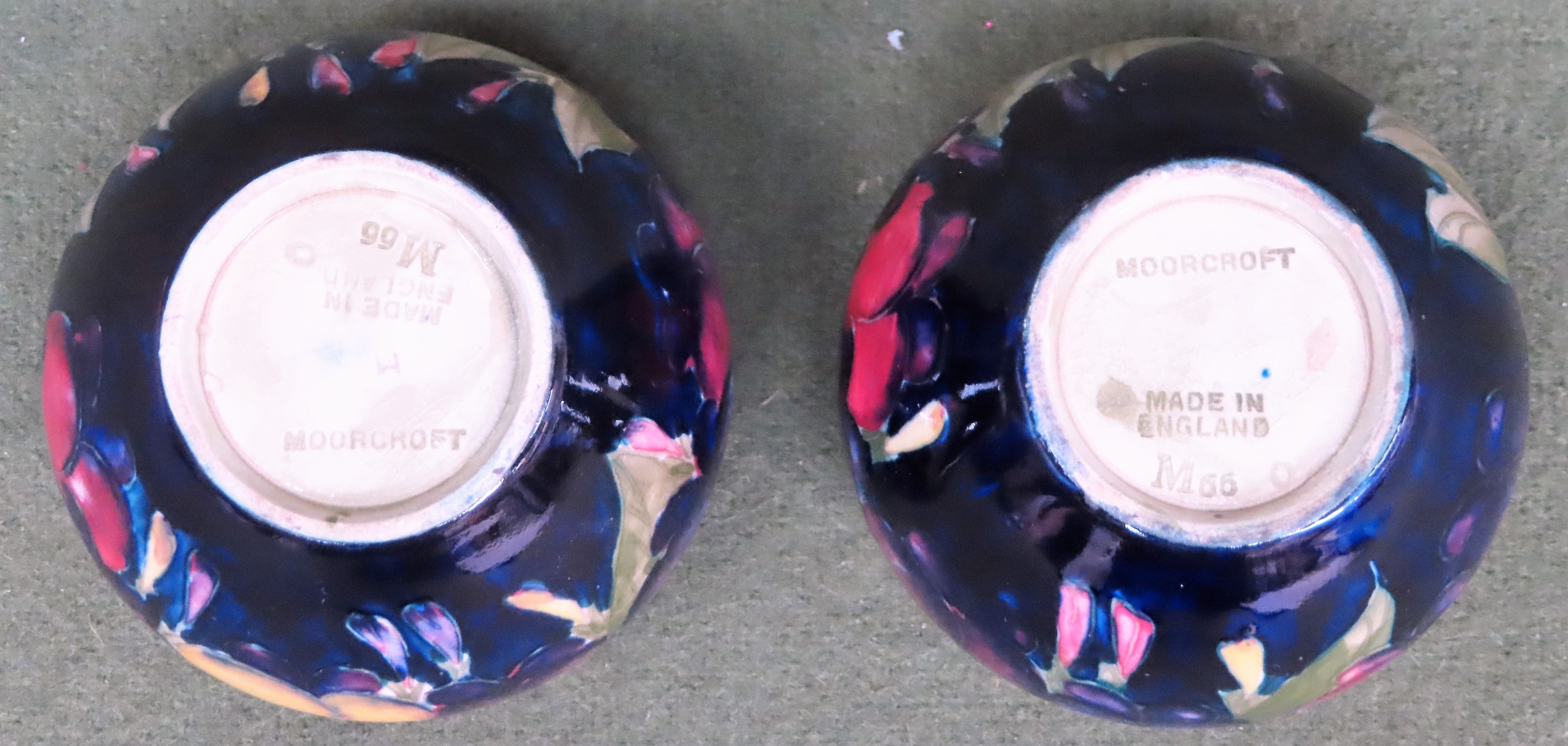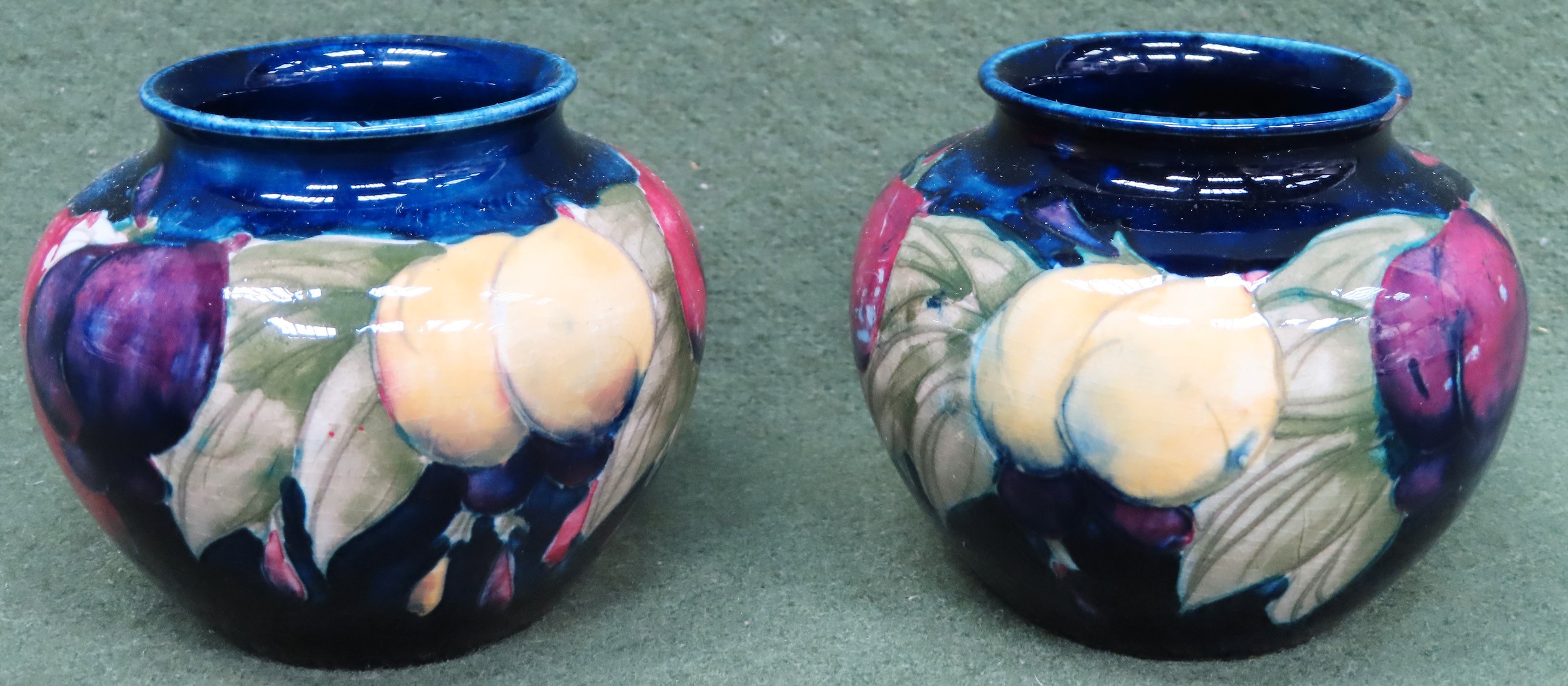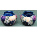 Early 20th century Pair of Moorcroft Wisteria pattern glazed ceramic vases, stamped M55. Approx. 7cm High